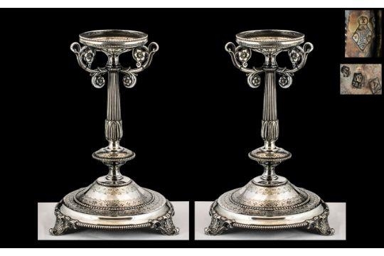 Pair of Early Victorian Heavy Cast Silver Plated Tazzas, the matching pair, of heavy gauge silver plate, being very decorative and ornate and of wonderful quality; supported on scroll feet, each is 9 inches (22.5cms) high and bears a kite mark and maker's mark TB&S (lacking glass bowls) (2)