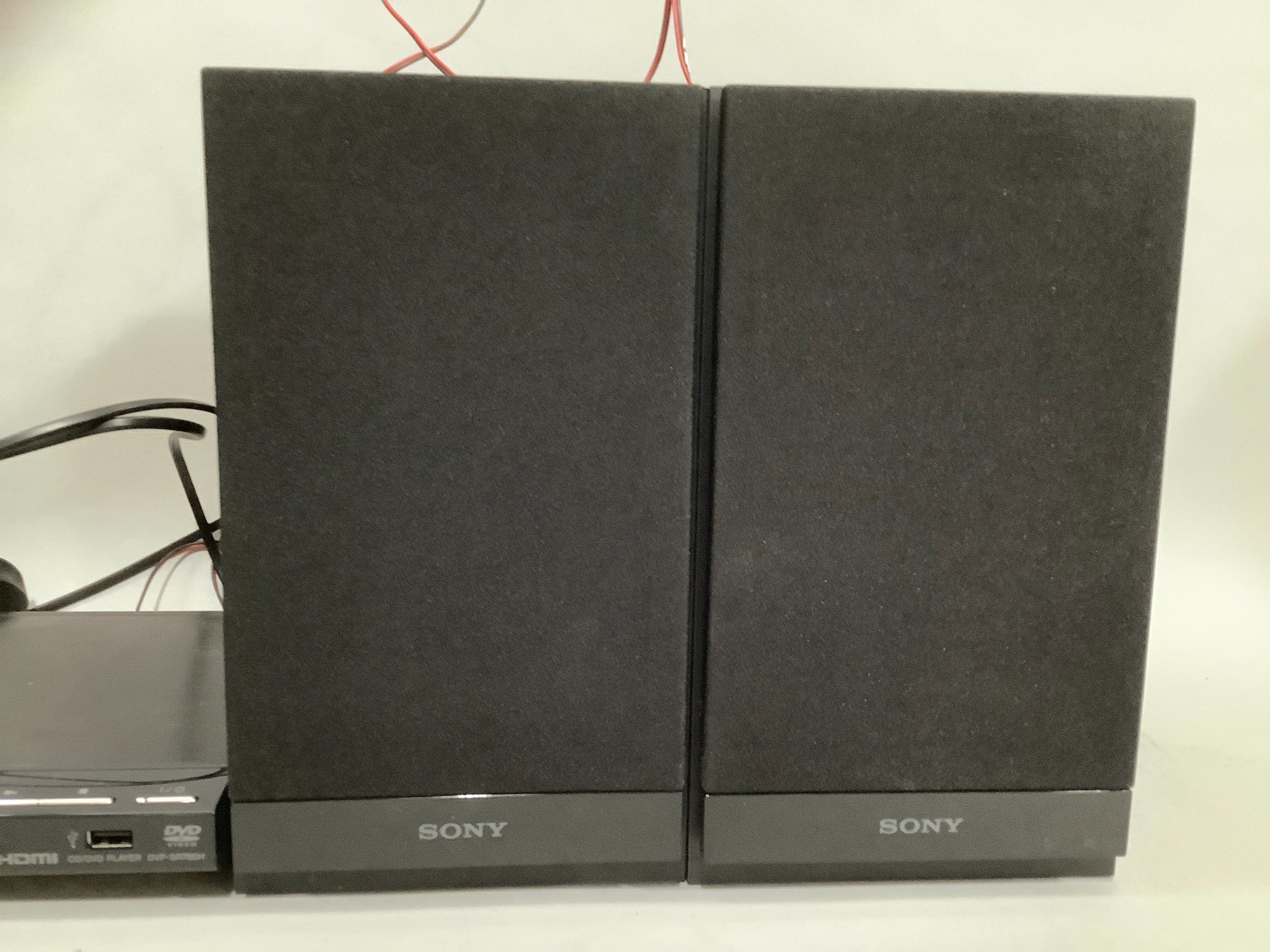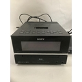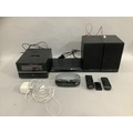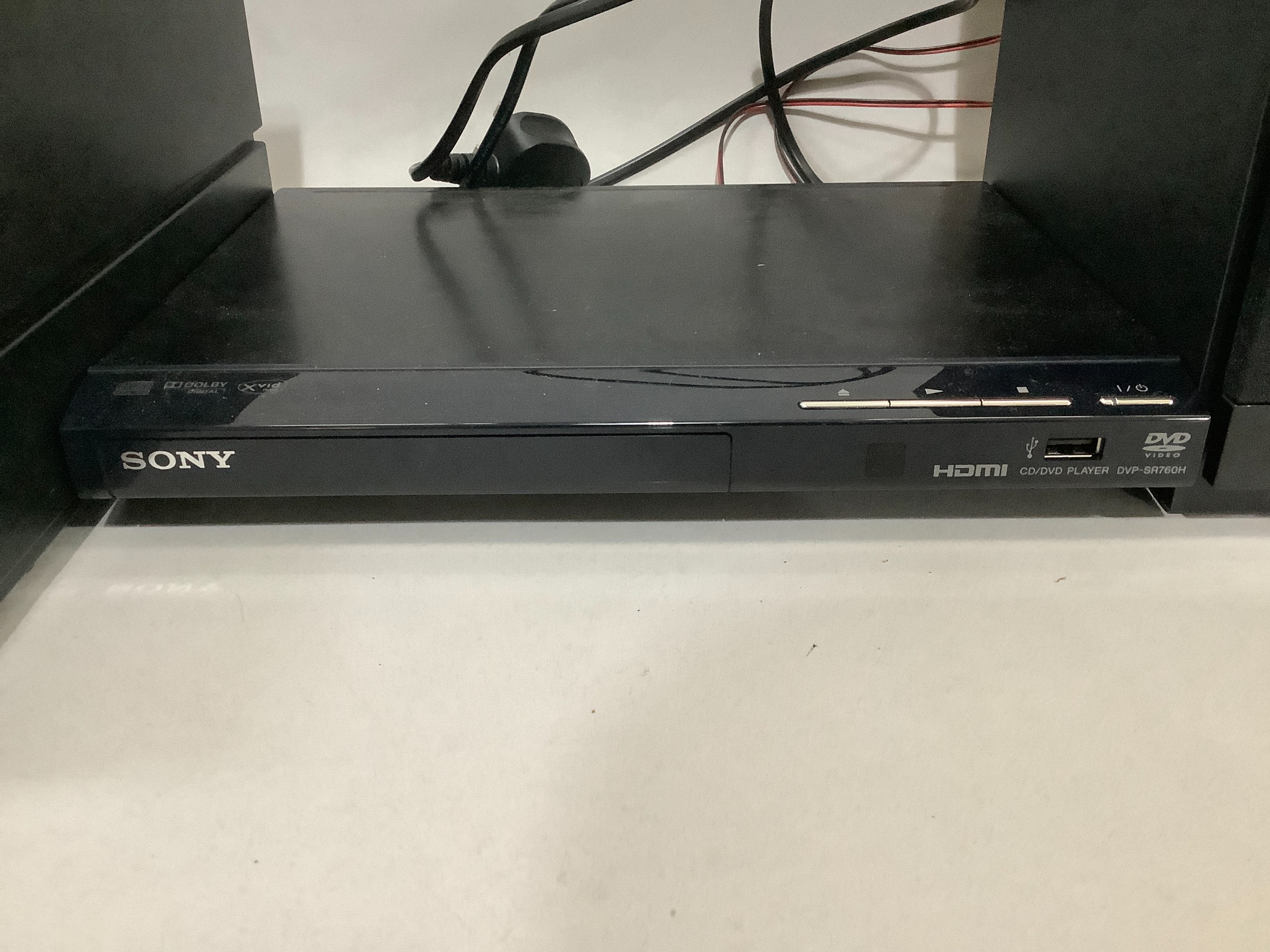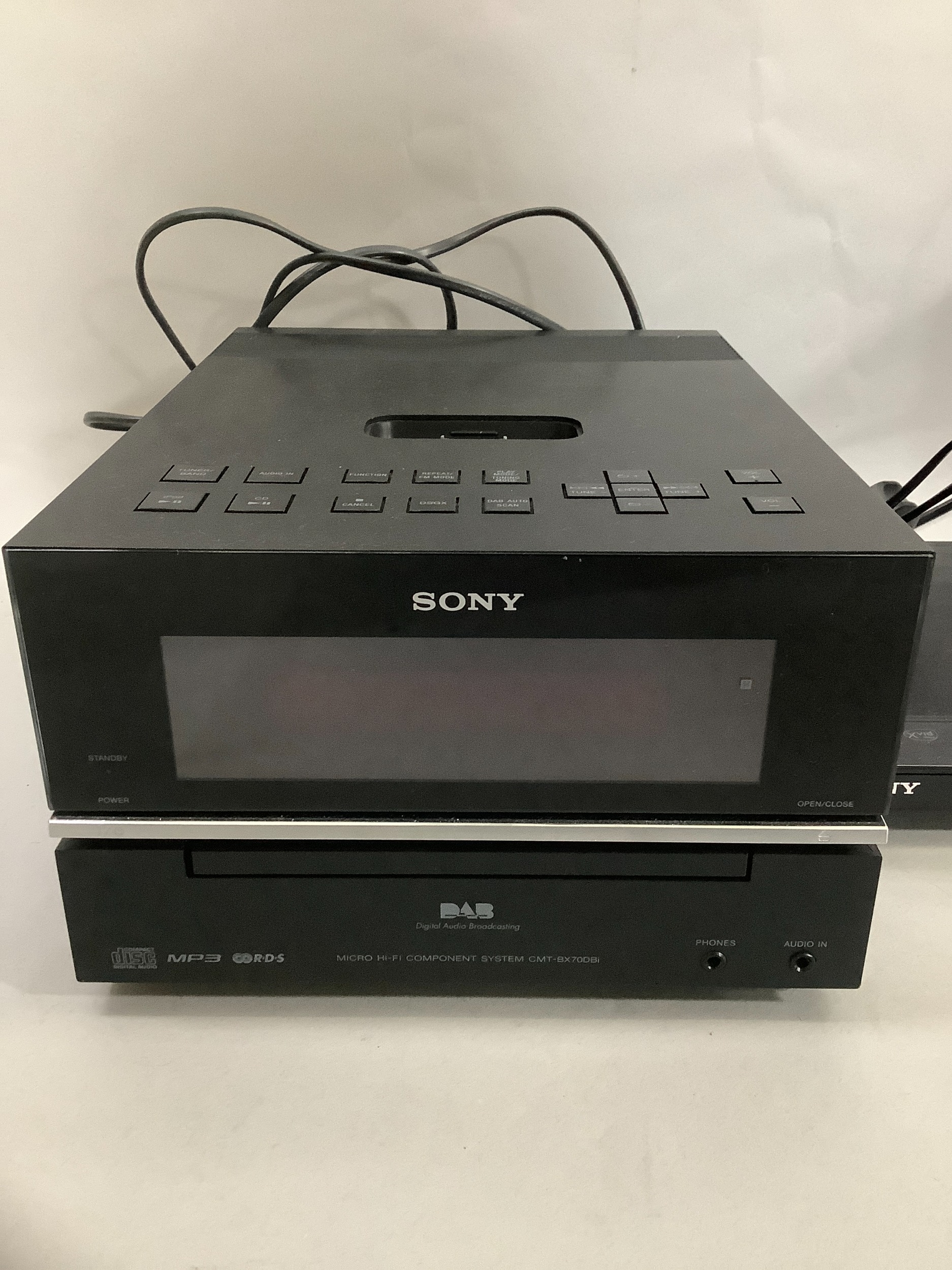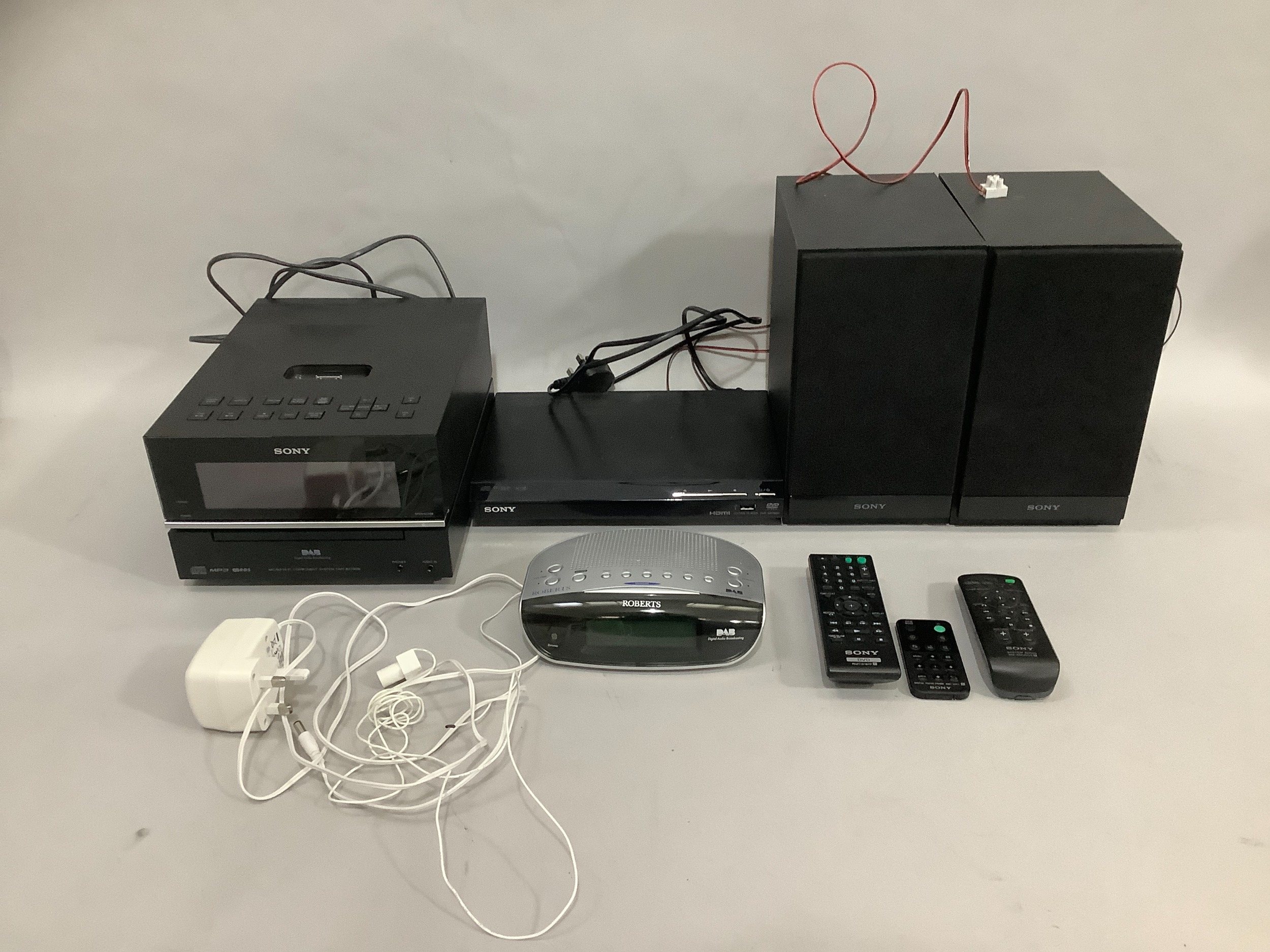 A Sony Micro Hi-Fi Component System CMT-BX07DBI with disc player, docking station, pair of speakers together with a DVD player, remote controls and a Roberts DAB radio alarm