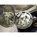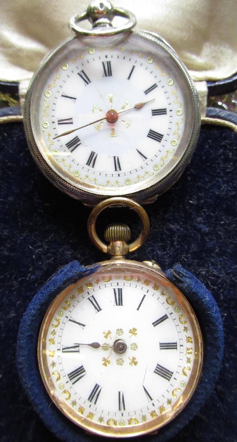 Late C19th ladies Swiss open face keyless pocket watch, with hinged bezel, case back and No. 103076, Swiss pin set keyless cylinder movement in period black leather silk and cotton lied case together with swiss, late C19th ladies silver cased open faced key wound pocket watch. Hinged bezel, case back and Quevette case decorated with Ivy leaves, Swiss key wound and set cylinder movement case back stamped .935 and No 122170 (2)
