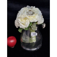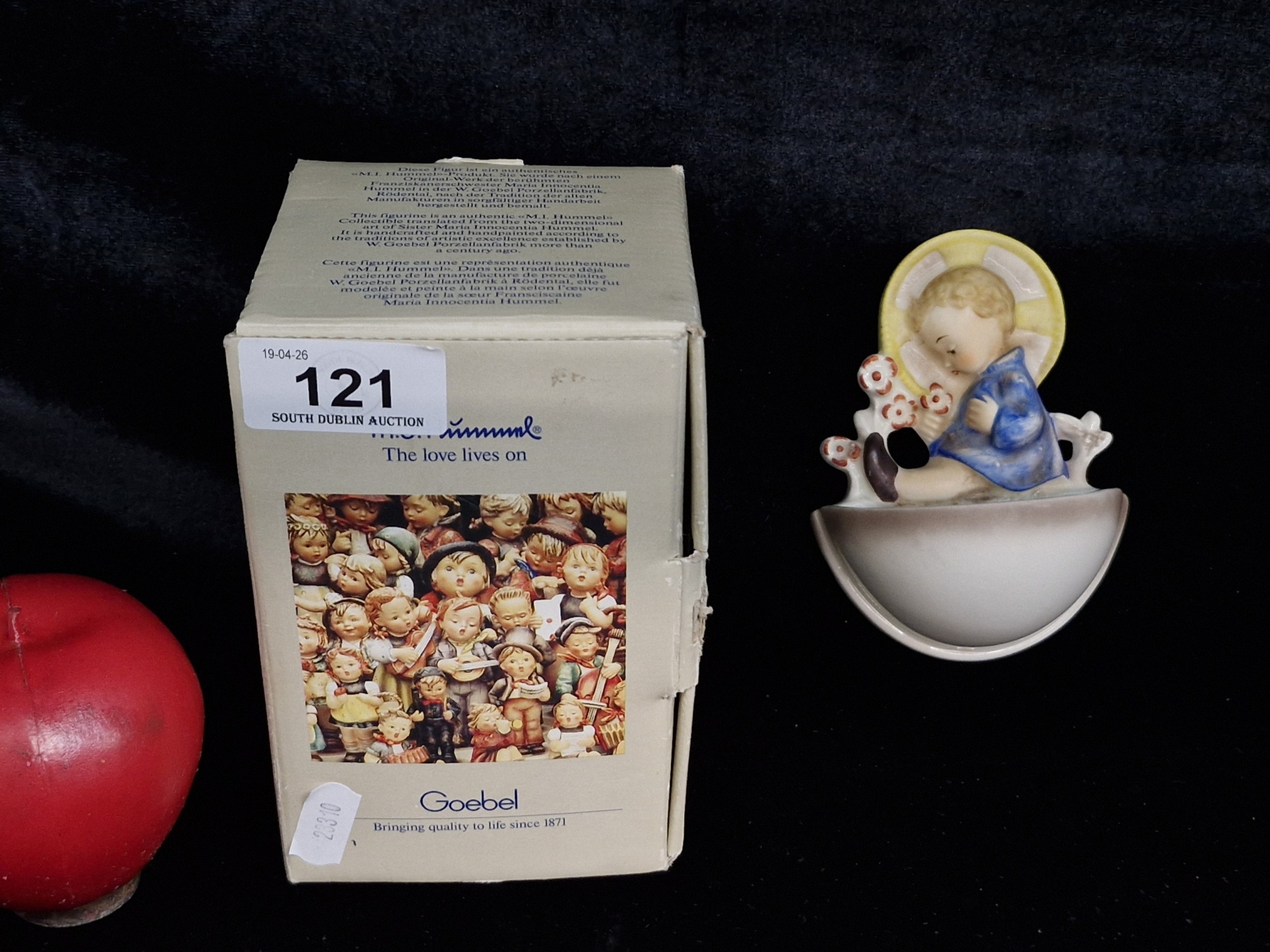 A vintage (1987 ) Goebel Hummel Holy Water Font with the Child with Flowers design. Features a hand painted porcelain angel sitting next to a bouquet of flowers attached to a shallow bowl for holy water. In excellent condition in original box.
