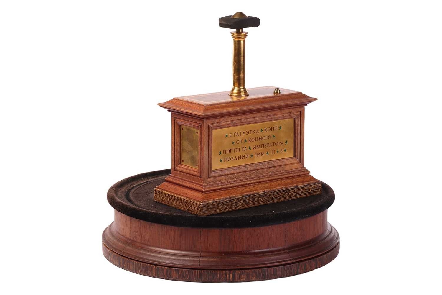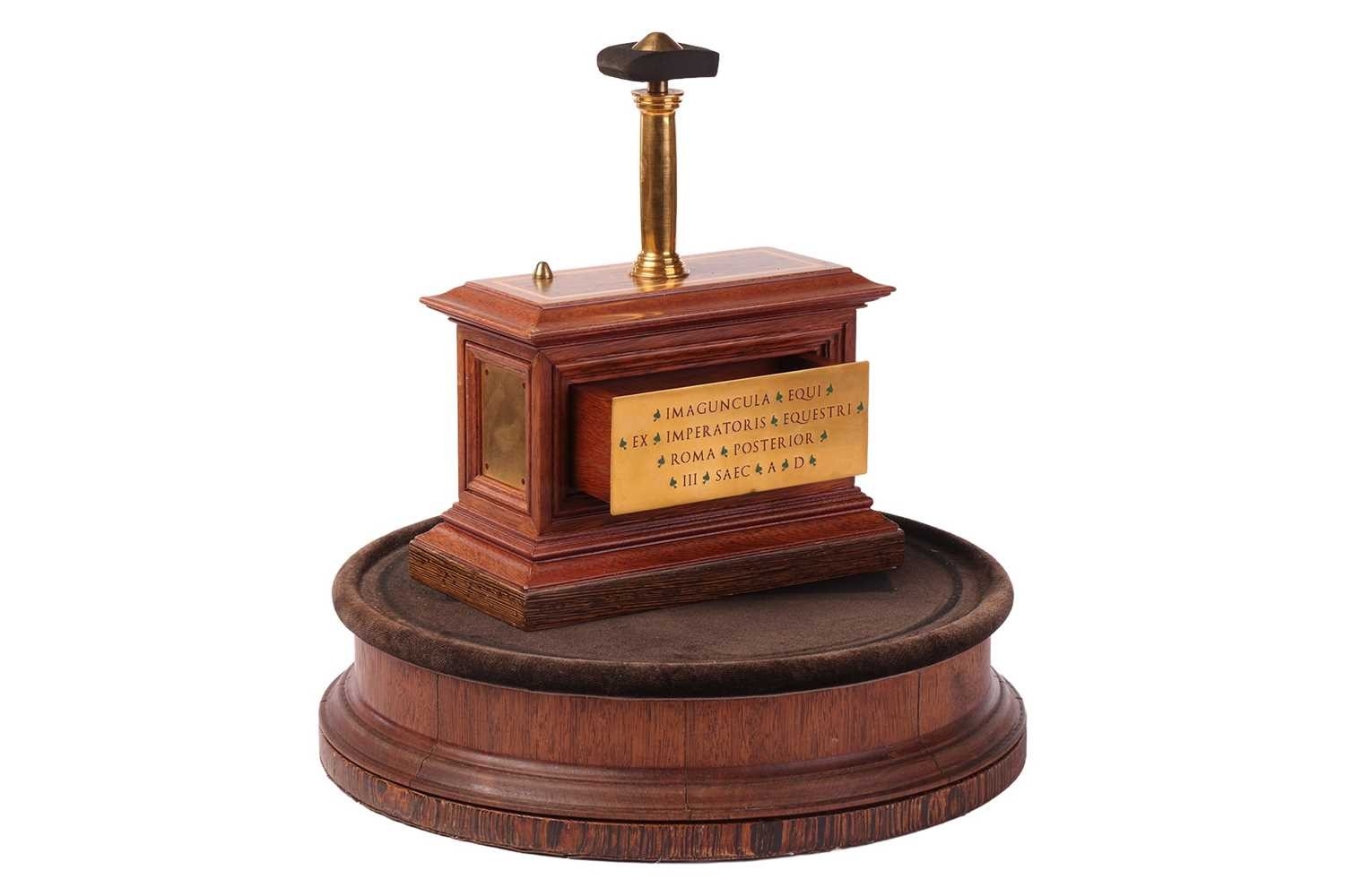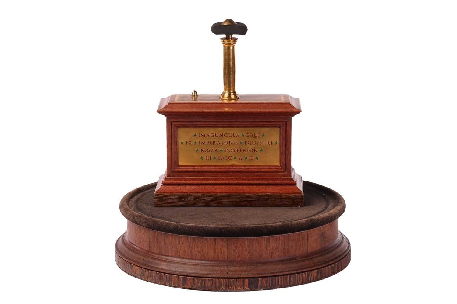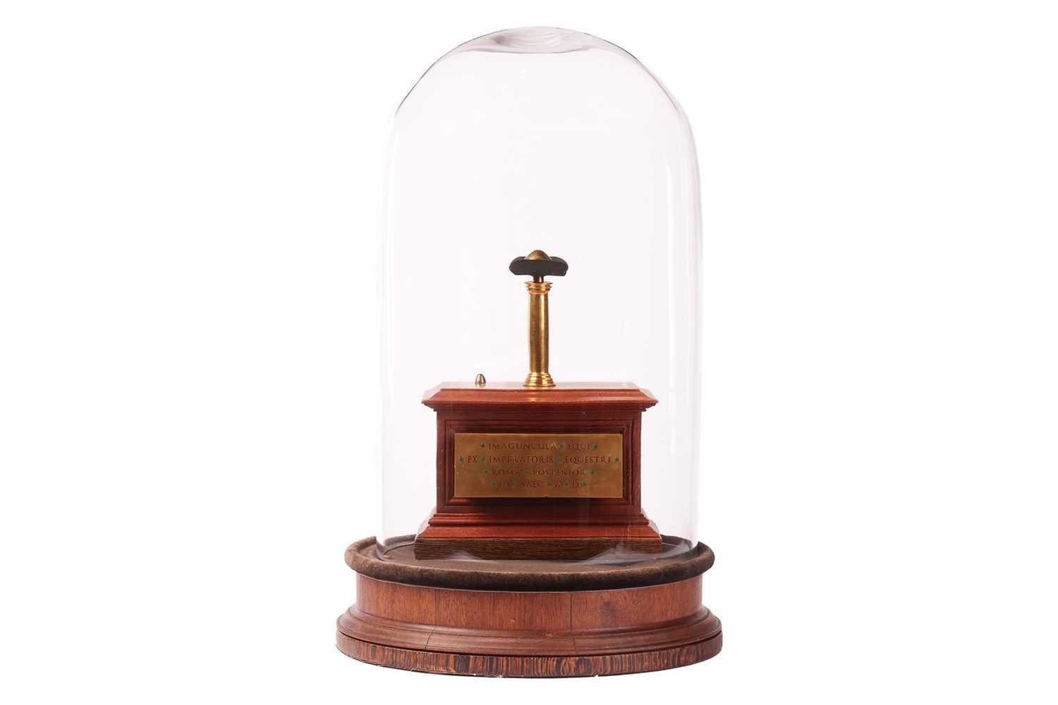 A 19th-century display stand and dome, with internal display plinth, bearing a plaque with Latin text, translating roughly as 'Horse of the Emperor, Rome, Later 3rd Century', 54 cm high.