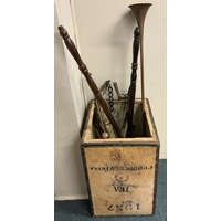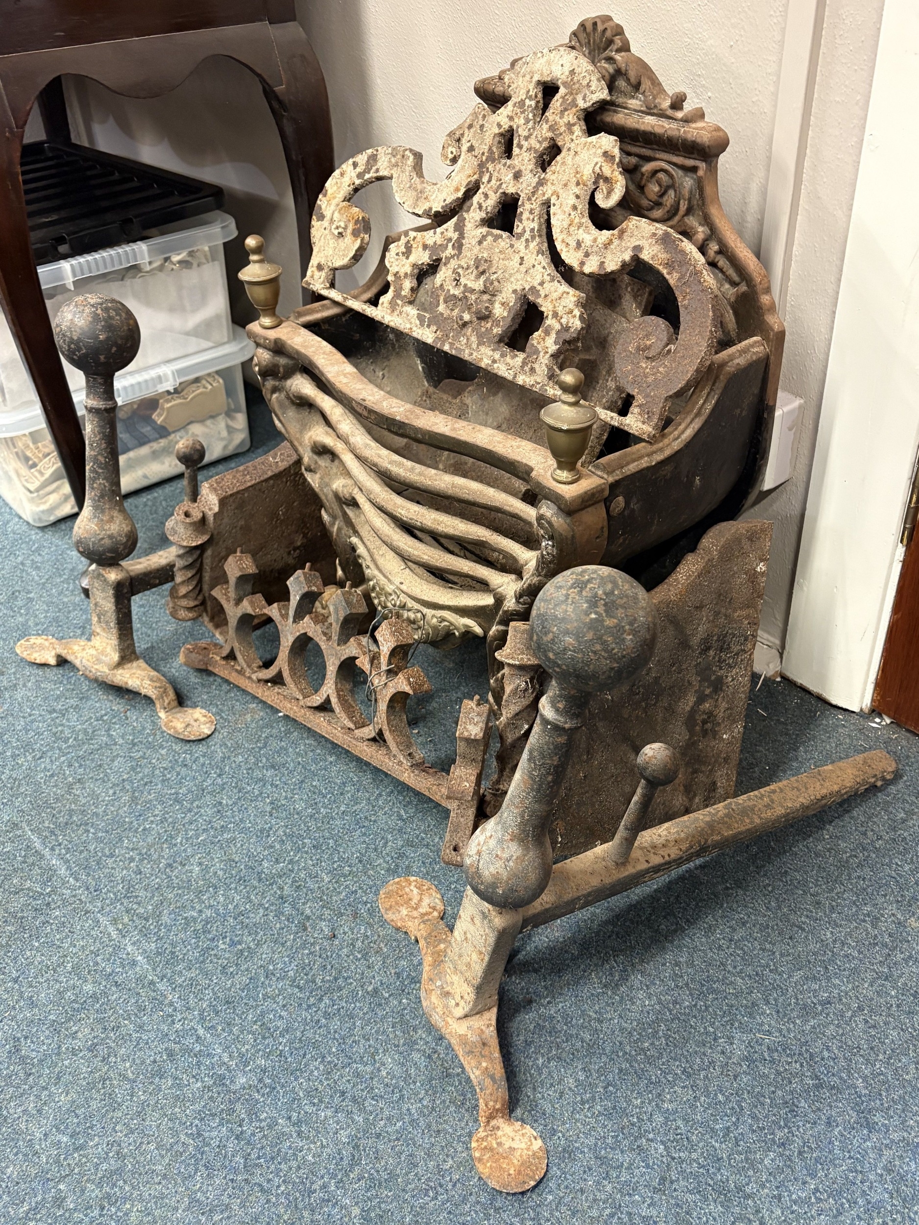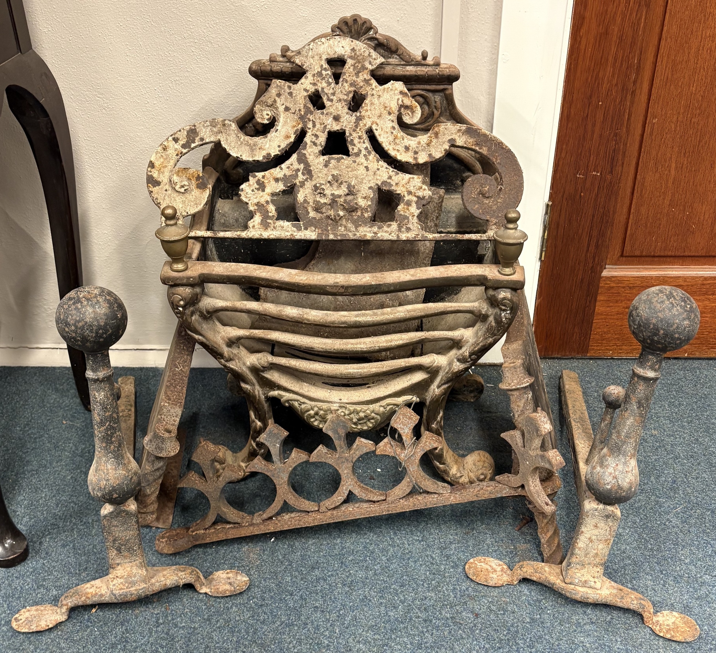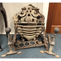 An Antique cast iron and brass fire basket together with a pair of andirons etc. Est. £20 - £30.