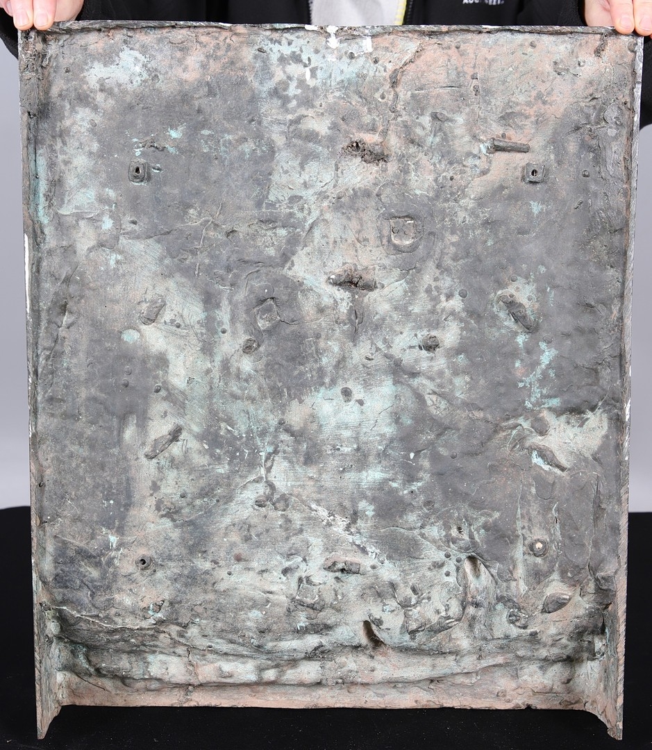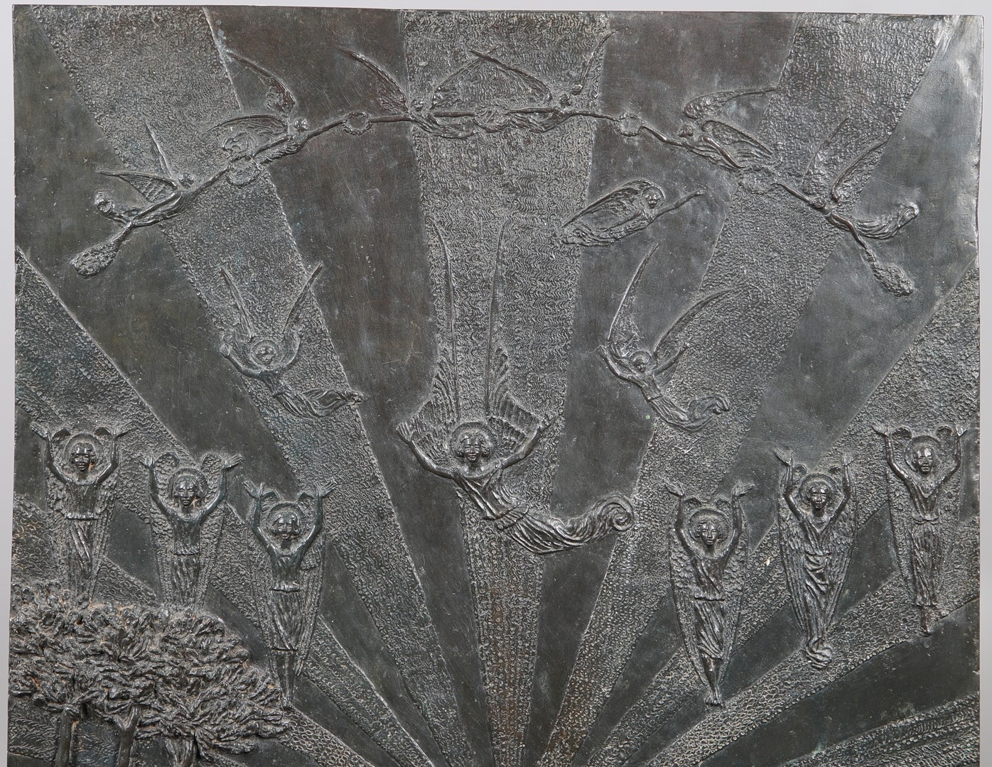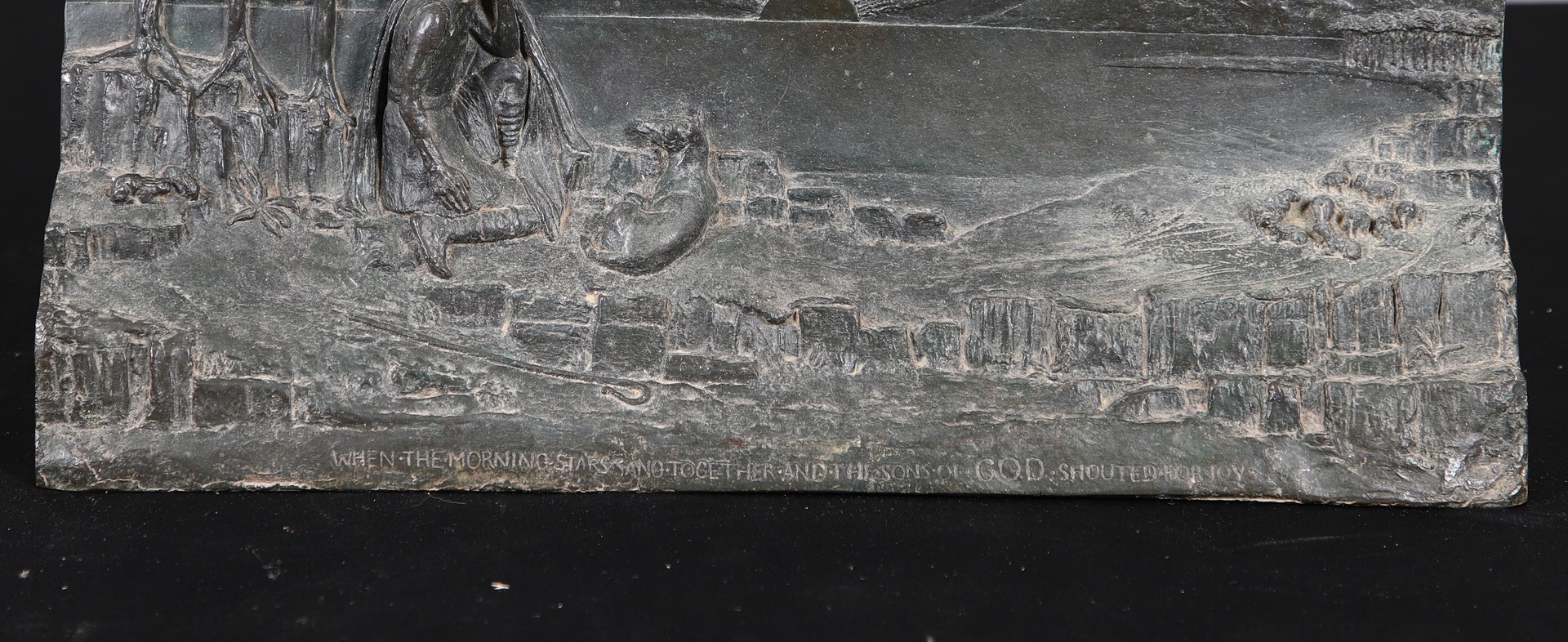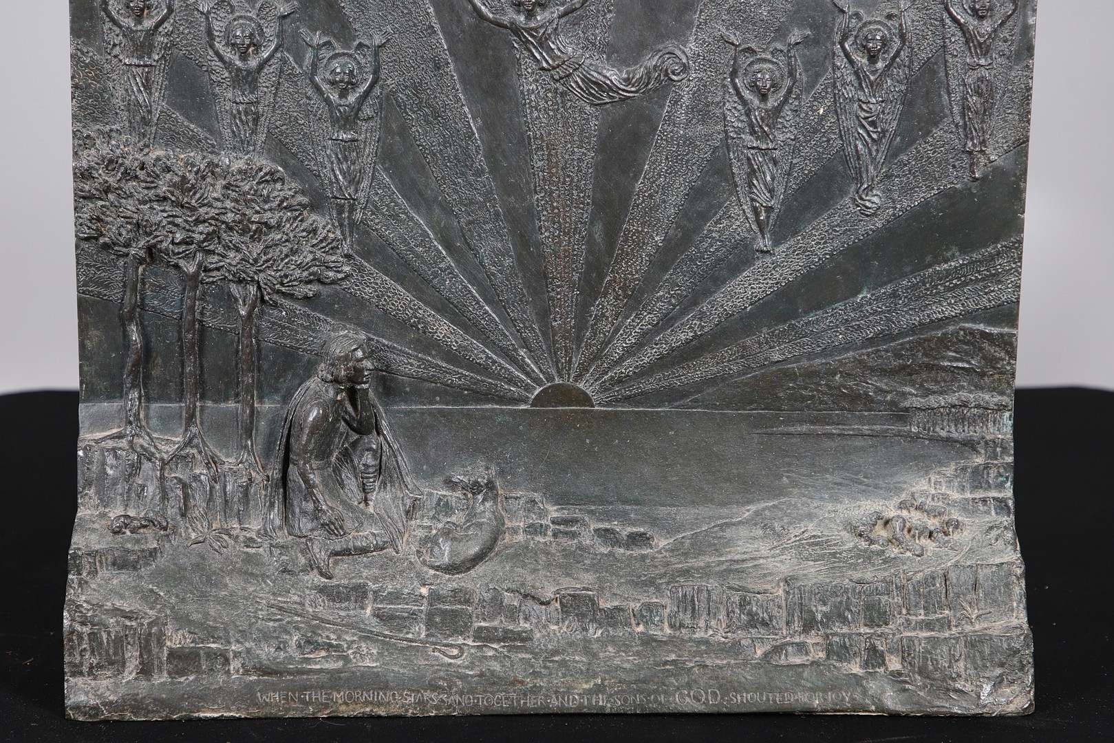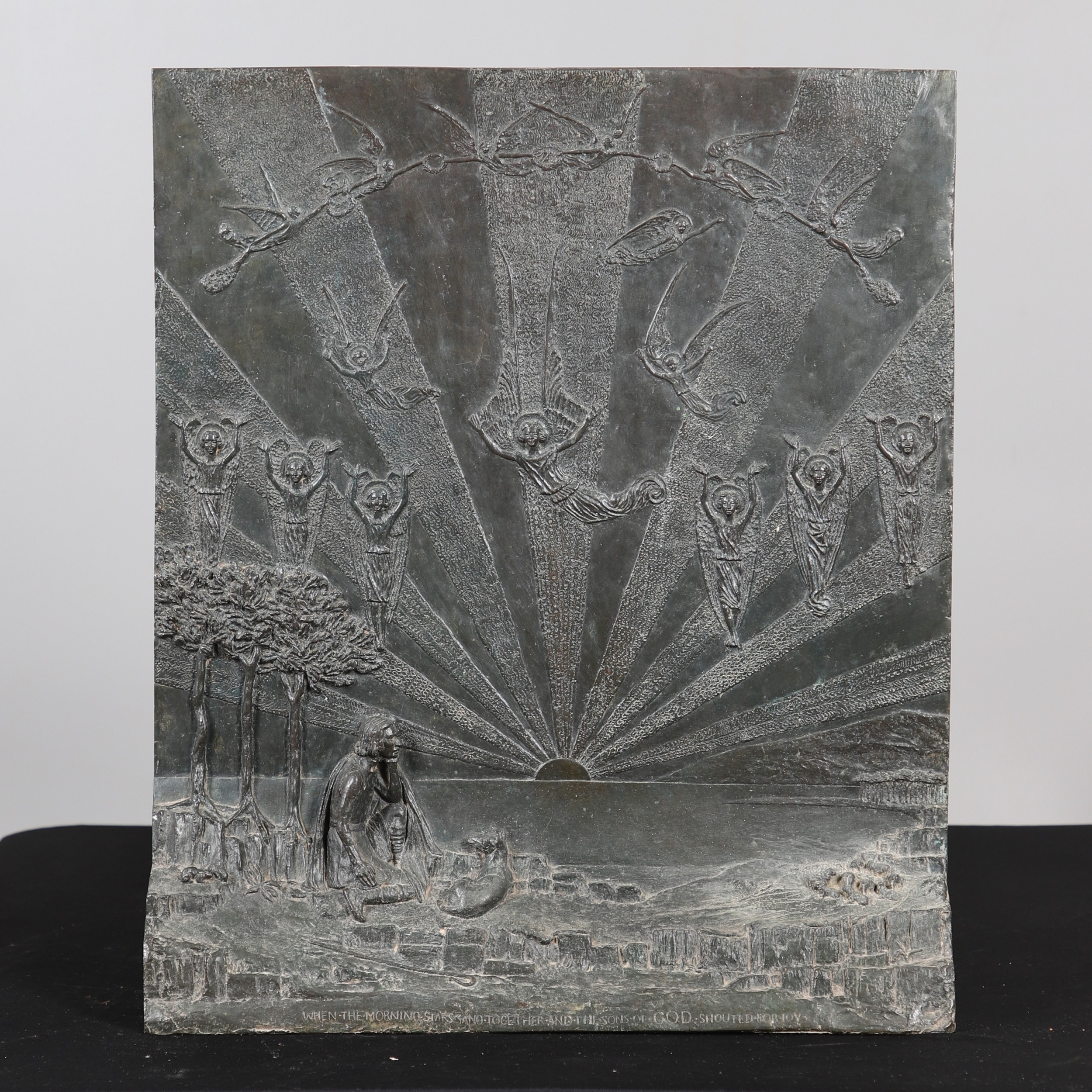 A LARGE EARLY 20TH CENTURY BRONZE RELIGIOUS PLAQUE, CIRCA 1920. illustrating the joyful celebration of angelic beings at the moment God created the Earth, in relief, inscribed below 'When the Morning Stars Sang Together and the Sons of God Shouted for Joy' (Job 37:8, the Old Testament), height 56cm, width 47cm, depth at base 9cm.