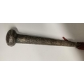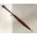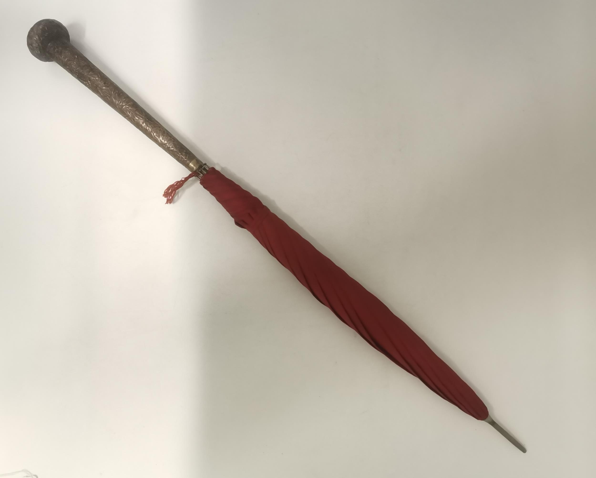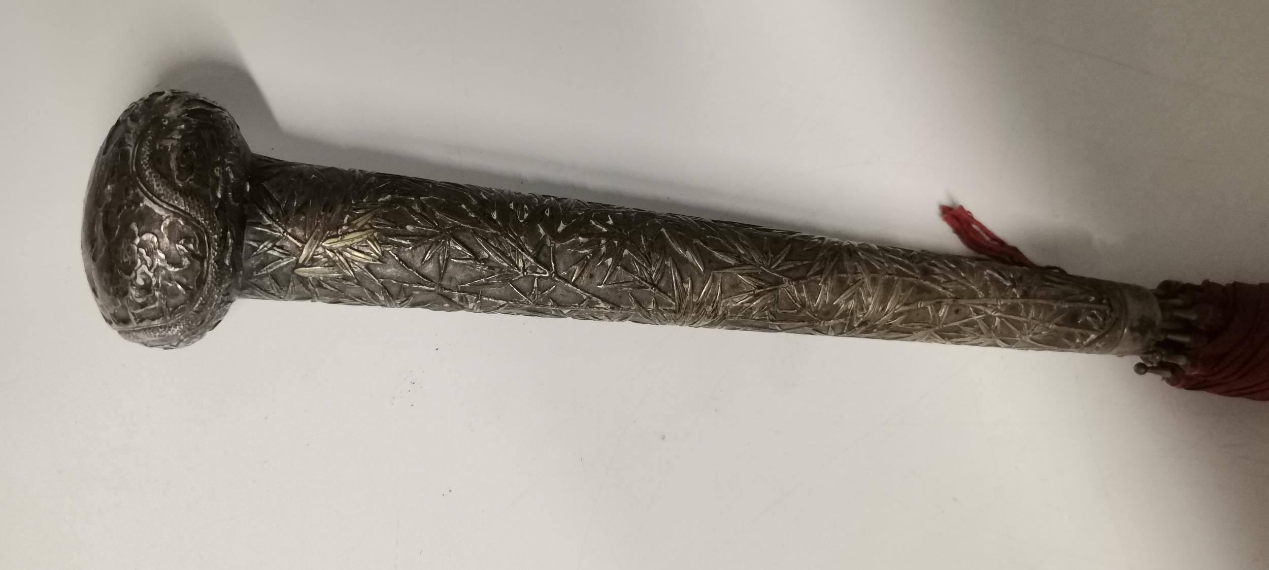 A Chinese white metal-handled red parasol, the handle shaft decorated in relief with bamboo, the pommel with a dragon chasing a flaming pearl. 81.5cm high overall, handle approx. 25cm long