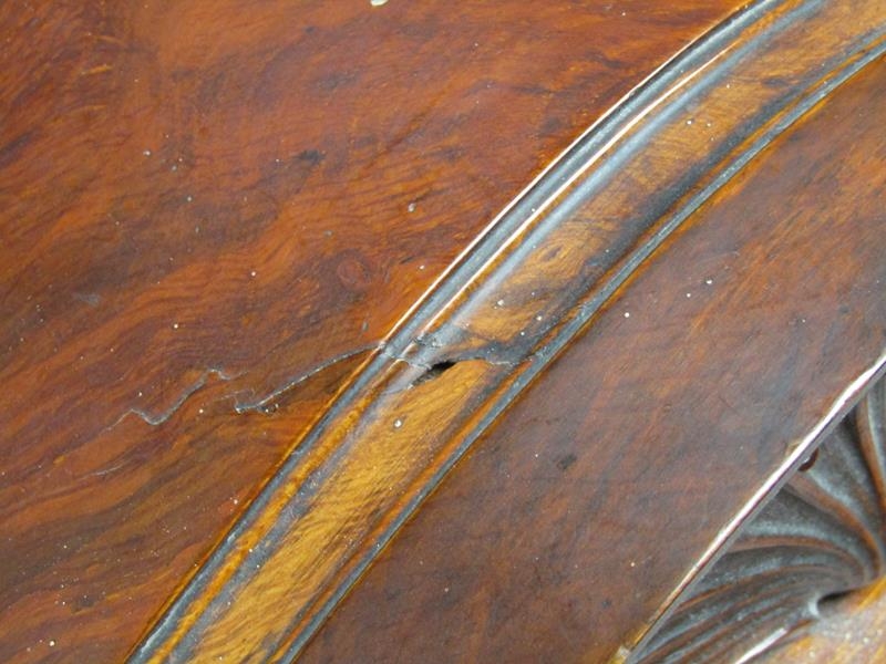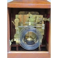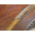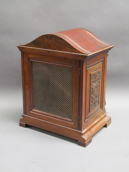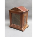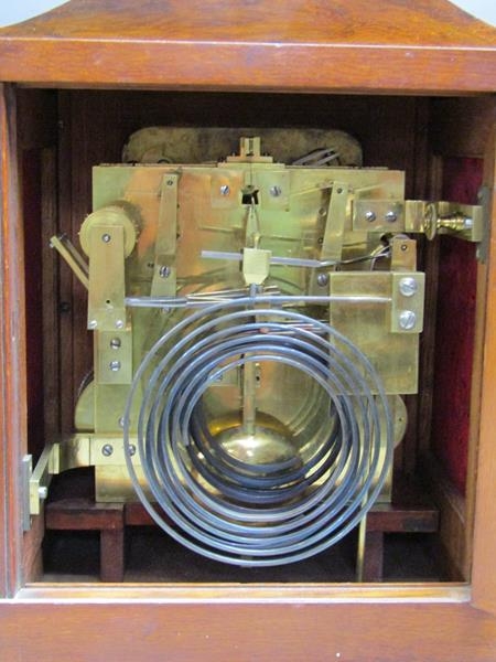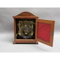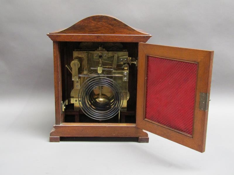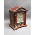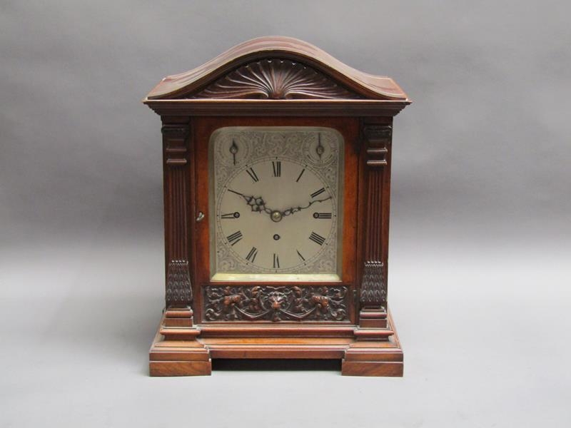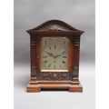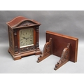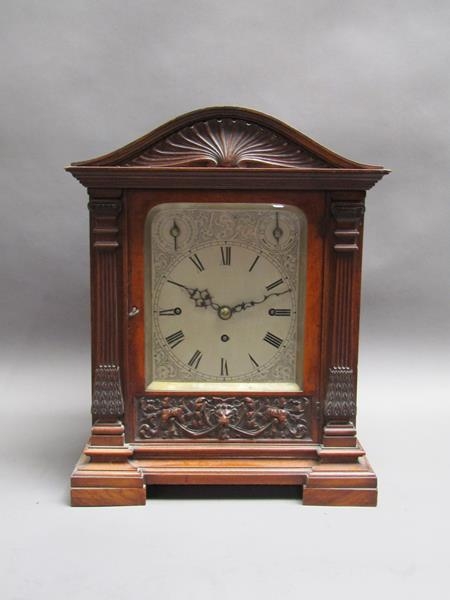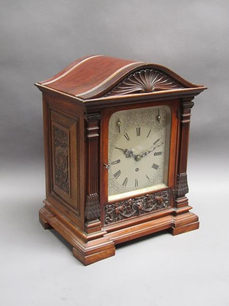 A late 19c English three train bracket clock, the triple fusee movement chiming on four gongs and hour striking on a 5th. The rectangular silvered dial has Roman numerals and chime/silent and pendulum regulation dials. It is contained in a mahogany and oak case with step base and swept arch top. The dial is flanked by fluted pilasters and there is decorative to the case sides and below the dial. The arch has a fan shaped carving and the case stands 45cm tall. It sits on a wall bracket with two carved supports.