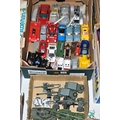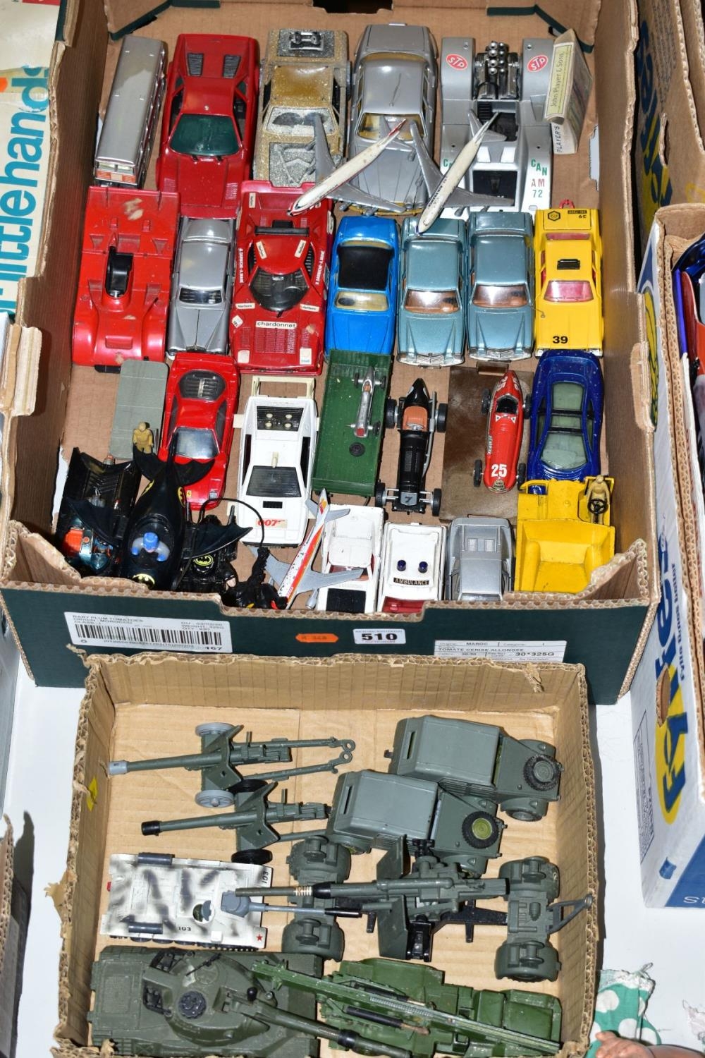 A QUANTITY OF UNBOXED AND ASSORTED PLAYWORN DIECAST VEHICLES, to include Dinky Toys Midget Racer, No356 (damage to one wheel), Honest John Missile Launcher, No665, 2 x Volkswagen KDF and 50mm Gun No617, Corgi Toys Batmobile, No267, Dinky, Corgi, Matchbox, Brumm, Polistil, Schuco etc (2 boxes)
