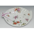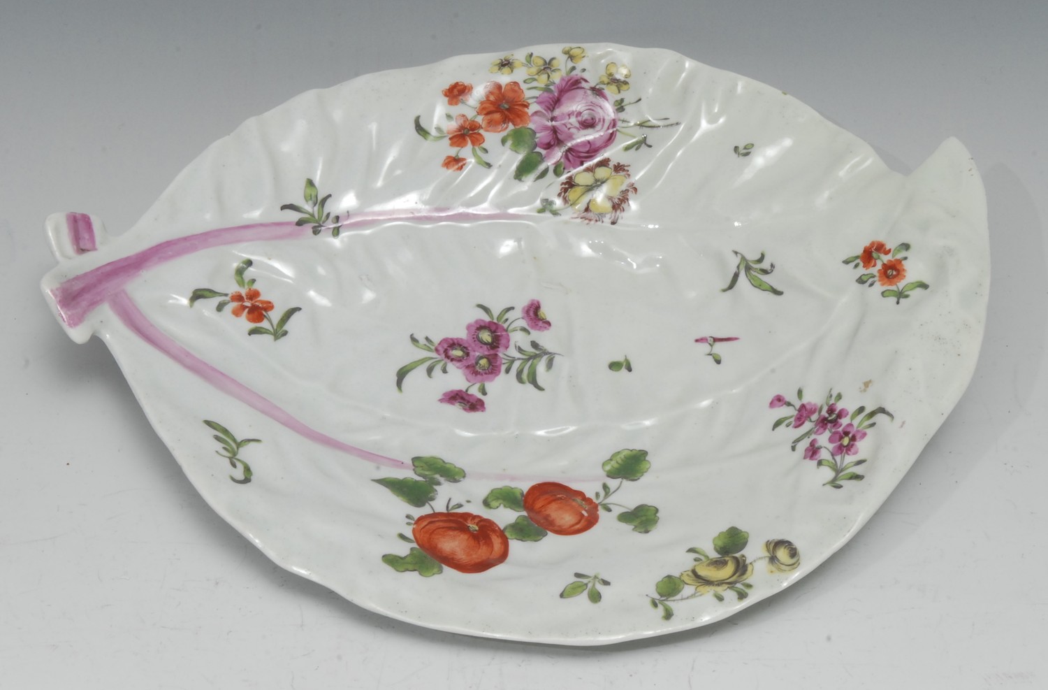A Worcester cos lettuce leaf dish, painted in the 'Rogers' style with polychrome flowers in the manner of Meissen, 25cm wide, c. 1760