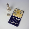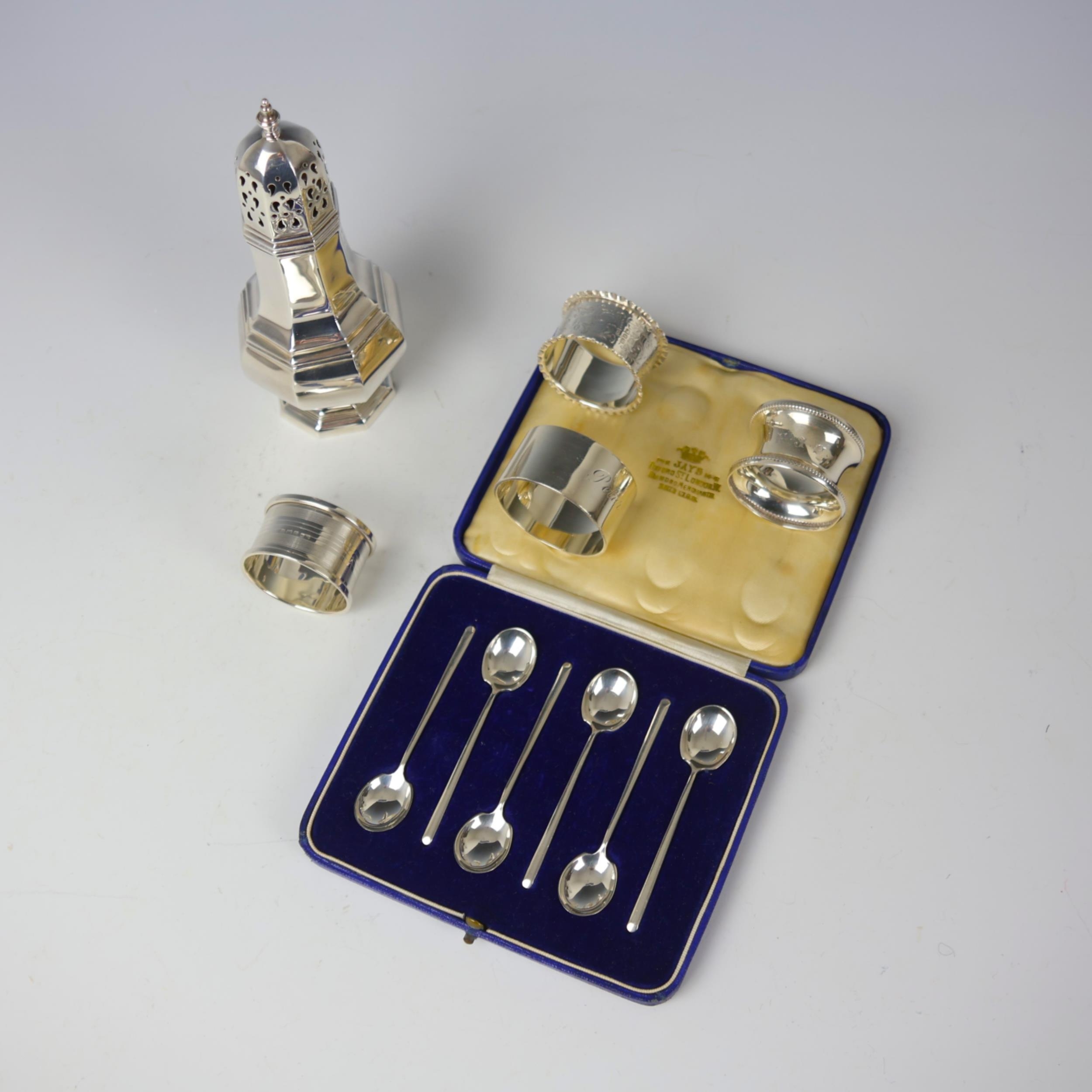 A selection of silver, including a late 20th century sugar caster, W I Broadway & Co, Birmingham 1993, 17cm high, a group of four silver napkin rings, and a cased set of George V teaspoons, James Dixon & Sons Ltd, Sheffield 1934, 8.5cm long, gross weight 9ozt (6)