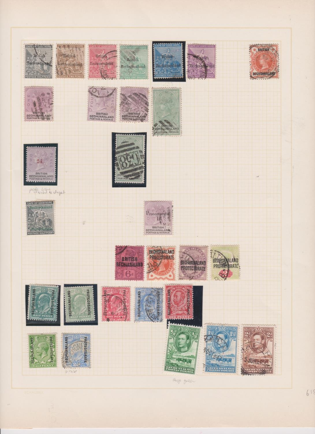 Bechunaland page with better with strength in QV incl 1/- on 1/- ovpt with full 638 cancel and good colour (SG28 cats £90) also SG23 mint (almost certainly SG23a but counted as cheapest) and various SG1-8 (row cats £373) nice lot cats £618 in total