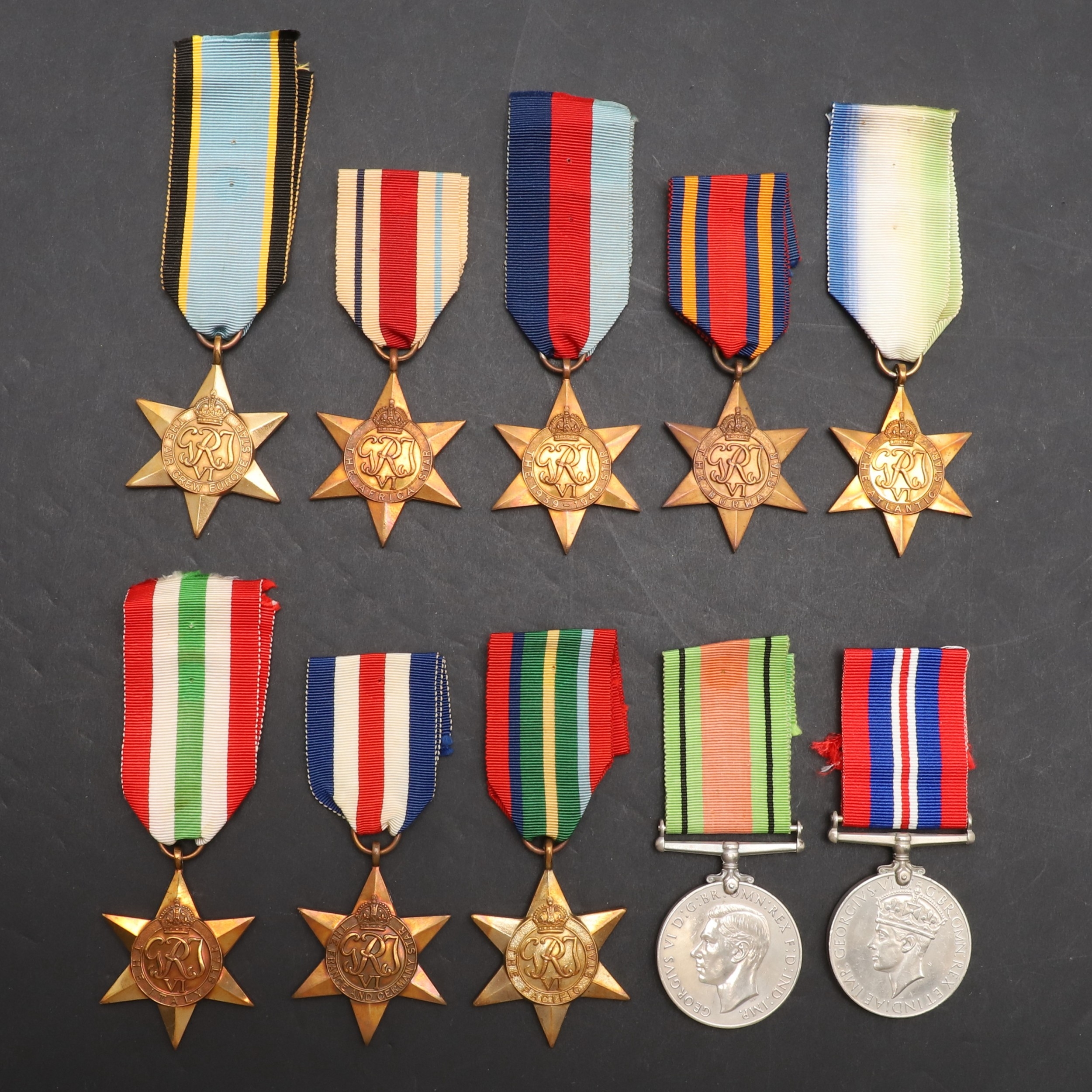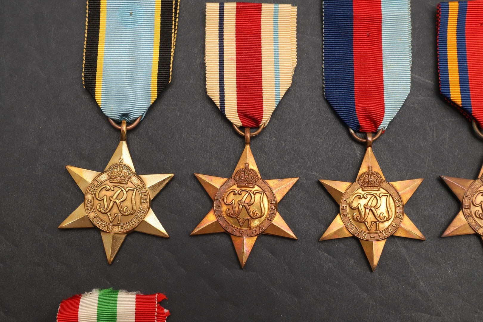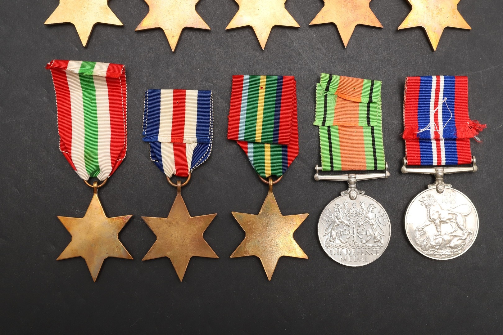 A COMPLETE COLLECTION OF EIGHT SECOND WORLD WAR STARS AND TWO OTHERS. A collection of Second World War Stars comprising 1939-45, France and Germany, Atlantic, Africa, Italy, Burma, Pacific and Air Crew Europe Star (Copy), and a Defence Medal and War Medal. All unnamed as issued.