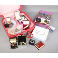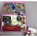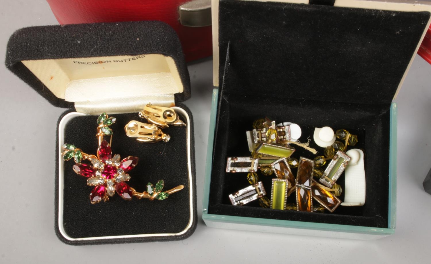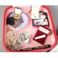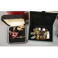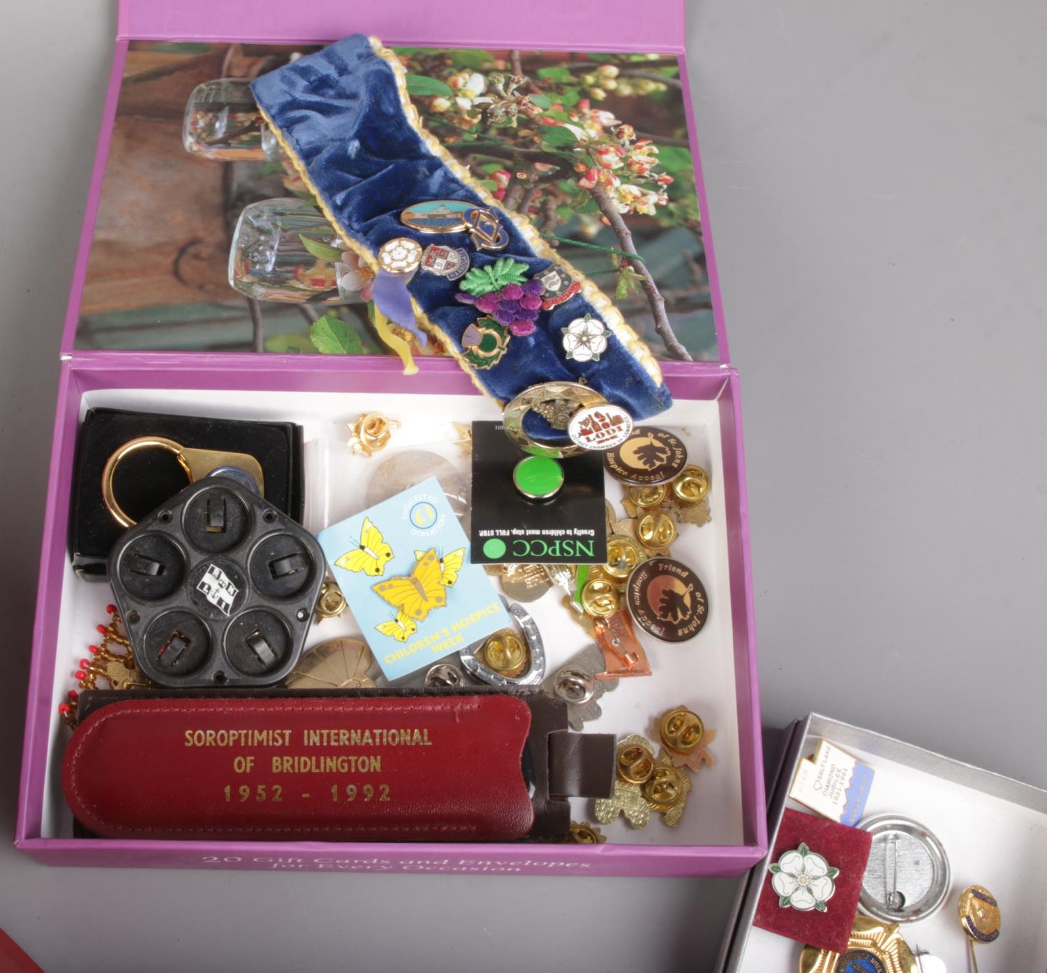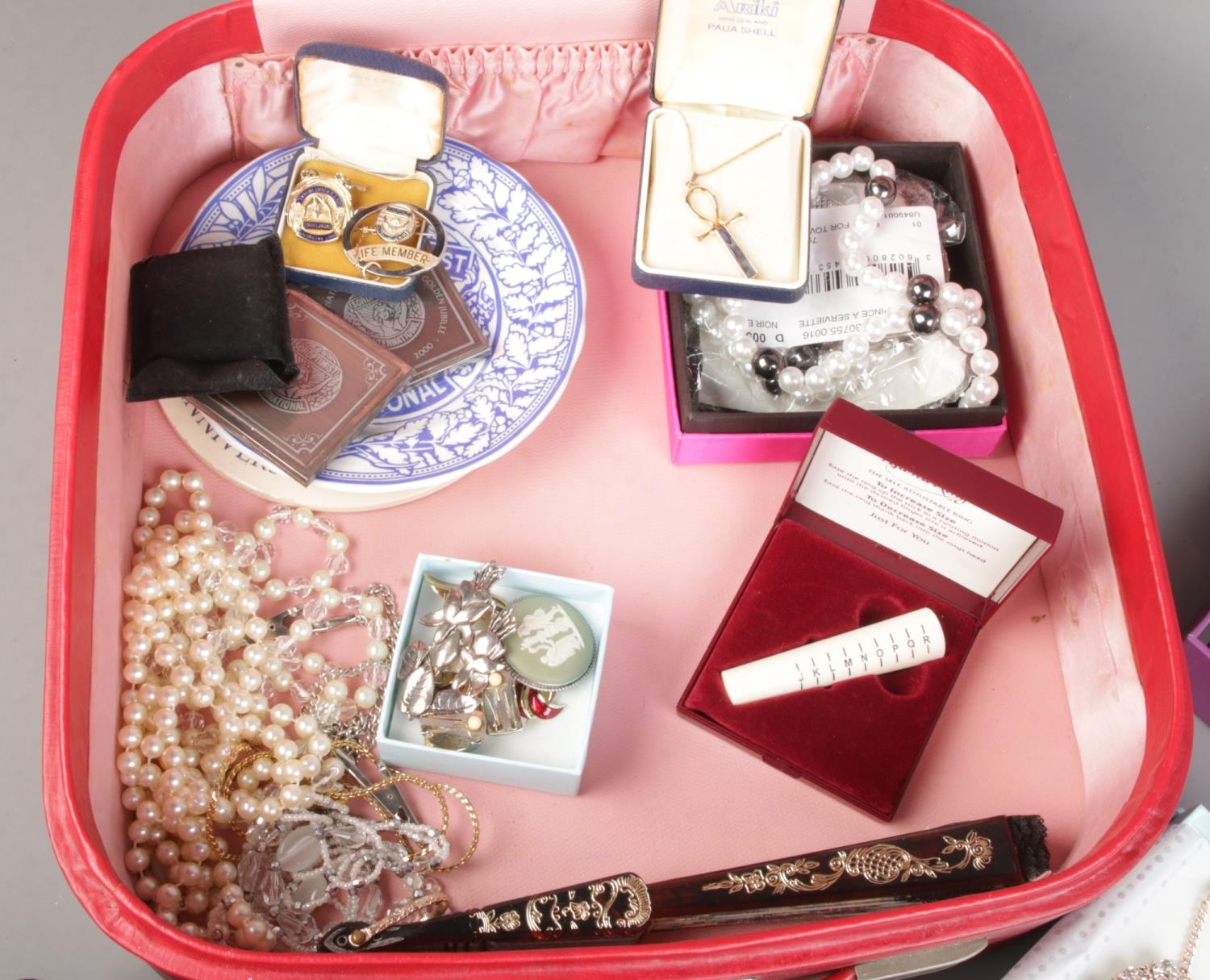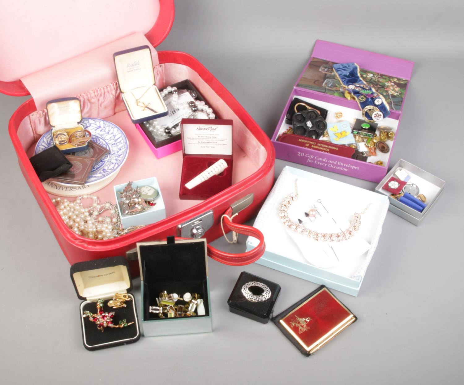A vanity case with contents of costume jewellery and collectables. Includes silver brooch, enamel badges, Soroptimist International items etc.