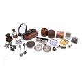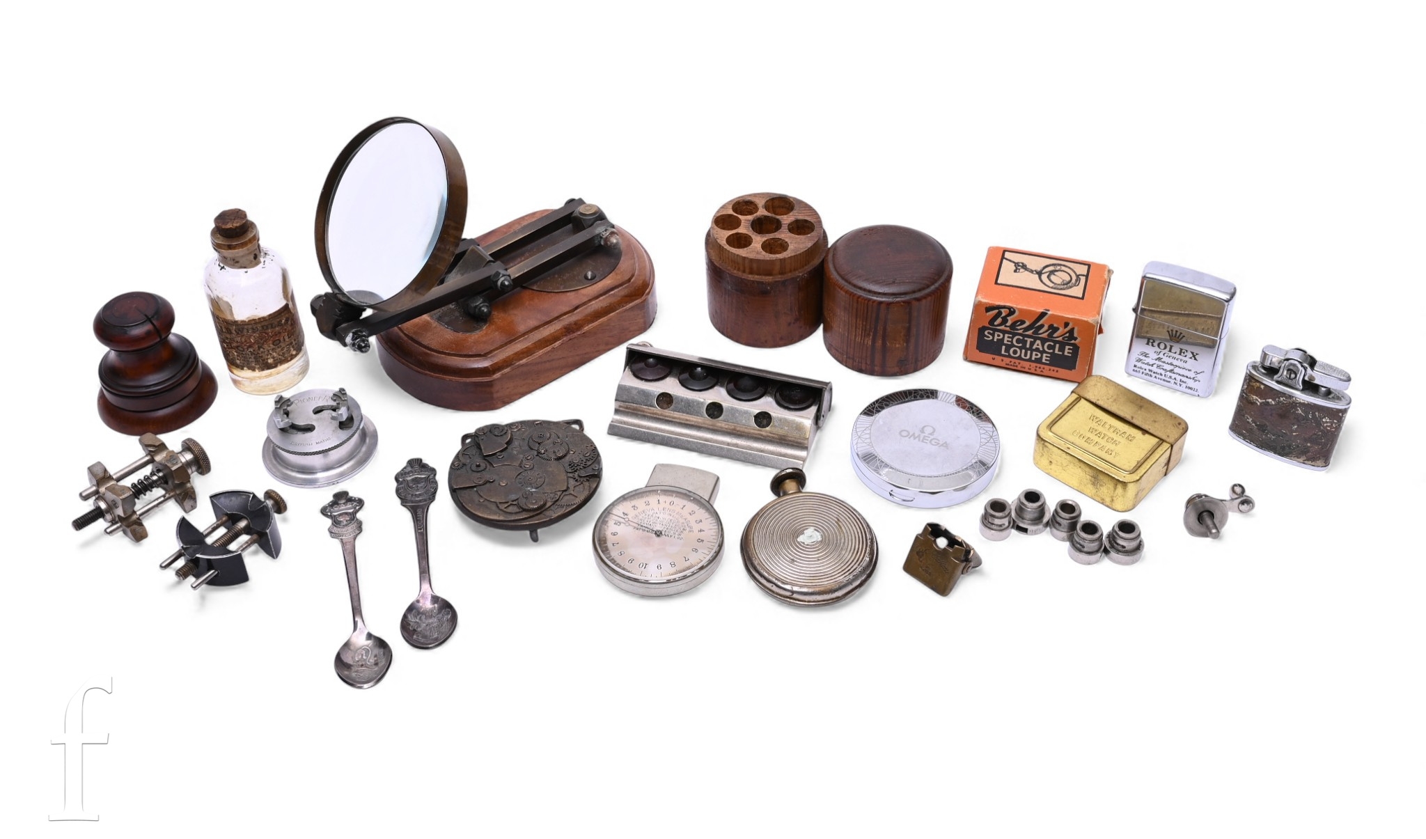 A replica anglepoise desk magnifier, various watch accessories, mirrored compact, Rolex and Omega lighters, Rolex Bucherer spoons, a Swiss lens measurer, main spring winder set in wooden box, Waltham watch company etc. (qty)