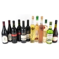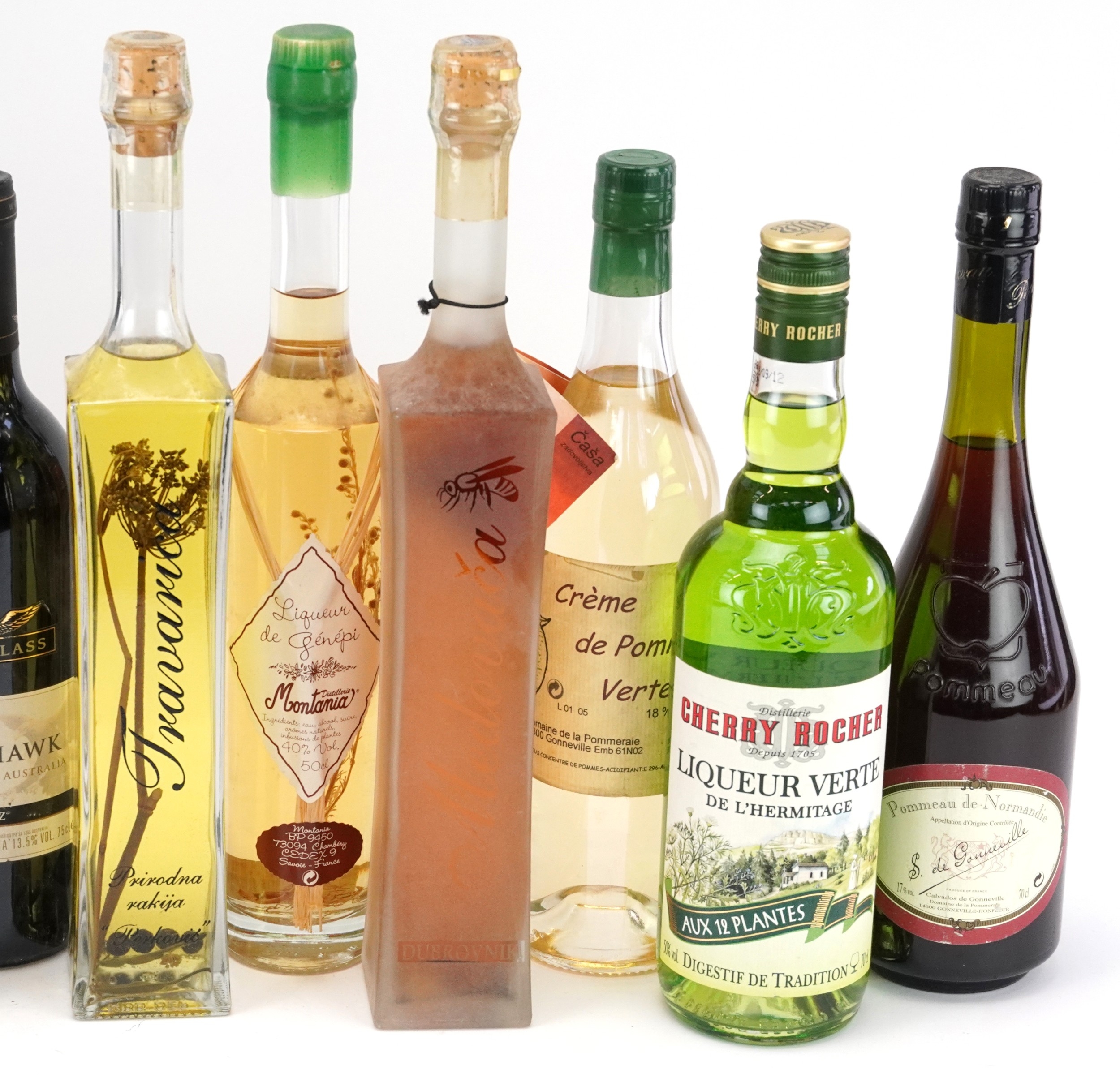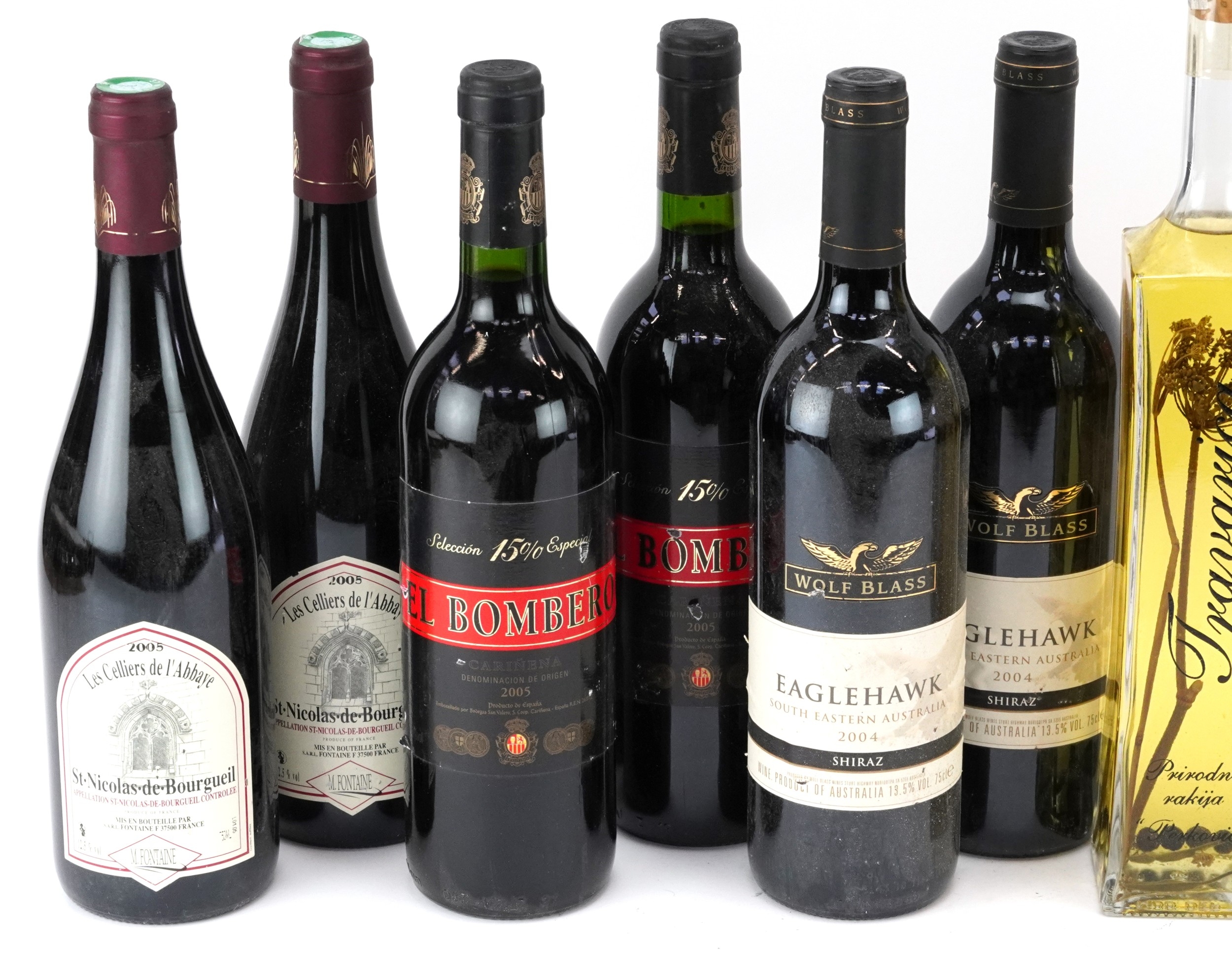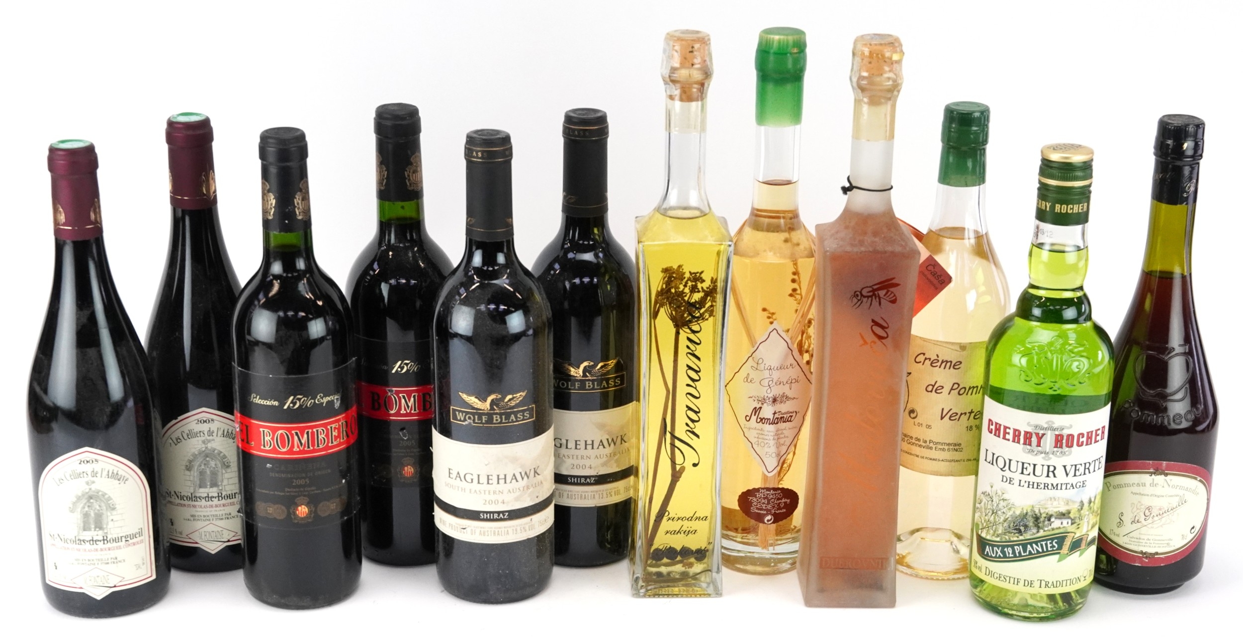 Twelve bottles of alcohol including 2004 Eagle Hawk South Eastern Australia wine, 2005 Saint-Nicolas de Bourgueil, Cherry Rocher Liqueur and Crème de Pomme Verte.