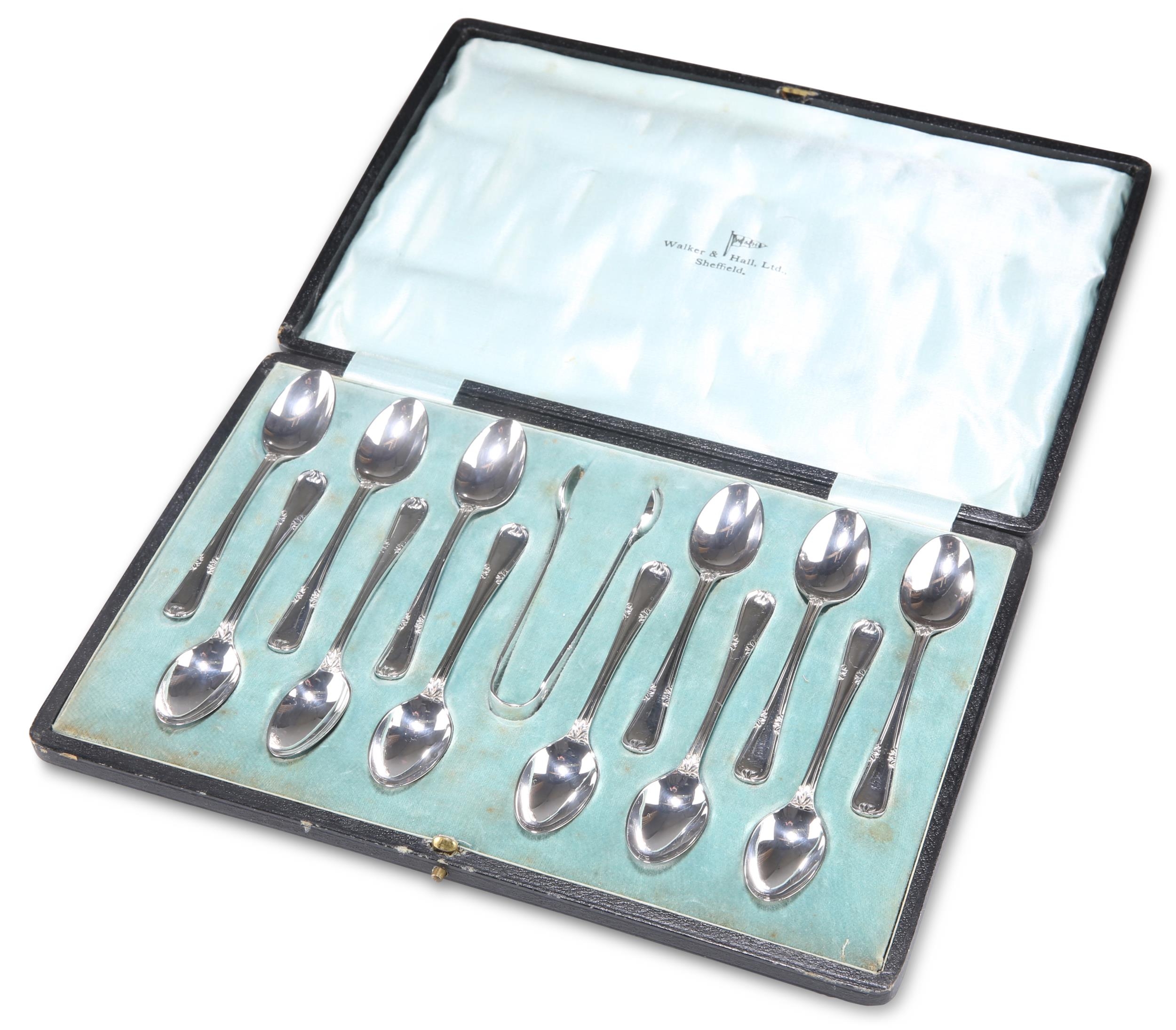 A SET OF GEORGE V SILVER TEASPOONS AND SUGAR NIPS,Êby Walker & Hall,ÊSheffield 1928 and 1929, comprising twelve spoons and one pair of tongs, double-cast with thread and foliate sprays, cased. Spoons 11cm, 6.3 troy ounces gross