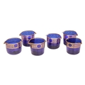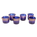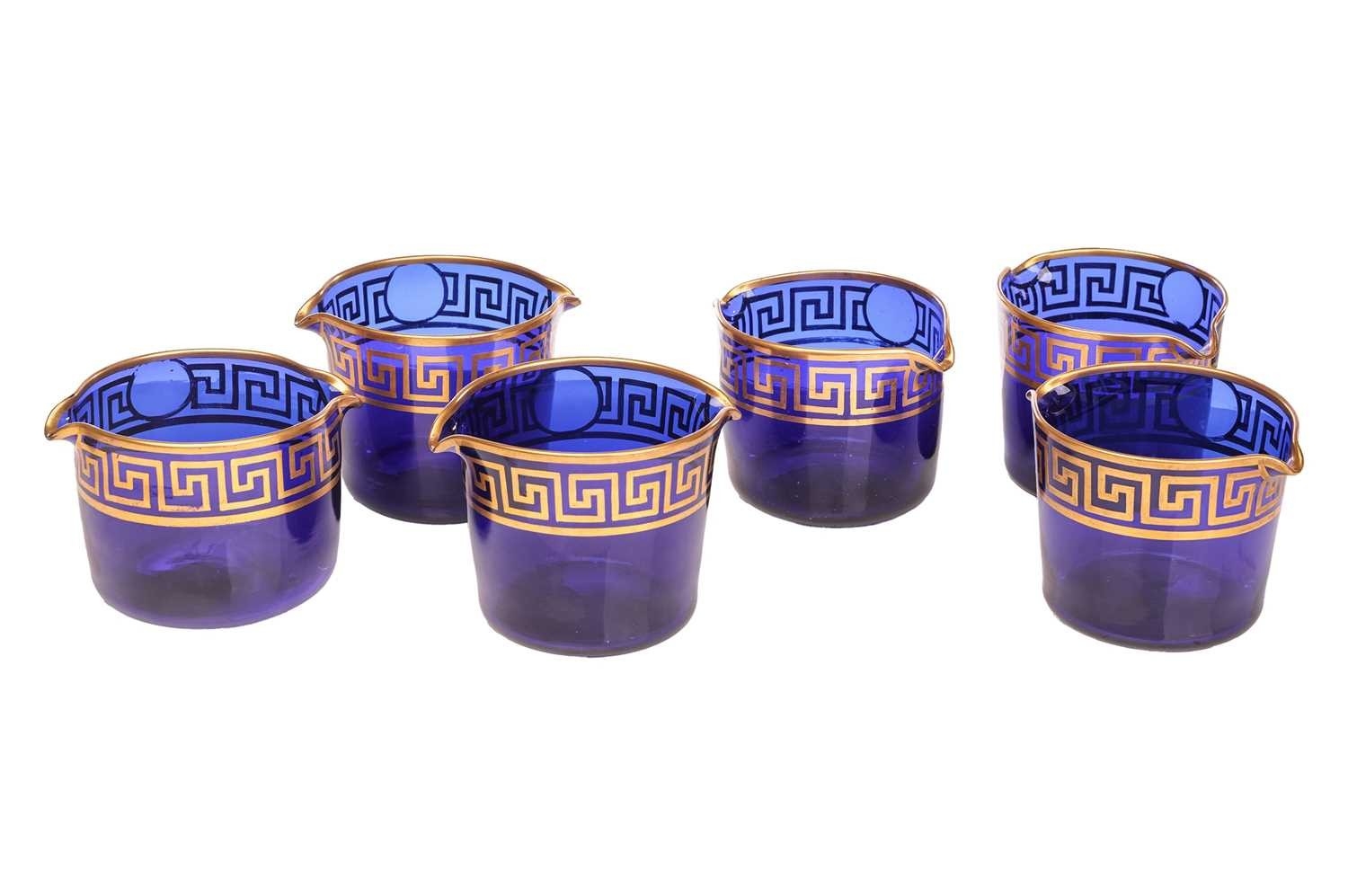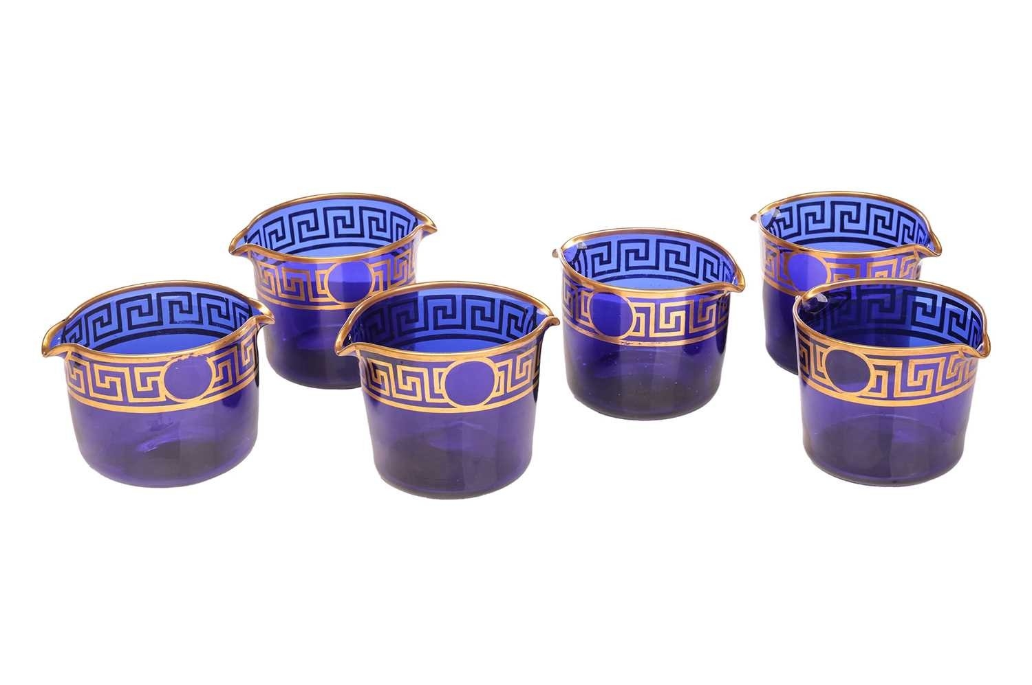 A group of six Bristol cobalt blue glass wine rinsers, possibly by Isaac Jacobs, each with gilt Greek Key pattern, approximately 10.5 cm high x 14 cm wide. Qty: (6) No major damage evident. Some gilt loss in places, and firing cracks to the gilt spouts on one, with light scratches to the undersides.