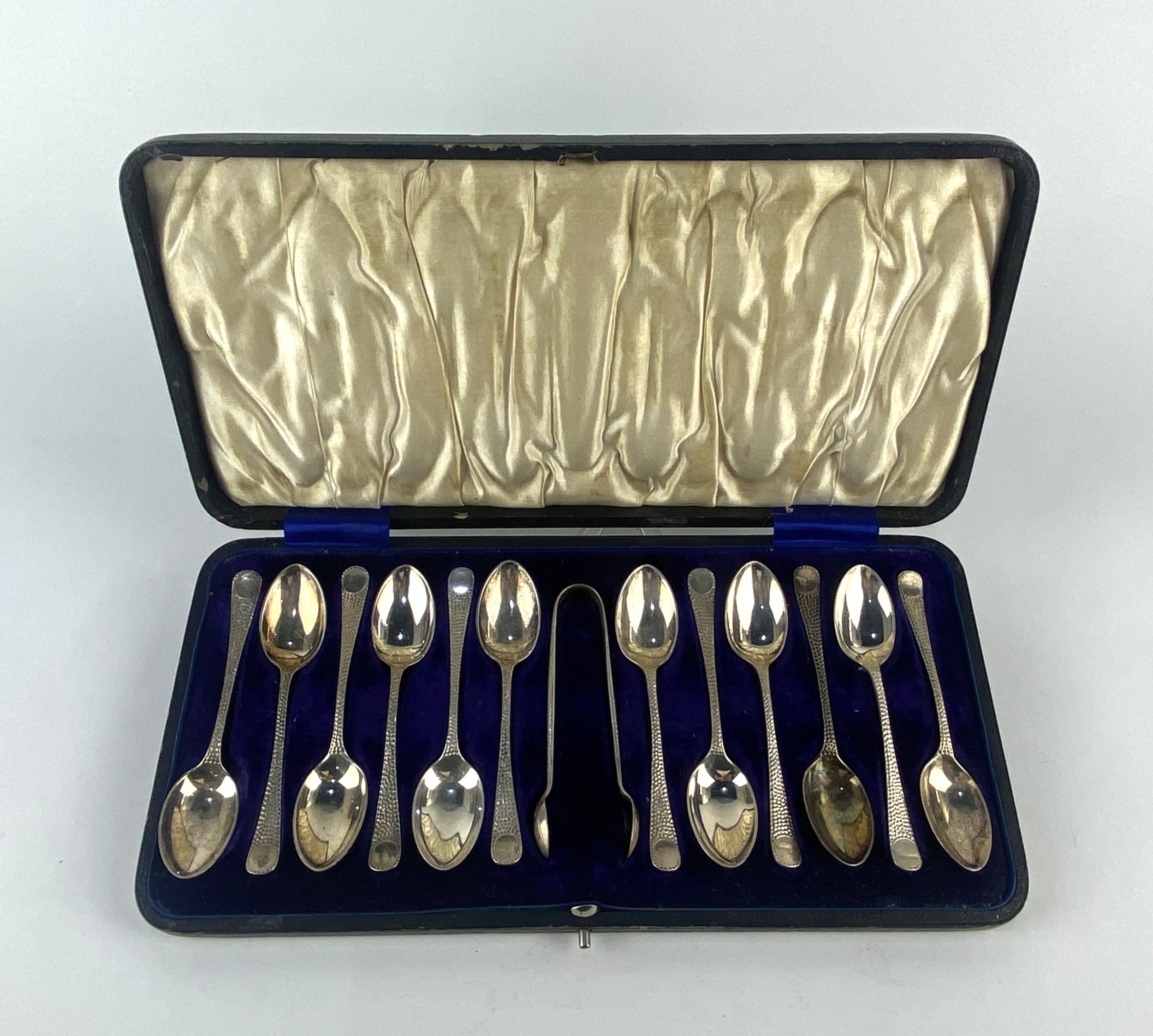An Edwardian cased set of twelve silver teaspoons and sugar tongs, by Atkin Brothers, Sheffield, 1903 and 1904, 5.5 oz