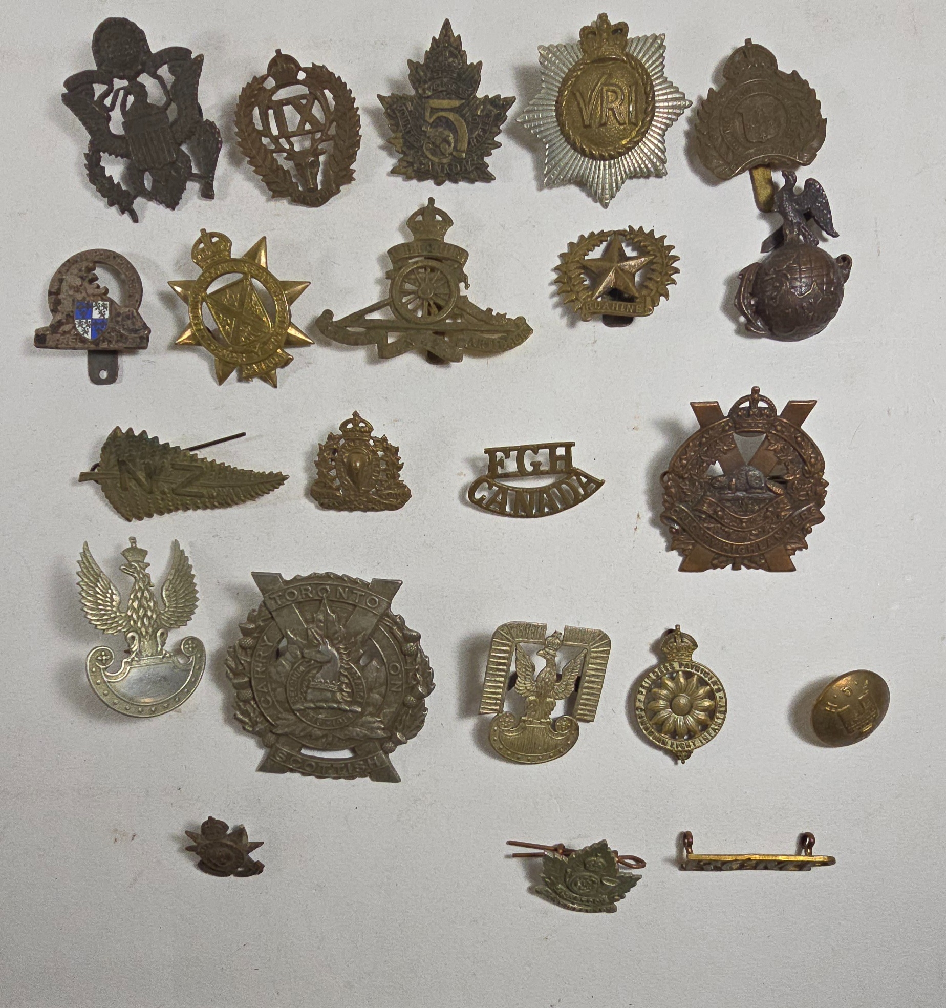 14 Overseas cap badges, including Canadian 5th C.E.F. Mounted Rifles, 4 other Canadian including Toronto Scottish, 5 WWI period New Zealand including Artillery, WWI US bronze eagle, and WWII Polish Army and Air Force, and 8 collar badges, titles etc. Generally GC. (22)