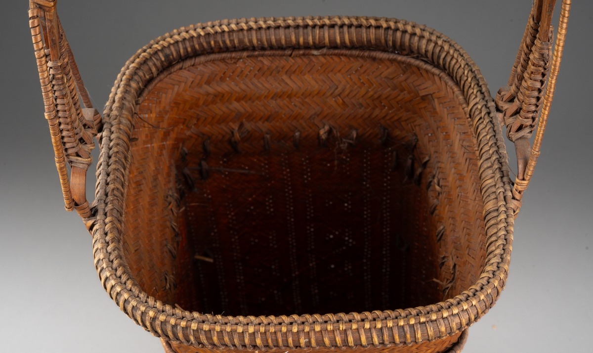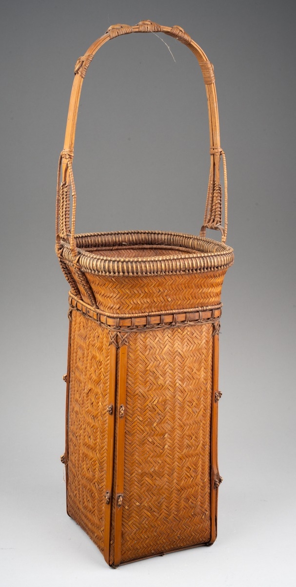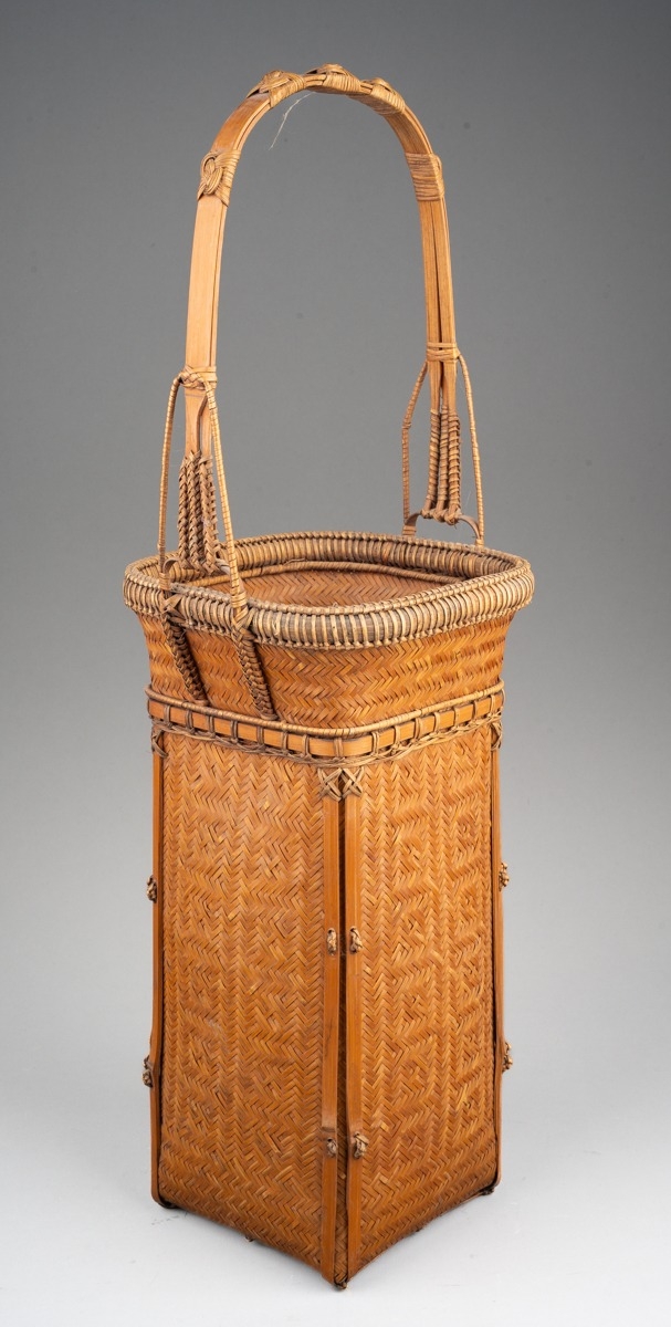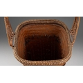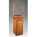 A Japanese finely woven wicker Ikebana basket with carrying handle, of tapered square outline, height 52cm