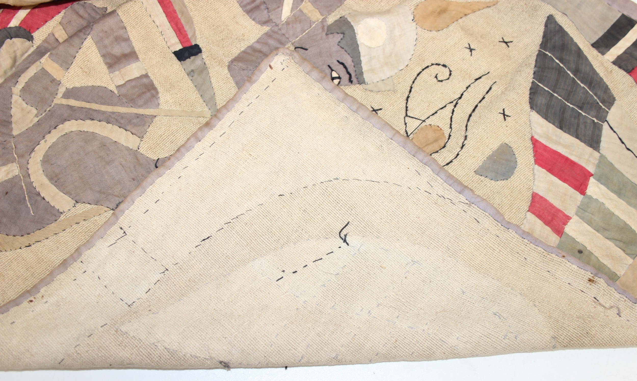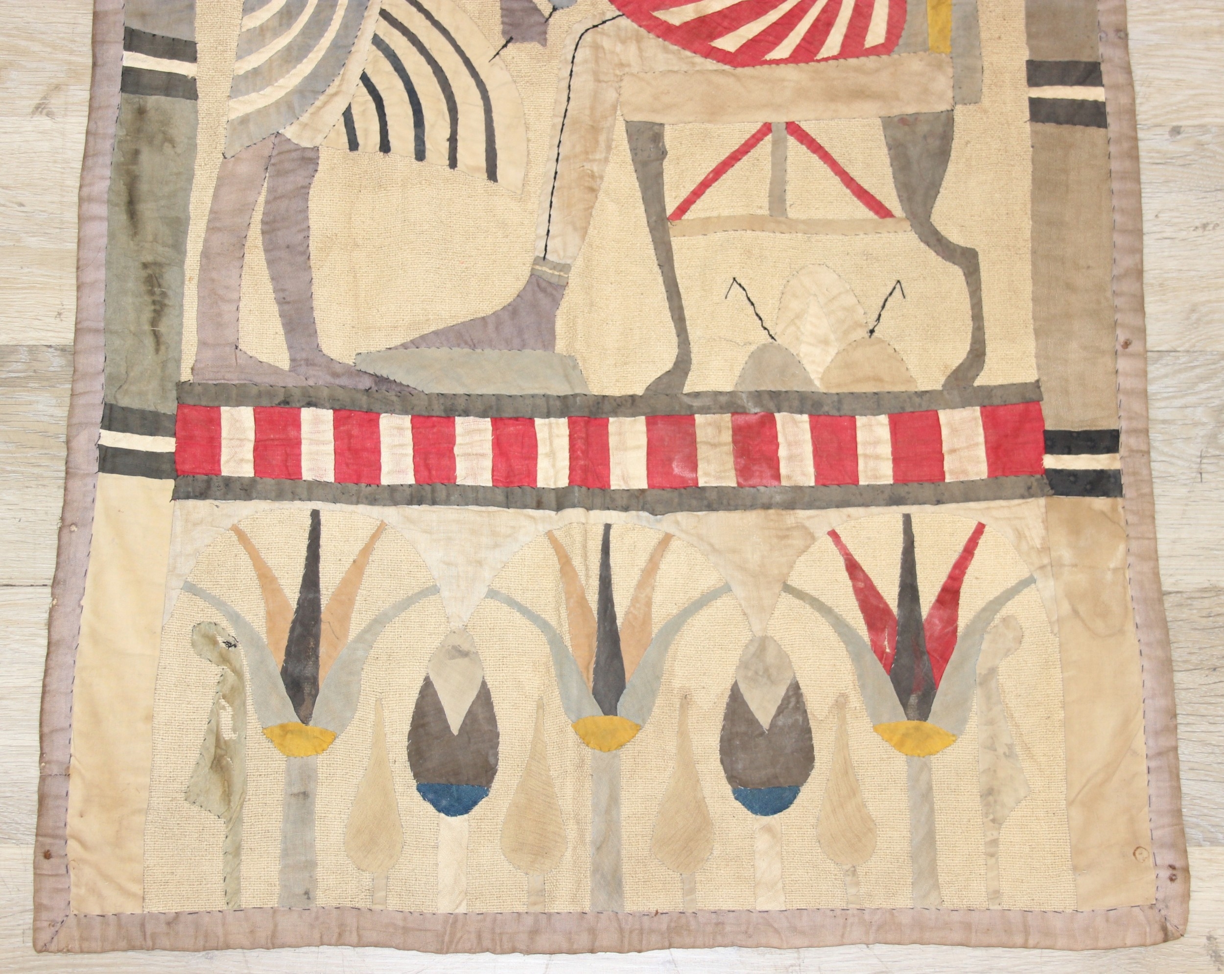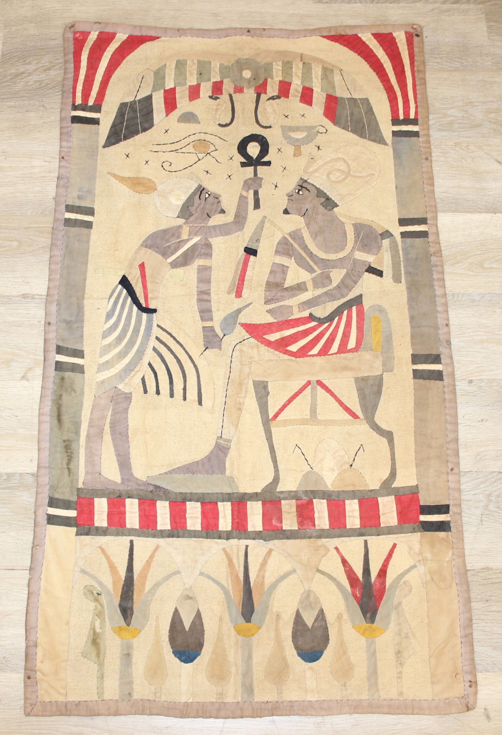 A vintage Egyptian Revival needlework or appliqué panel depicting Egyptian motifs, likely early to mid-20th century, hand made, 121cm x 66cm