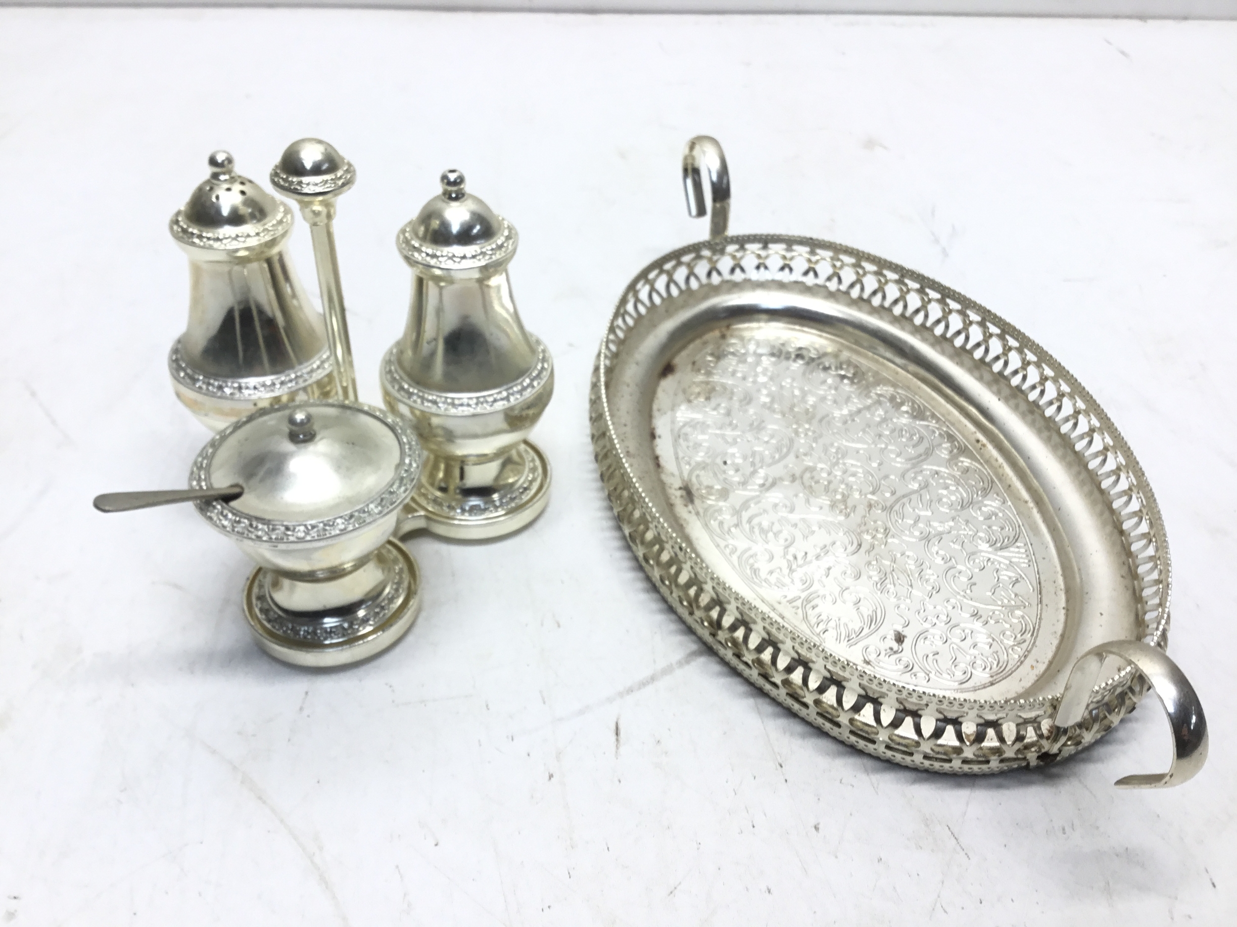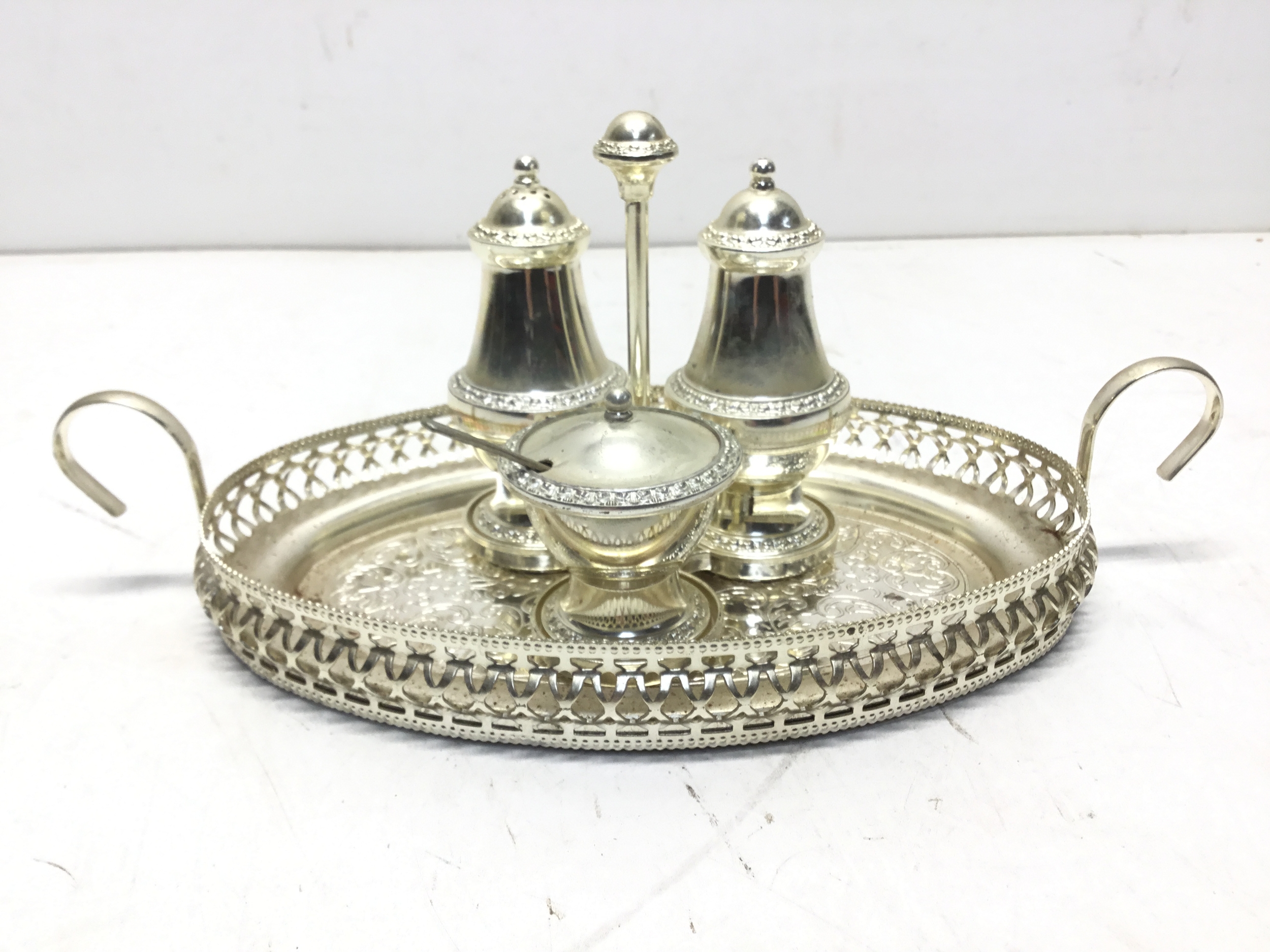 Lovely silver plated cruet set with salt, pepper and mustard pot