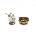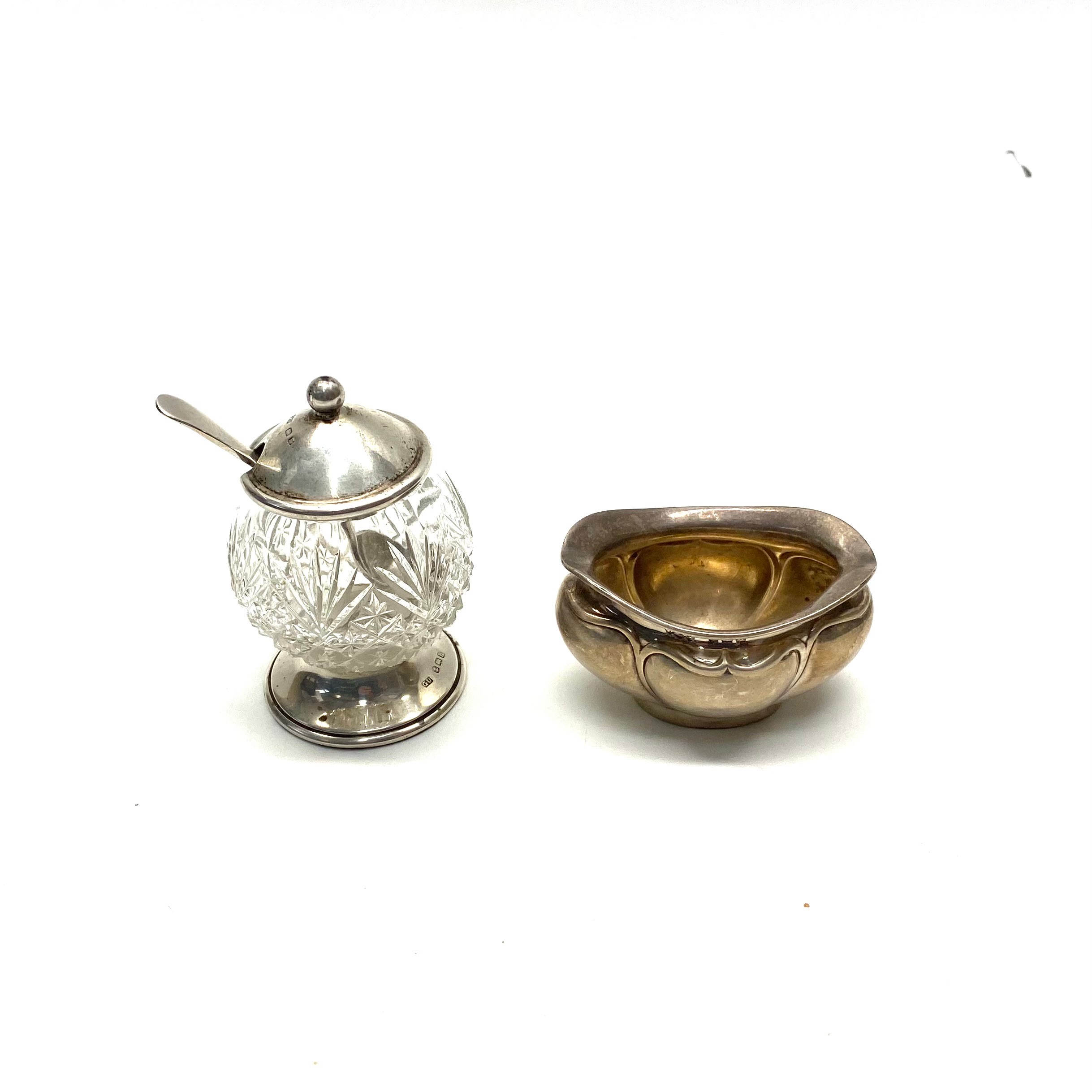 Sterling silver salt/condiment pot with hallmarks for Birmingham 1912 by Joseph Gloster Ltd, Lion Silver Works, Hockley Hill, Birmingham and a silver lidded pot with silver spoon.