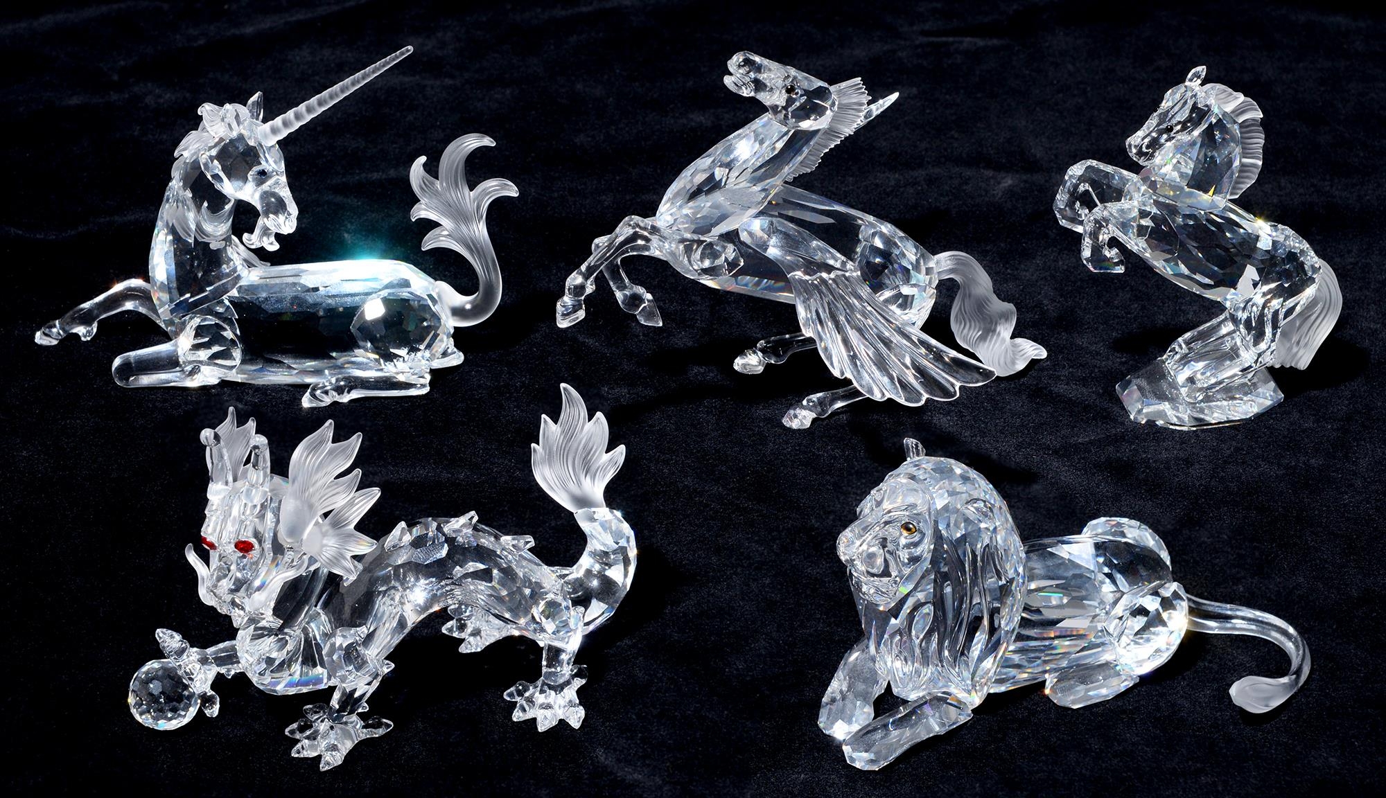 Swarovski. Four large glass models of Pegasus, unicorn, lion and dragon, boxed