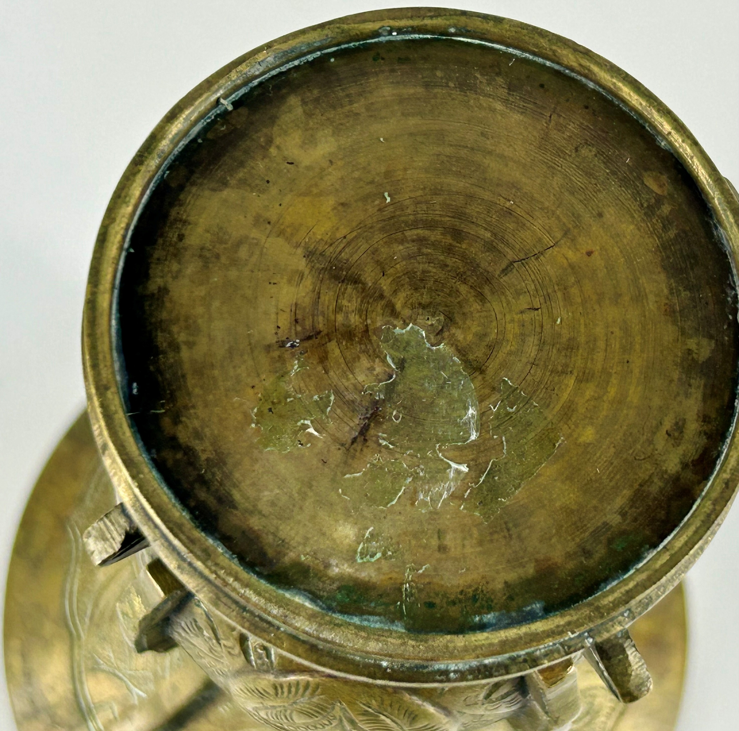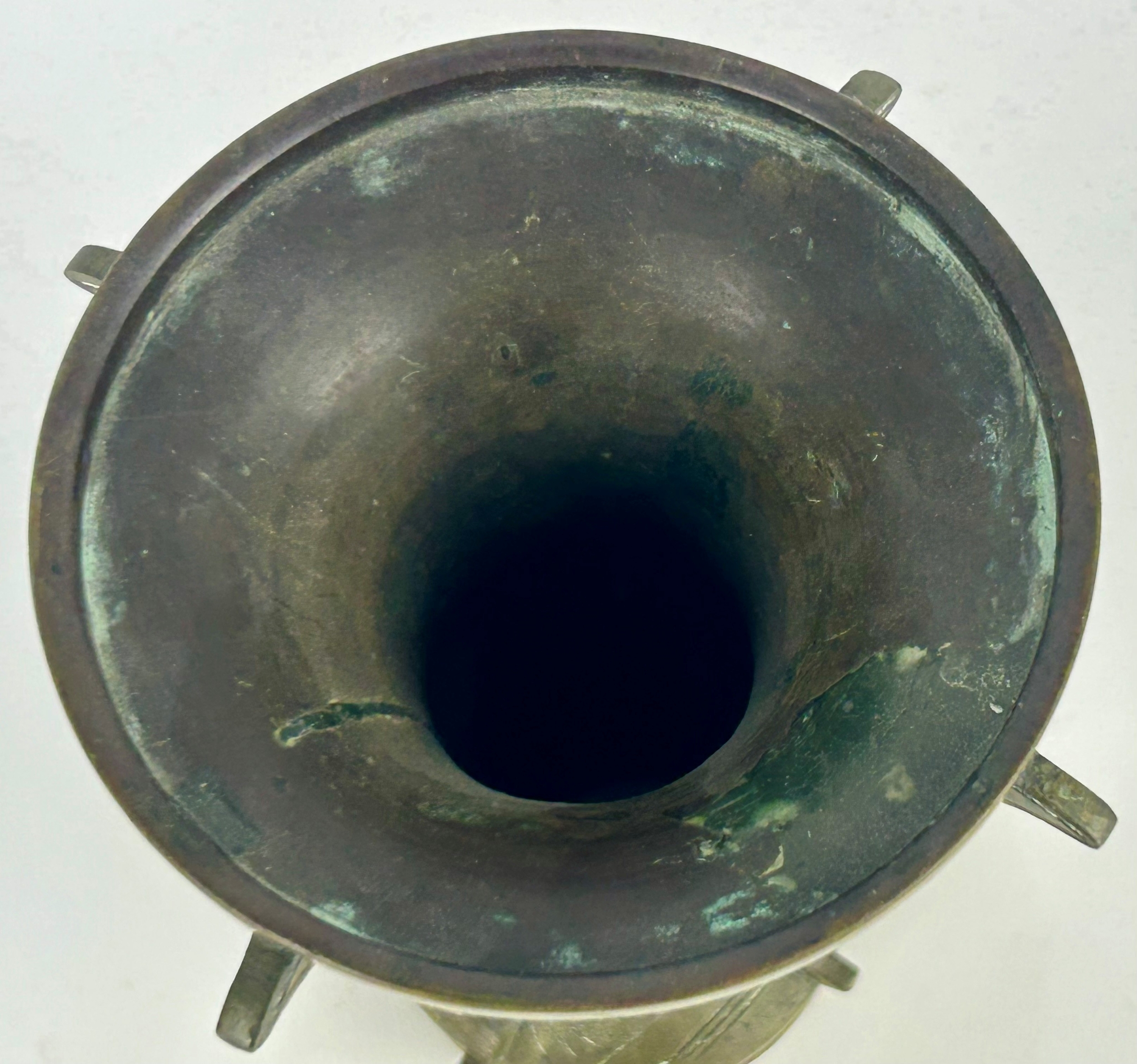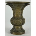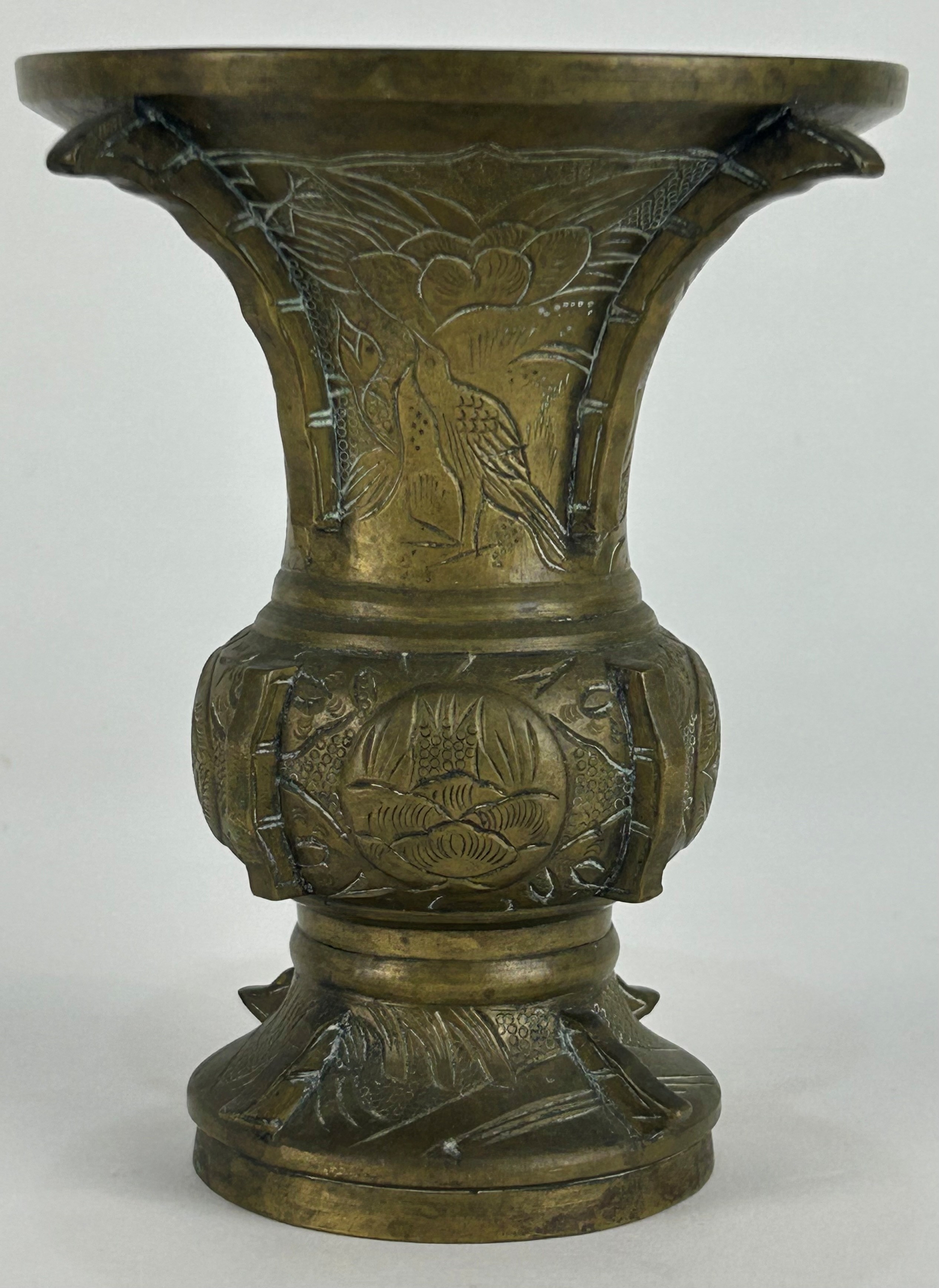 A Chinese bronze Gu vase, with incised decoration depicting a deer, birds, and naturalistic designs,13.5cm high.