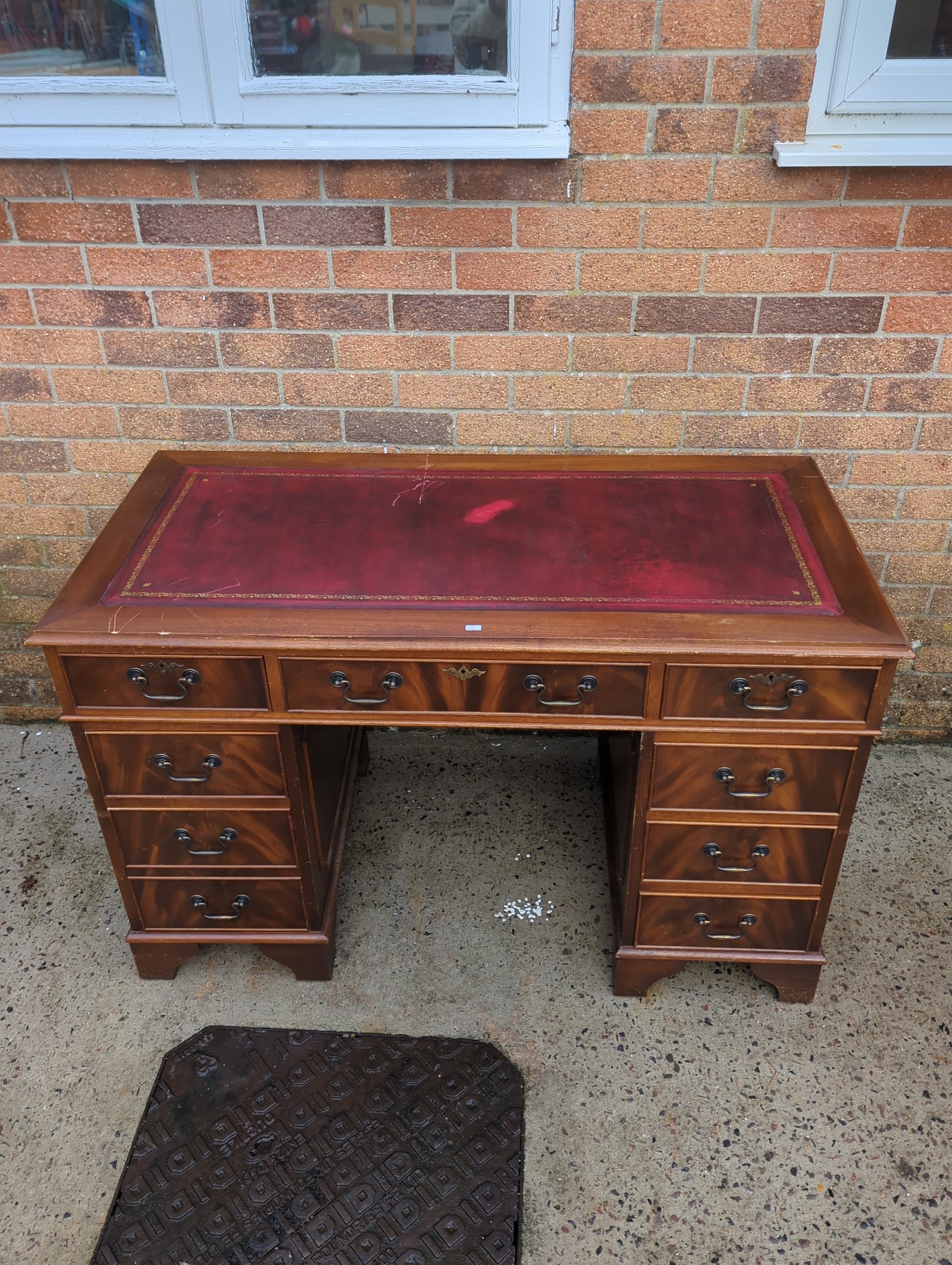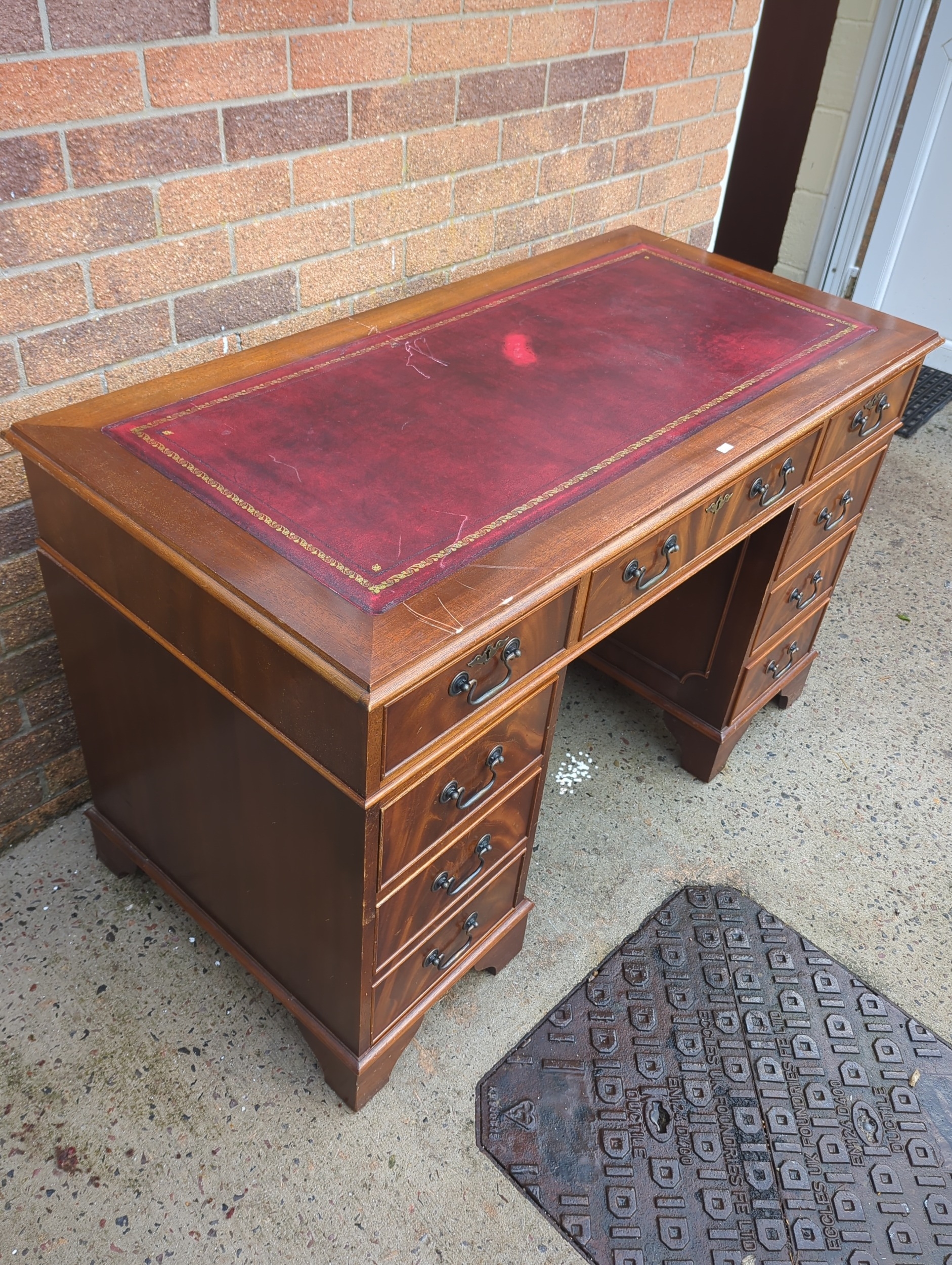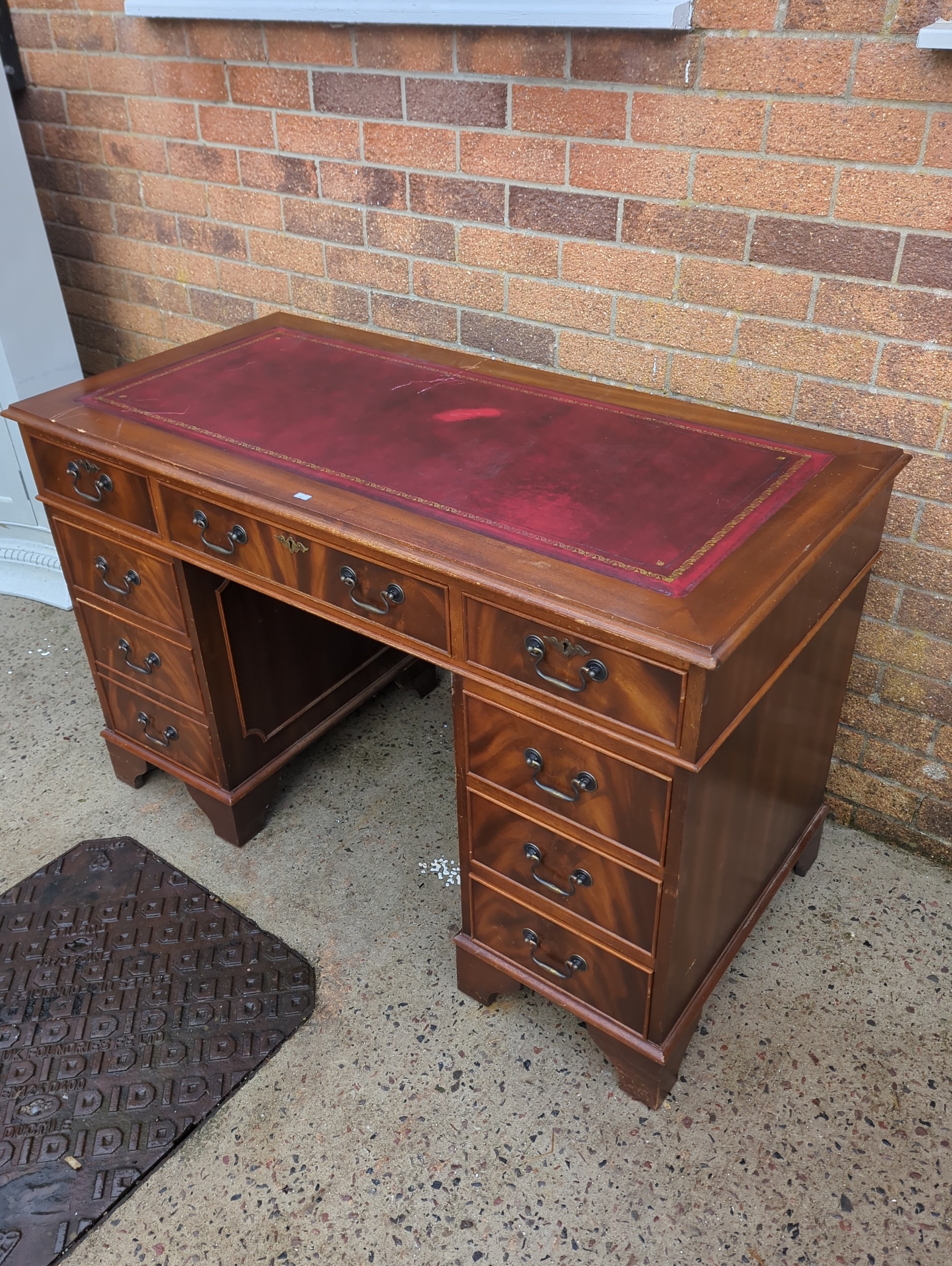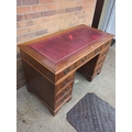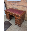 A classic mahogany pedestal desk featuring multiple drawers for ample storage. The desk showcases a rich reddish-brown finish with brass handles on each drawer, adding to its traditional appeal. The top surface is covered with a red leather writing pad, embellished with gold detailing around the edges.