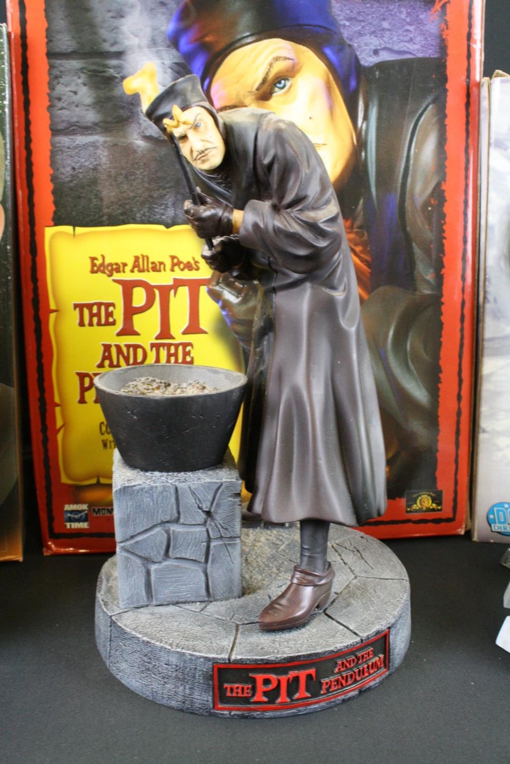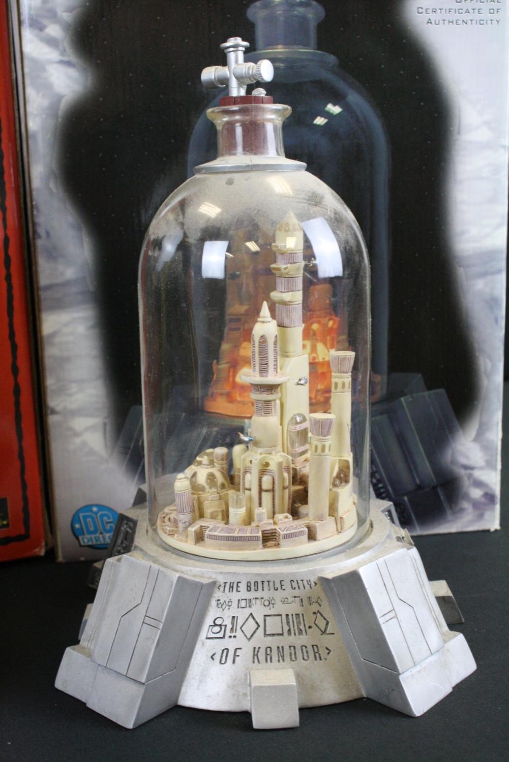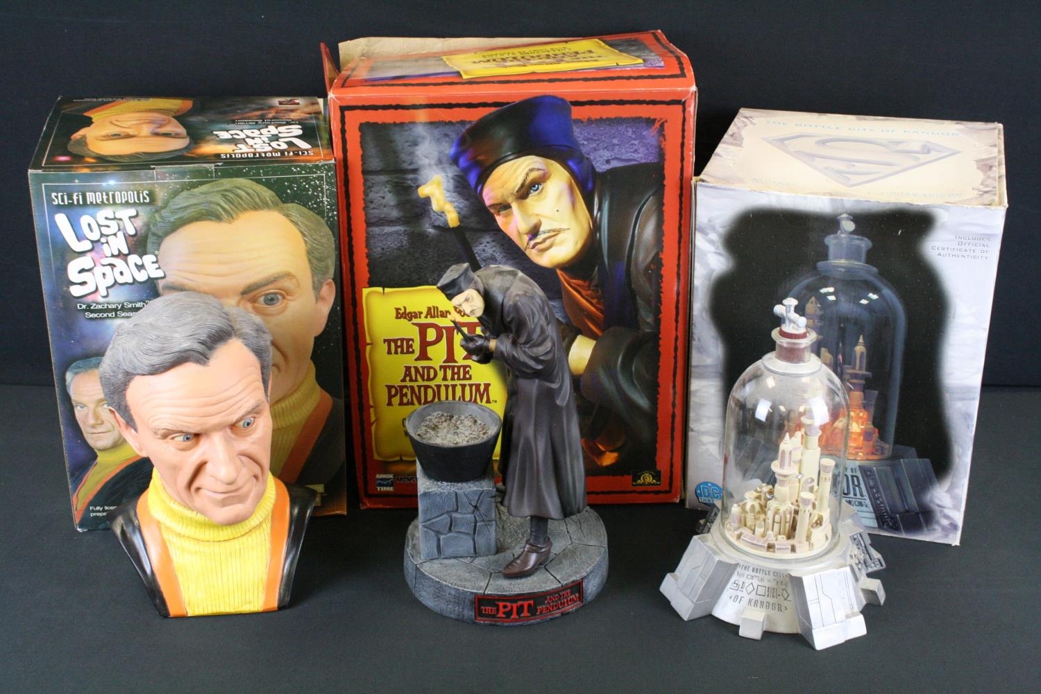 Three boxed Sci Fi collectibles to include DC Direct ltd edn The Bottle City Of Kandor, Root Factory Inc Lost In Space 3/4 ltd edn Dr Zachary Smith (142/150) & Amok Time Edgar Allan Poe's The Pit And The Pendulum Collectors Statue, boxes poor, figures gd overall, boxes poor