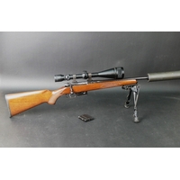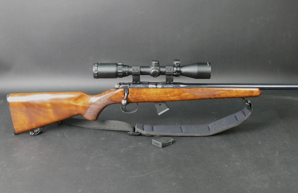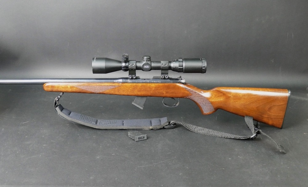 CZ452-2E cal 22 LR bolt action rifle, fitted with sound moderator and an AGS 3-9 x 40 telescopic sight with ten round and five round magazines and a Neoprene sling. Sound moderator no serial number. Rifle Serial No. A144530. FIREARMS CERTIFICATE REQUIRED X 2.