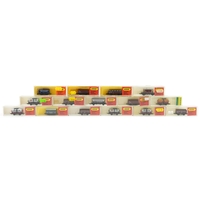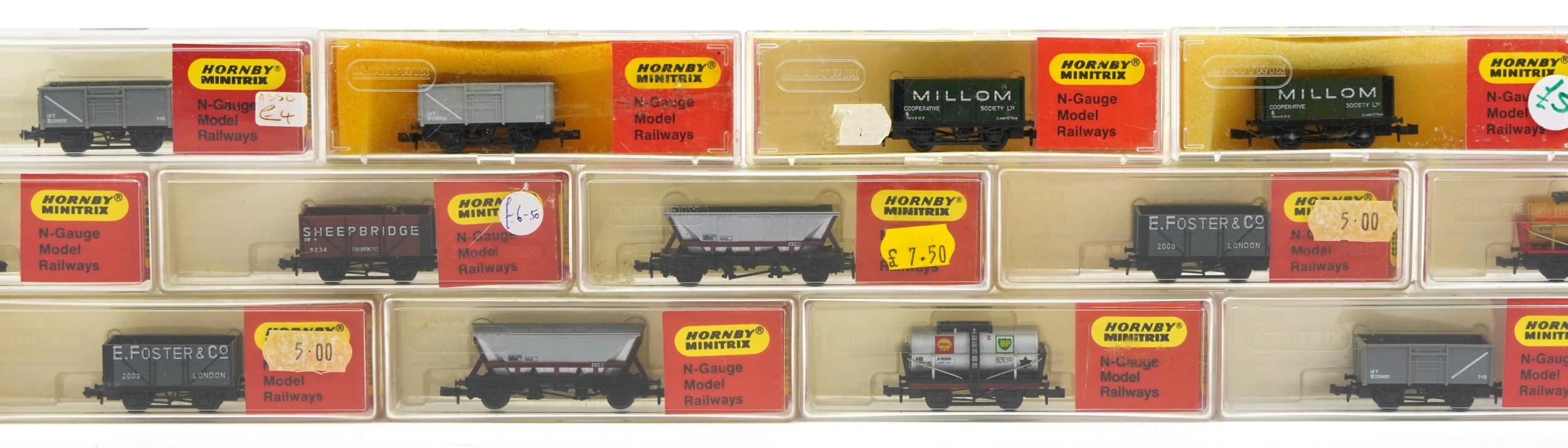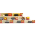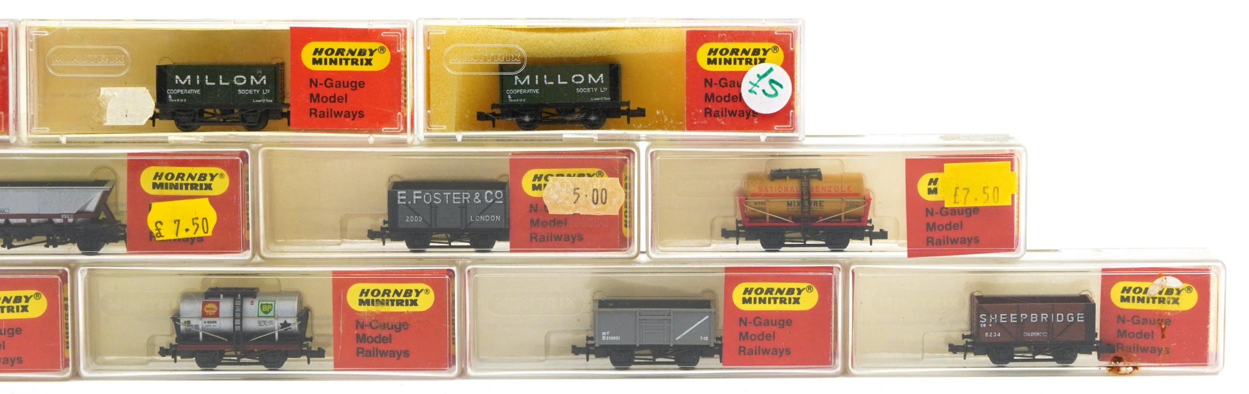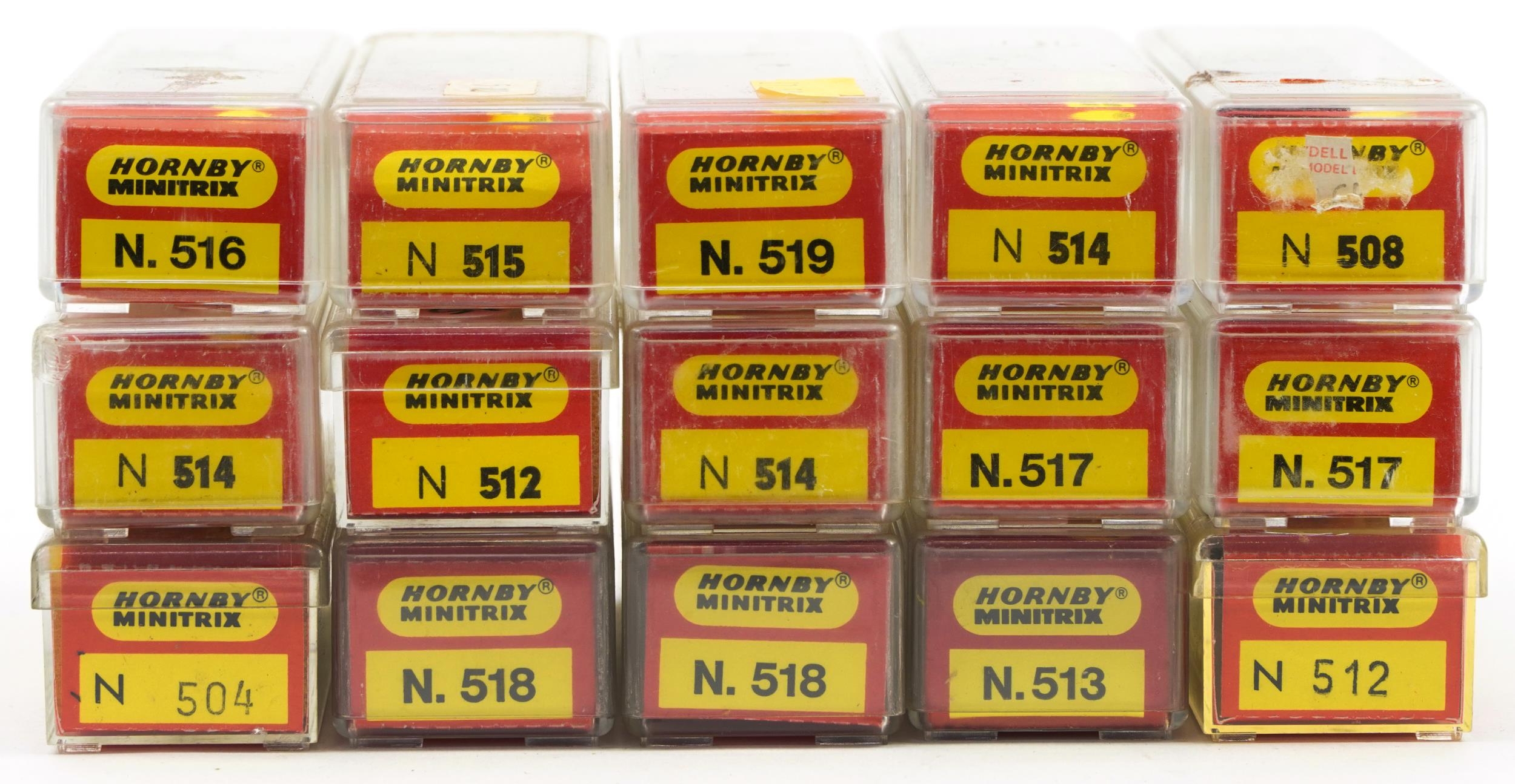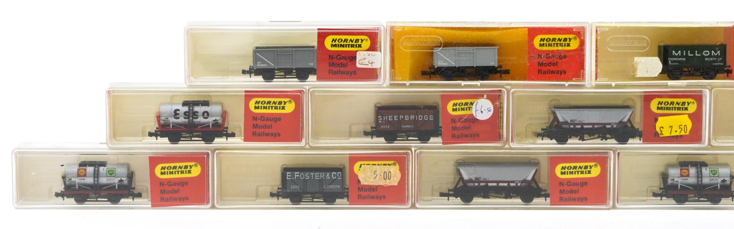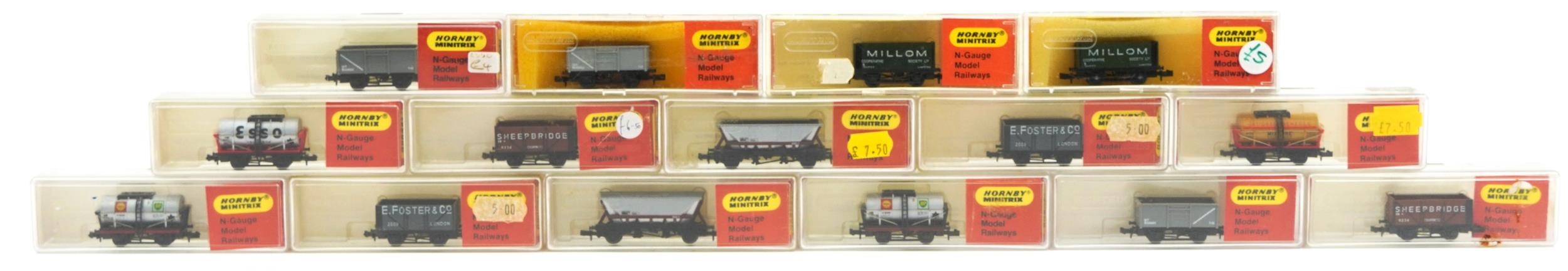 Fifteen Hornby Minitrix N gauge model railway tankers and wagons with cases