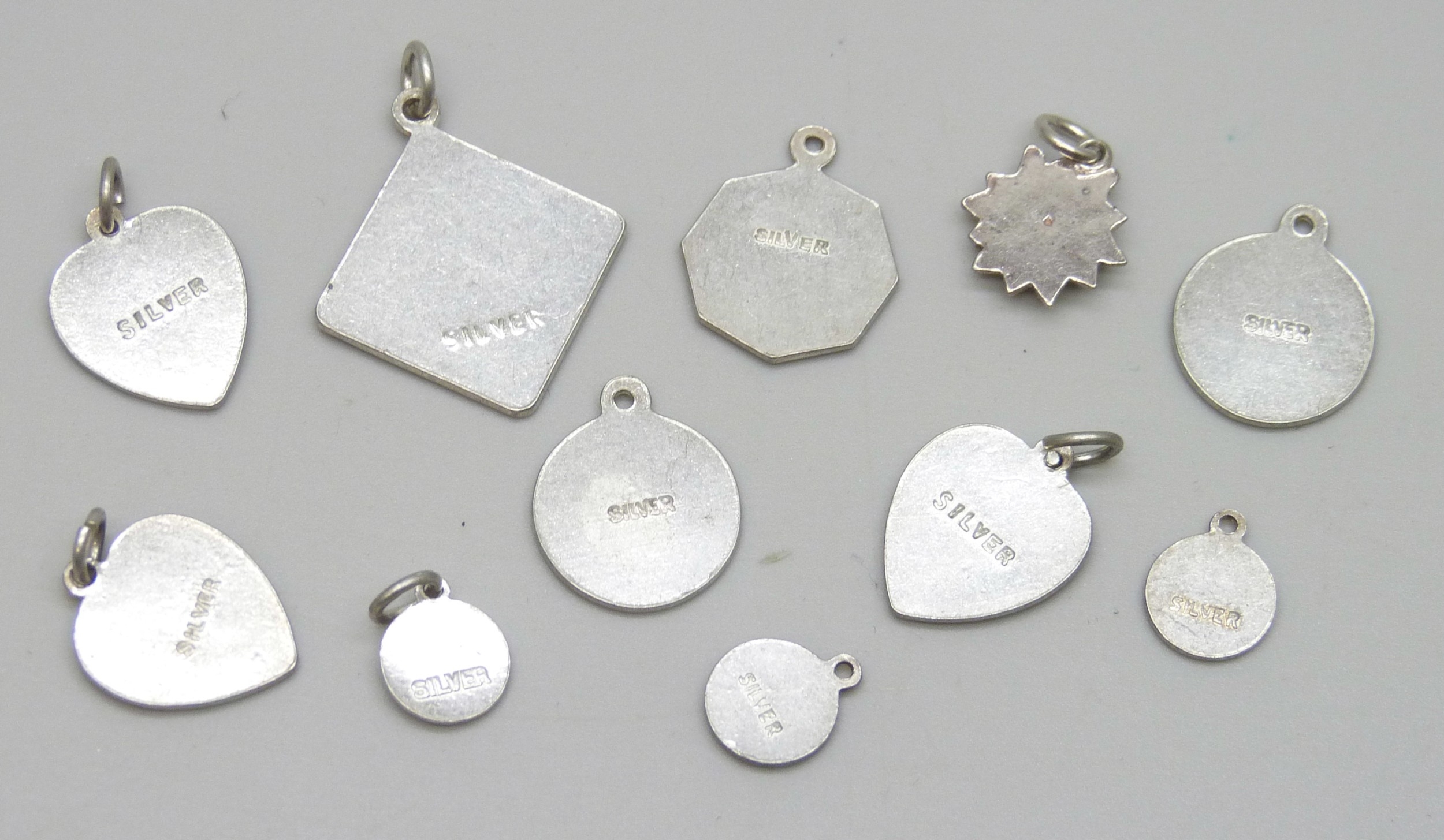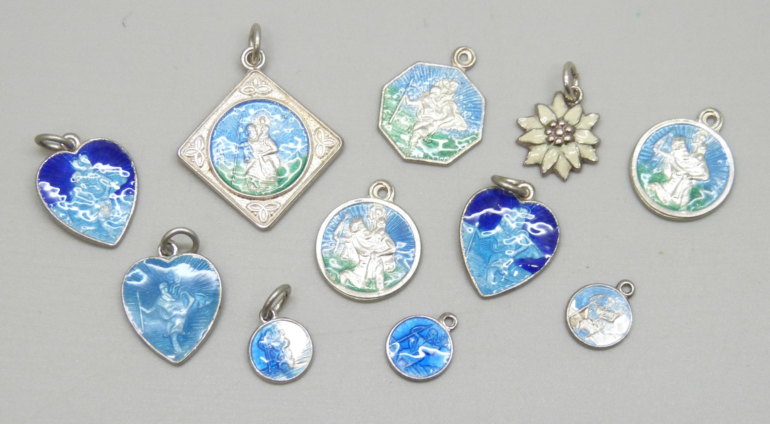 A collection of silver St Christopher pendants and charms, and a white metal flower pendant, 12.8g