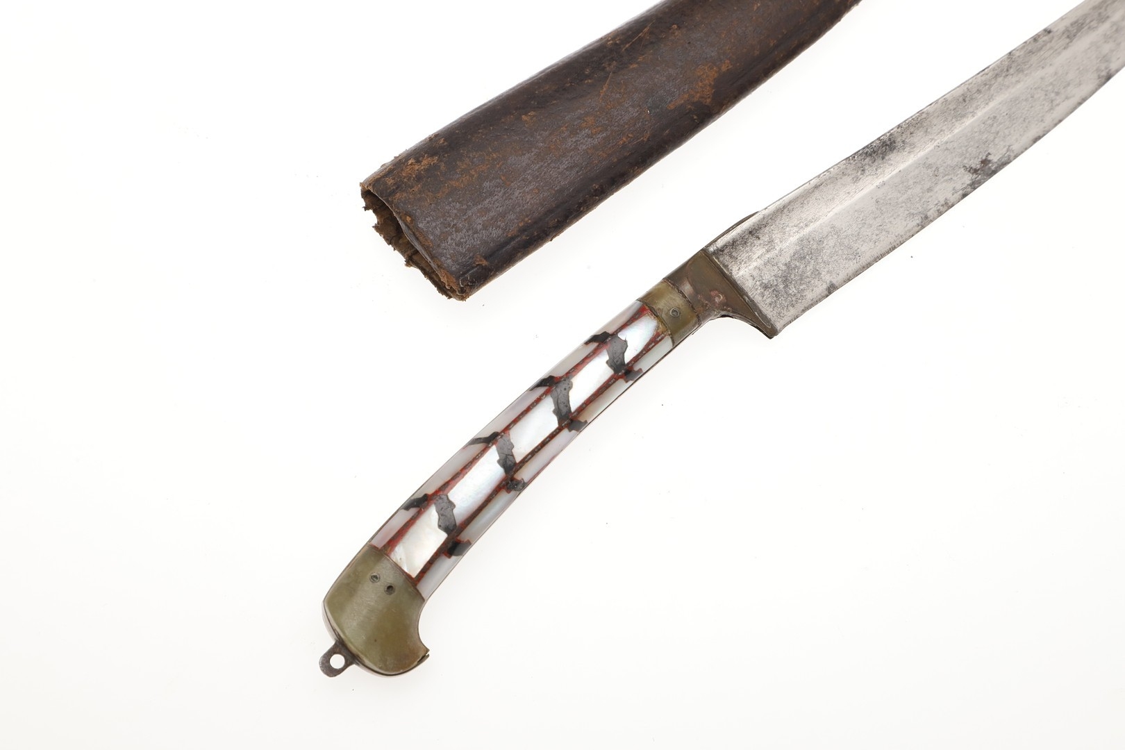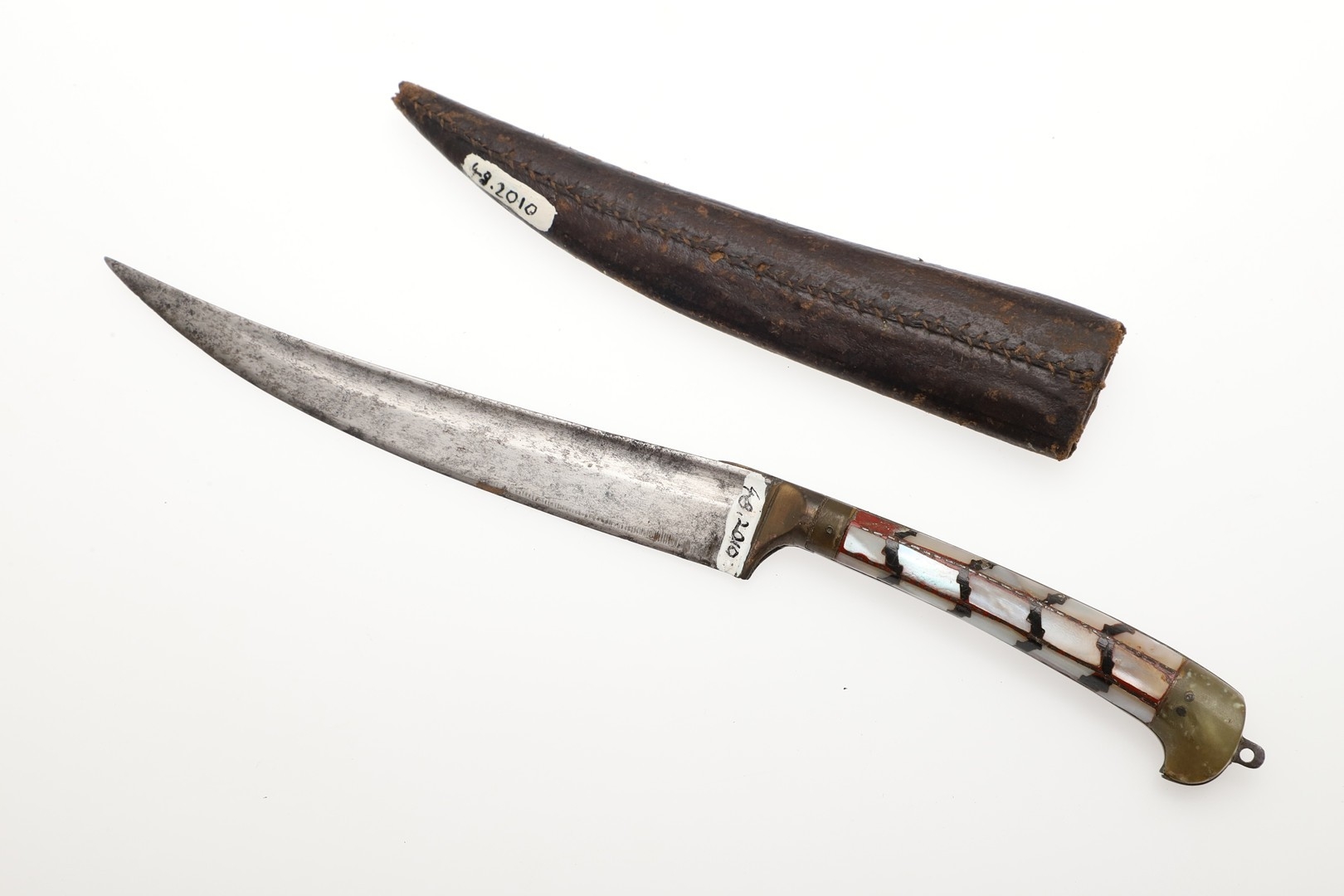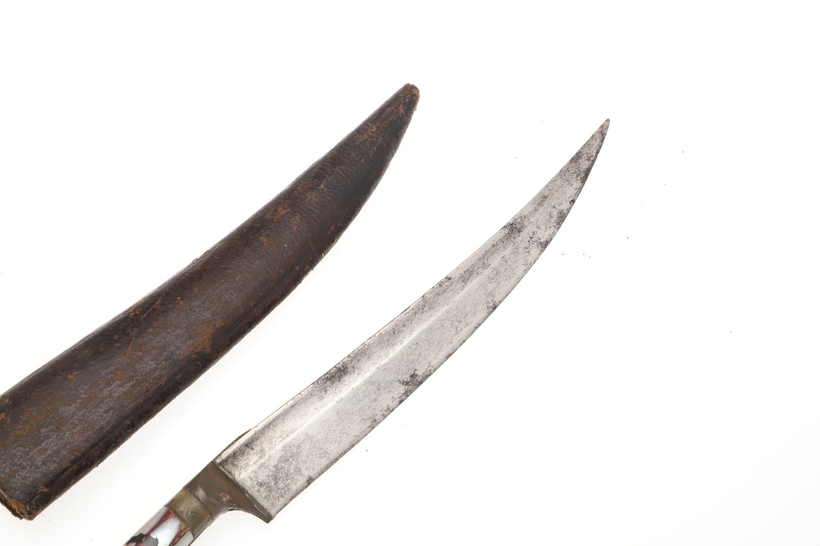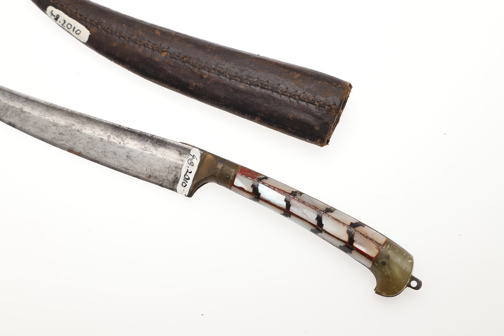 AN INDIAN OR AFGHAN CHURRA KNIFE WITH JADEITE GRIP. The 12 cm gently curved, pointed blade with a shallow fuller. On a decorative jadeite hilt set with mother of pearl panels. In a brown leather scabbard. 20.5 cm.