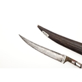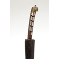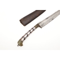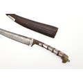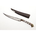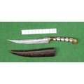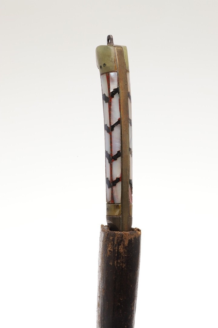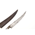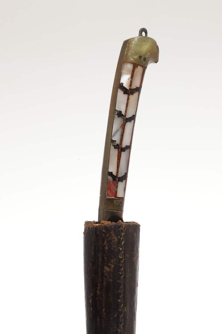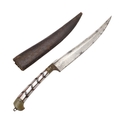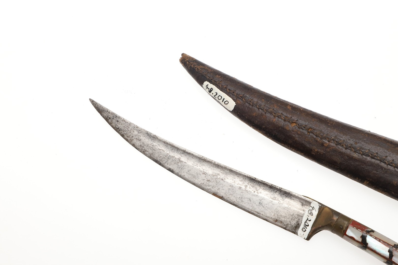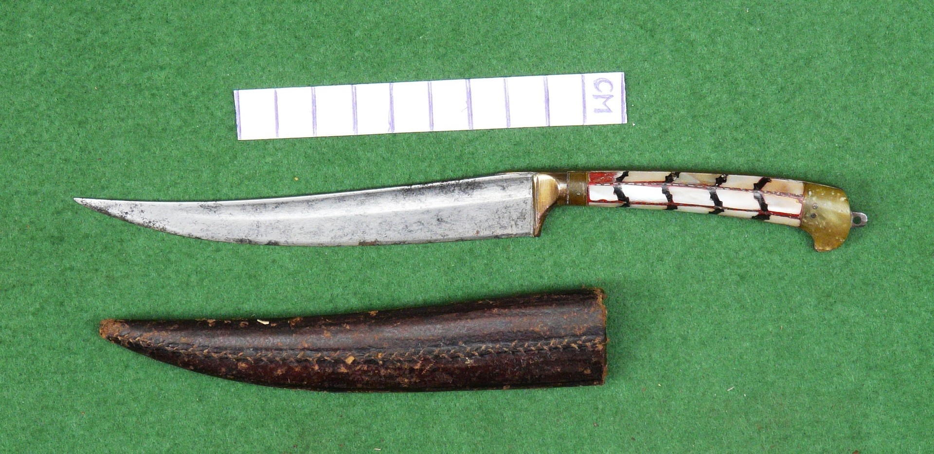 AN INDIAN OR AFGHAN CHURRA KNIFE WITH JADEITE GRIP. The 12 cm gently curved, pointed blade with a shallow fuller. On a decorative jadeite hilt set with mother of pearl panels. In a brown leather scabbard. 20.5 cm.