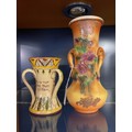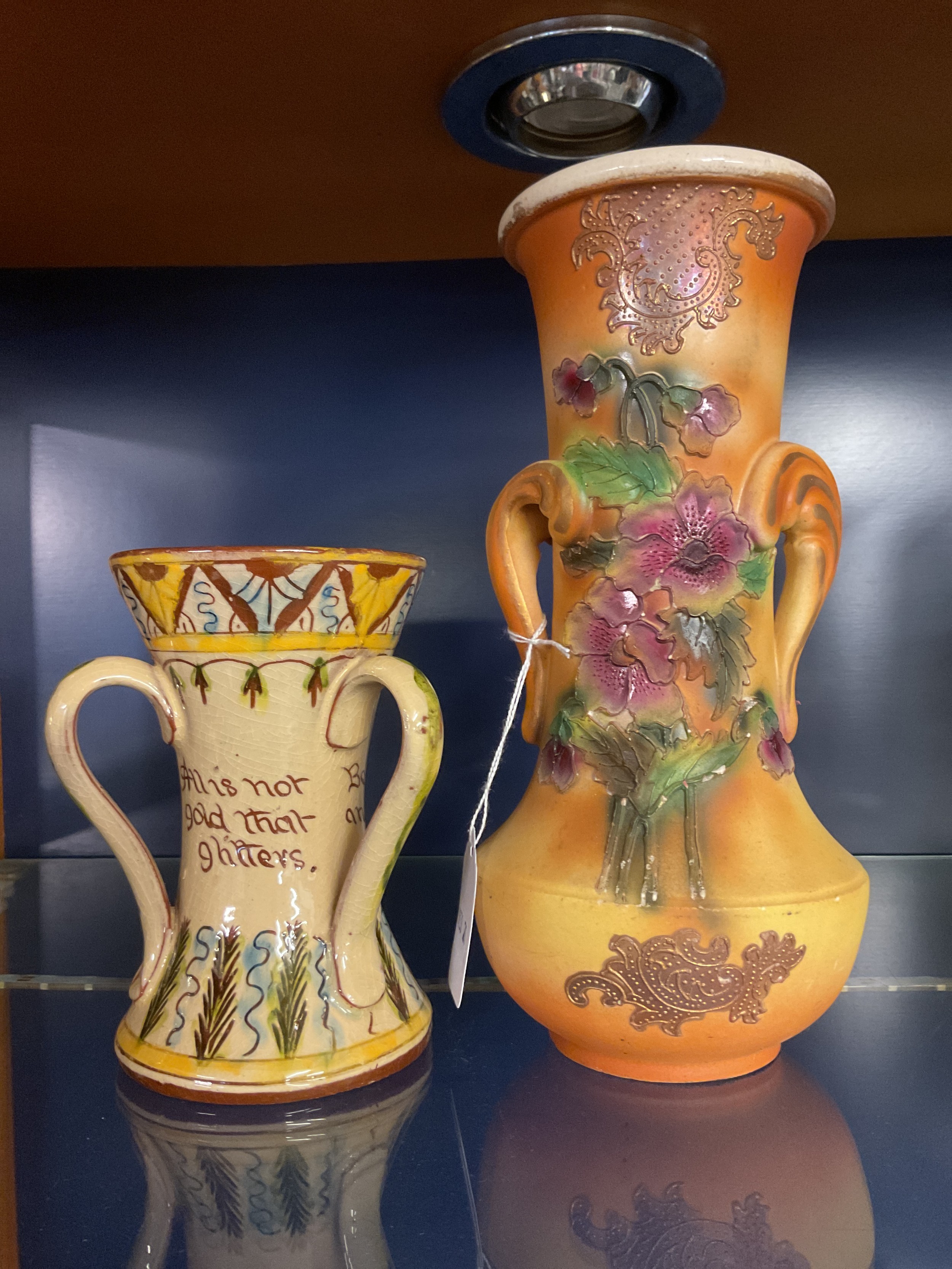 A hand-painted ceramic vase with floral decoration together with a pottery motto-ware tyg