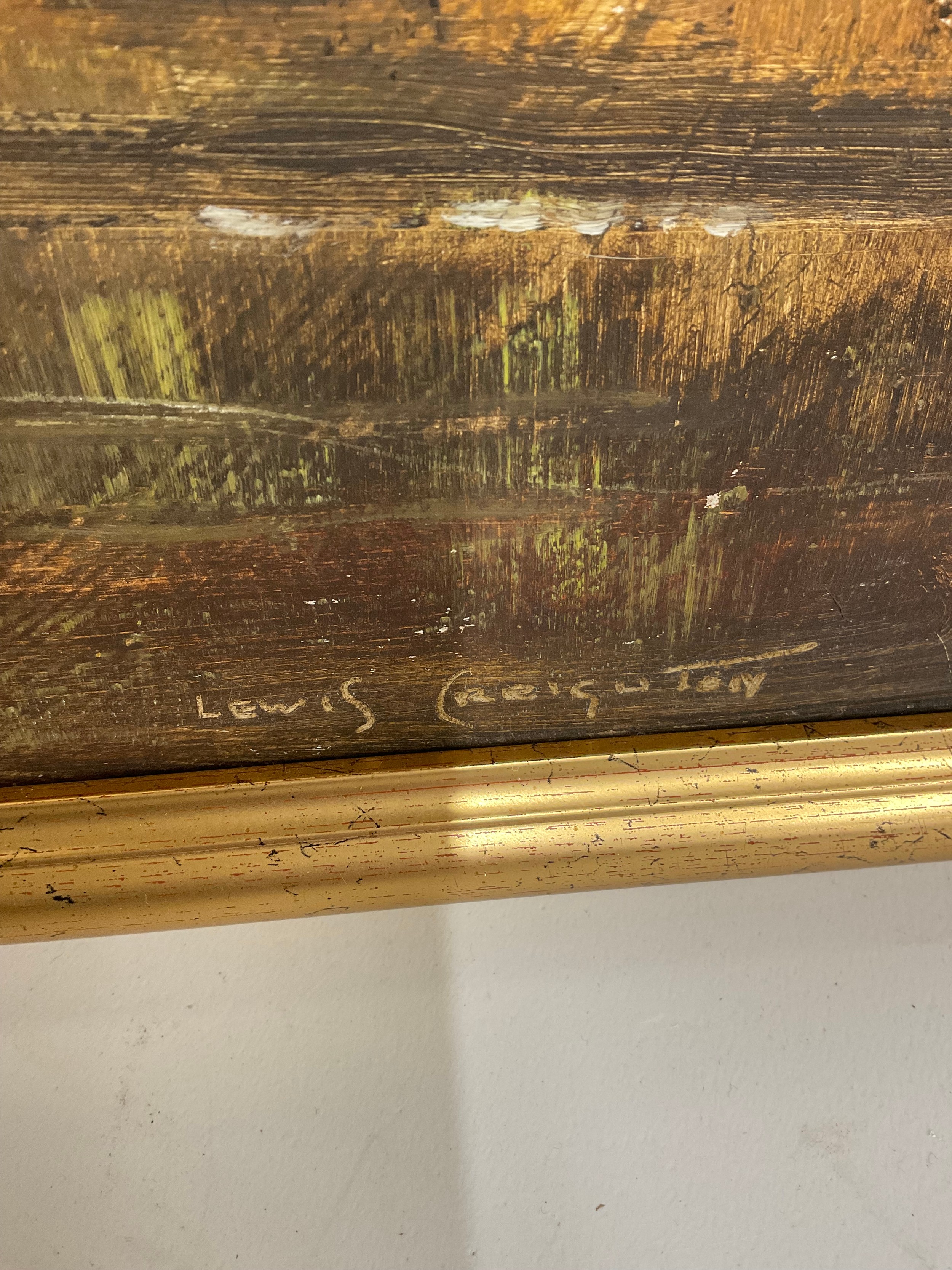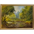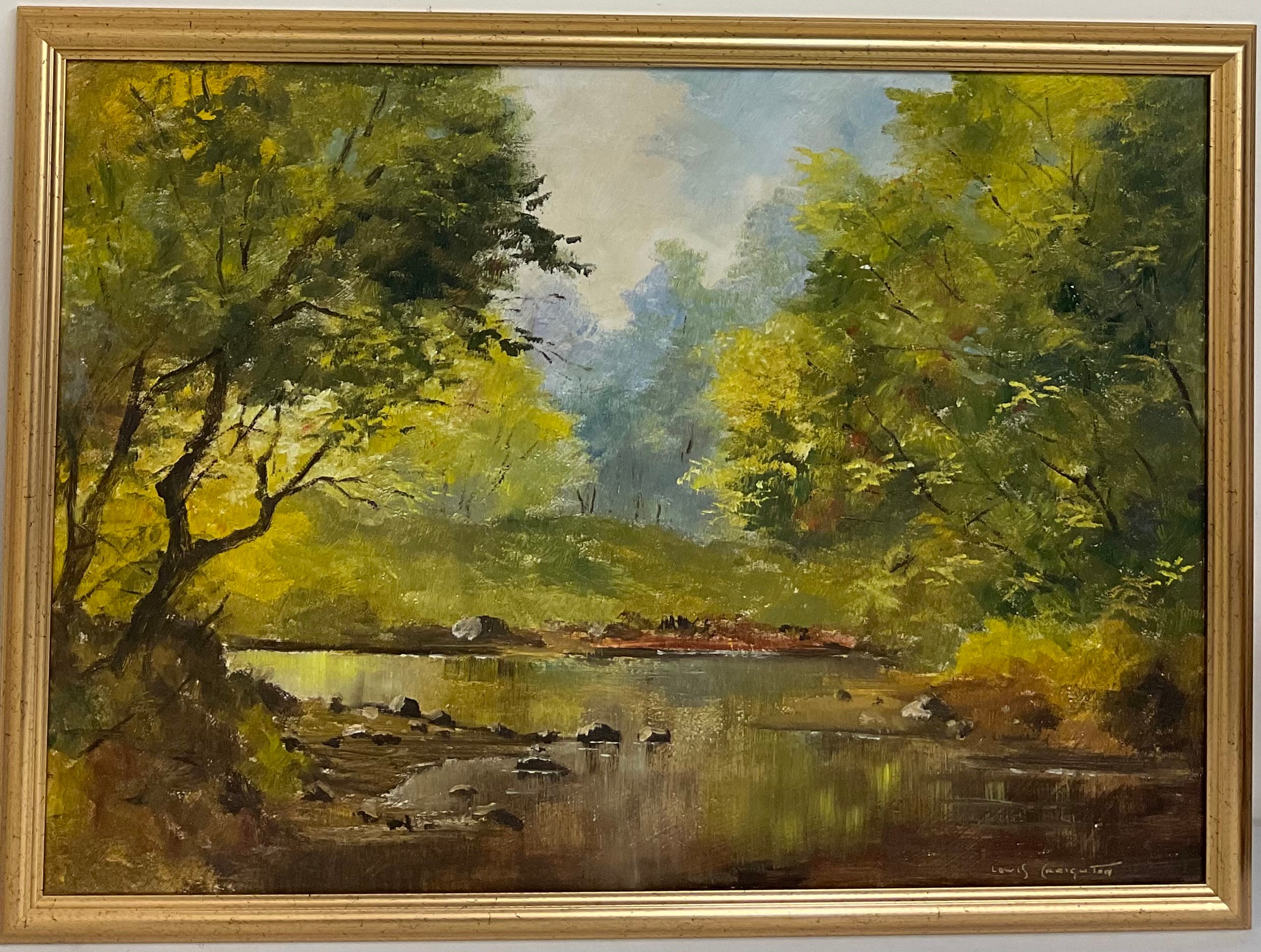 Lewis Creighton (British 1918-1996); Wooded river landscape, oil on board, signed, 50cm x 70cm