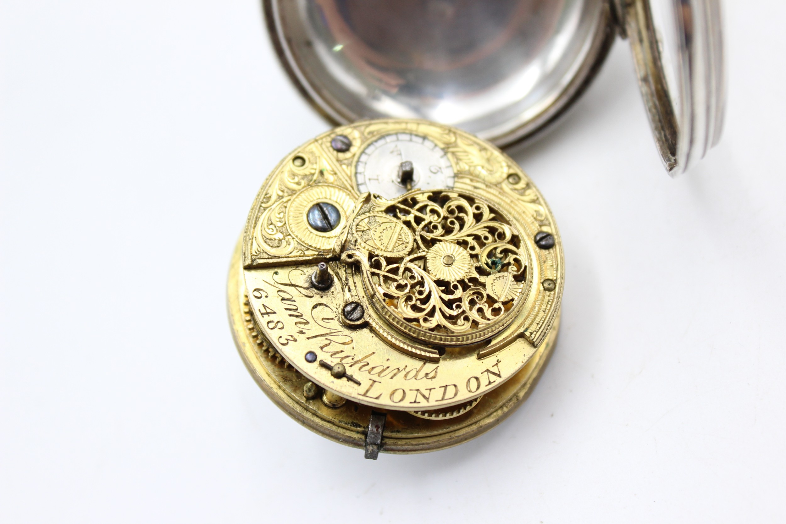 Antique Hallmarked .925 SILVER Verge Fusee Open Face POCKET WATCH Key-Wind SPARES & REPAIRS Maker - Samual Richards London No Code on Case Code on Movement - 6483 Dimensions - 5cm x 6cm In antique condition Signs of use & wear Balance wheel is free, movement is escaping and runs intermittently Dial has a chip at the 10 o'clock position See photographs