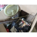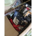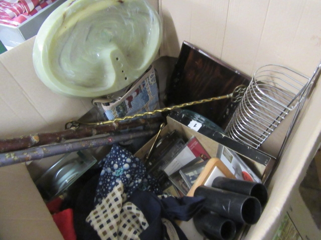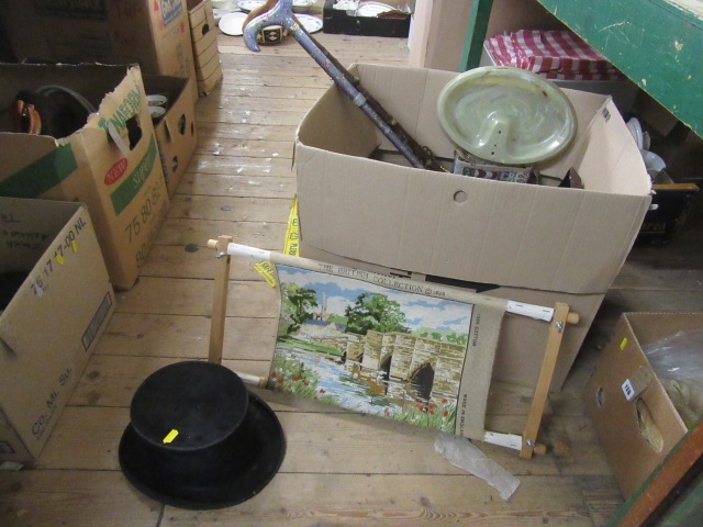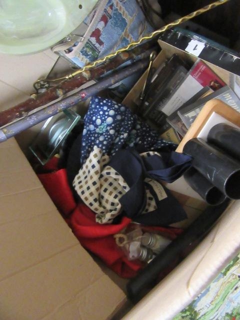 BOX OF MISCELLANEOUS INCLUDING TWO WALKING STICKS ETC