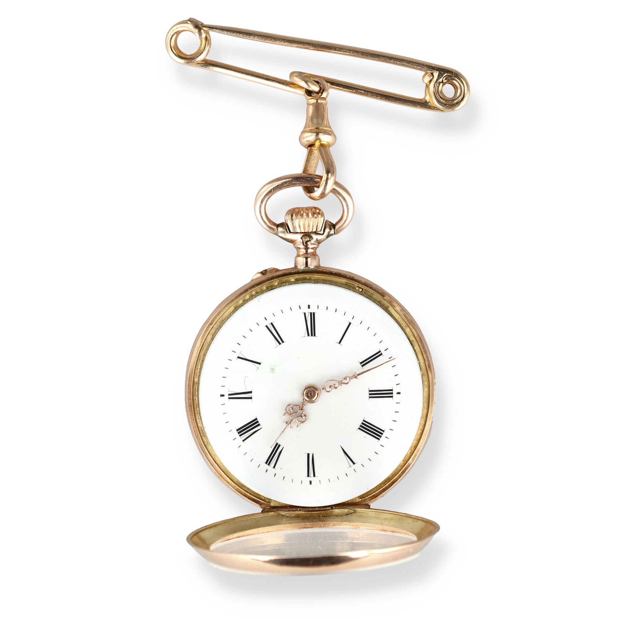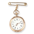 A 14CT GOLD FOB WATCH ON 15CT GOLD PIN Weight: 30.8gms...