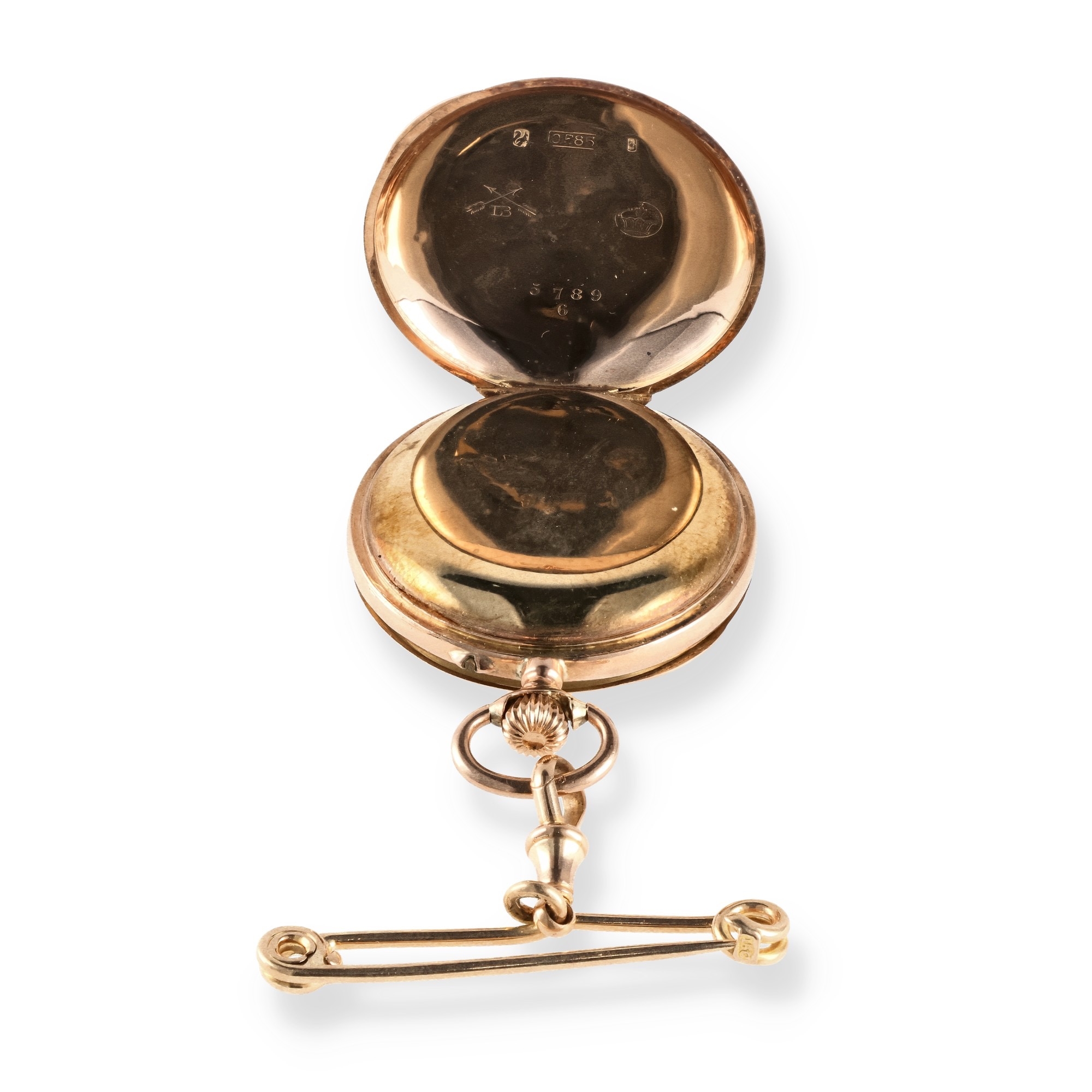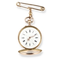 A 14CT GOLD FOB WATCH ON 15CT GOLD PIN