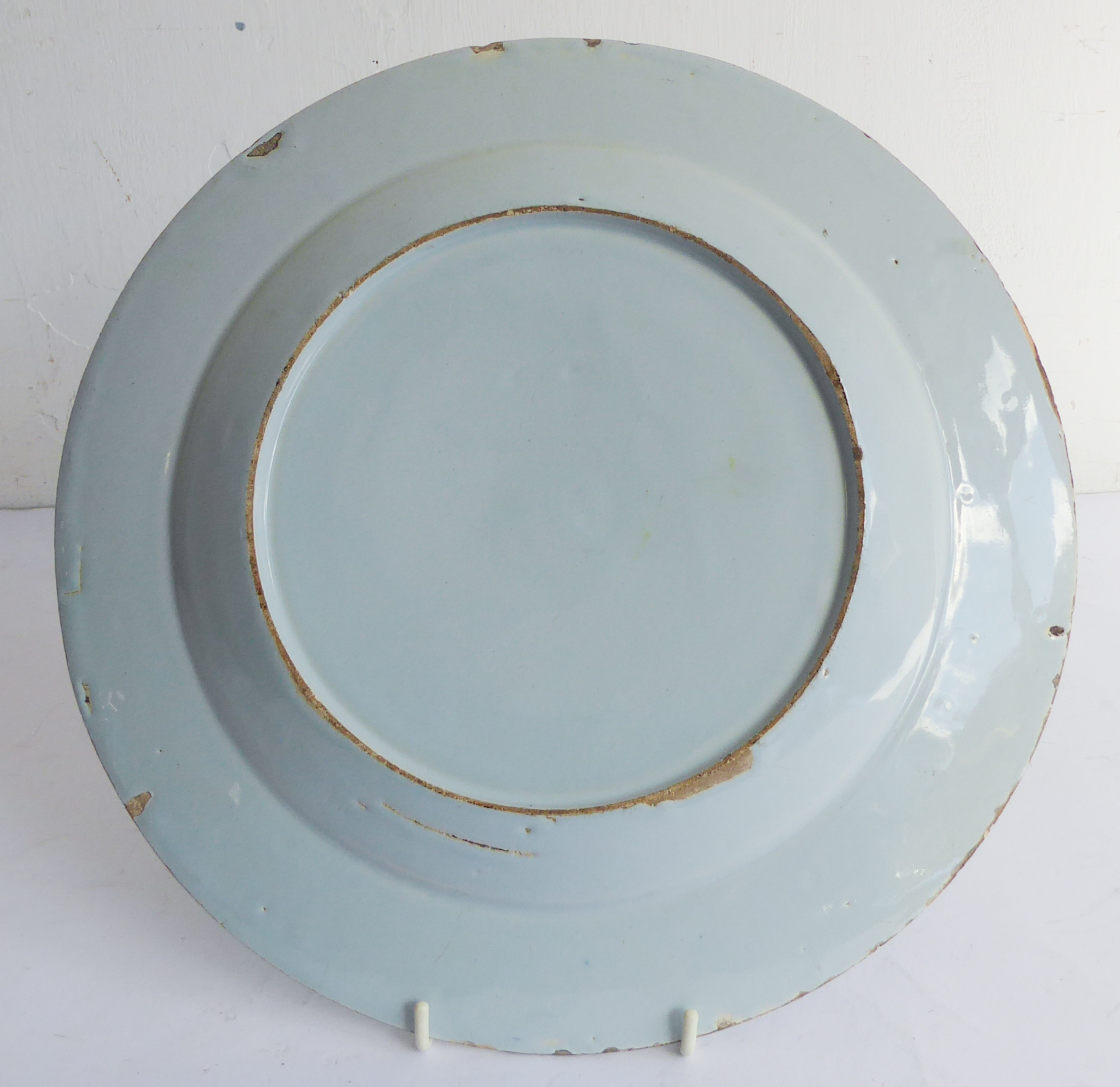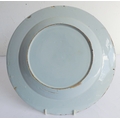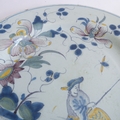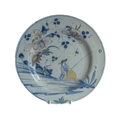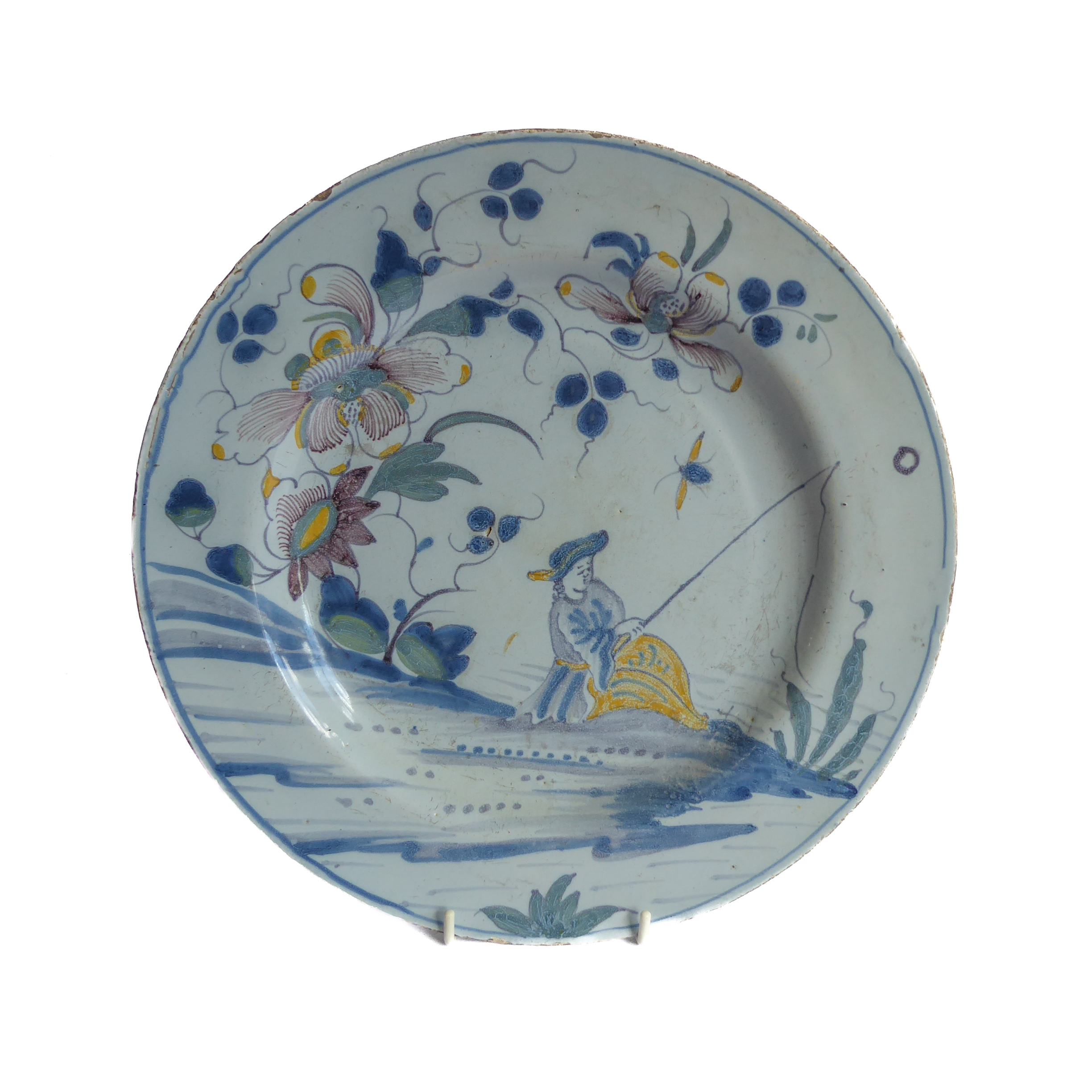 An 18th century tin-glazed earthenware (Delft) charger: polychrome-decorated with a lone fisherman below shrubs and flowerheads; English, probably London (29.75 cm in diameter)