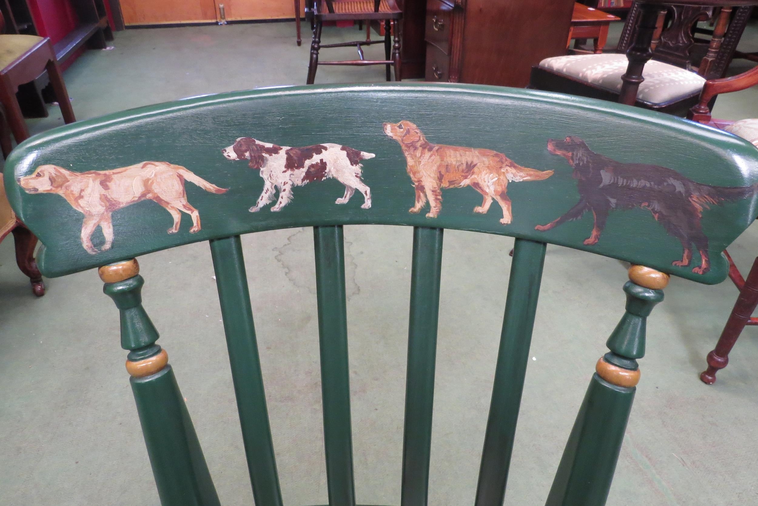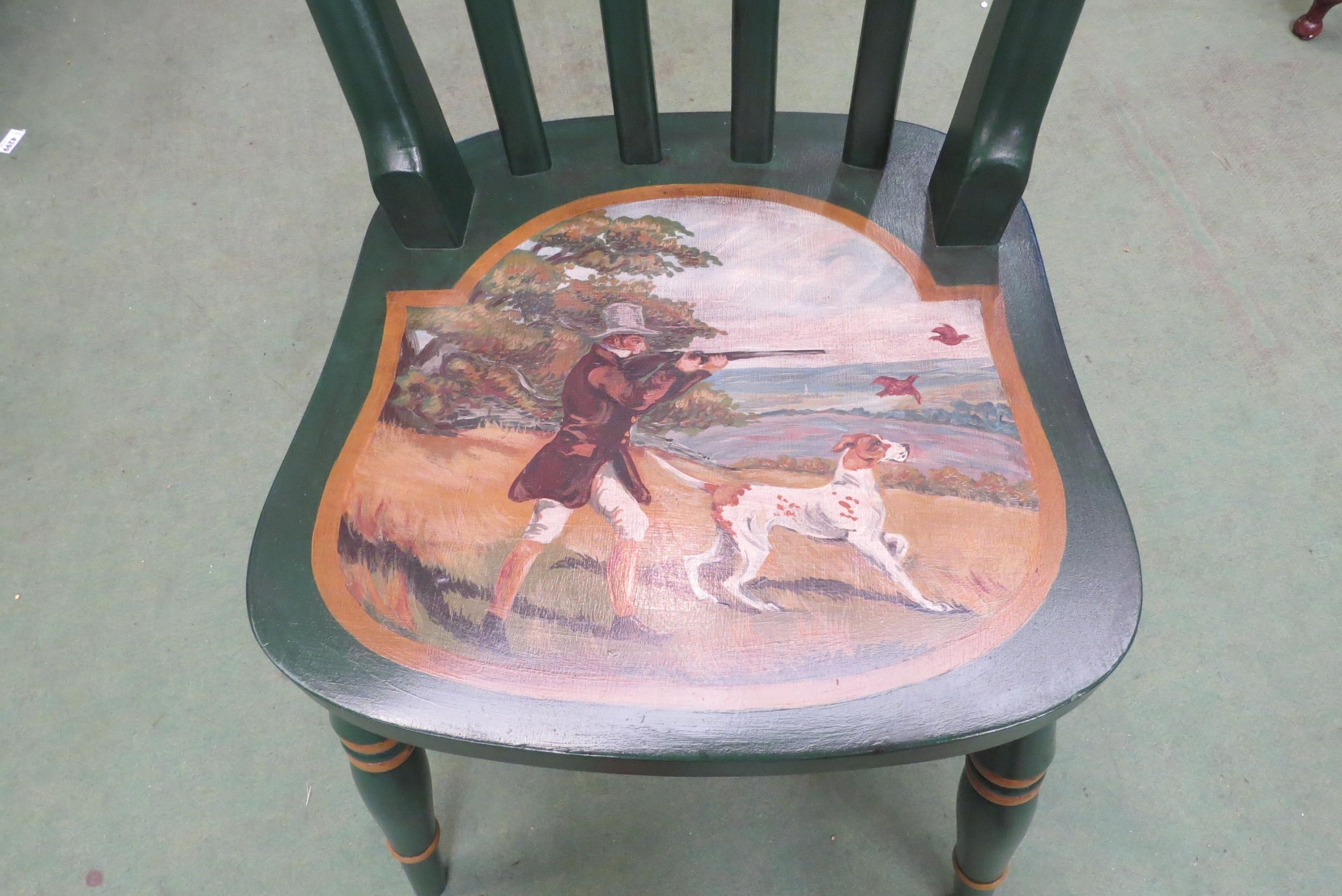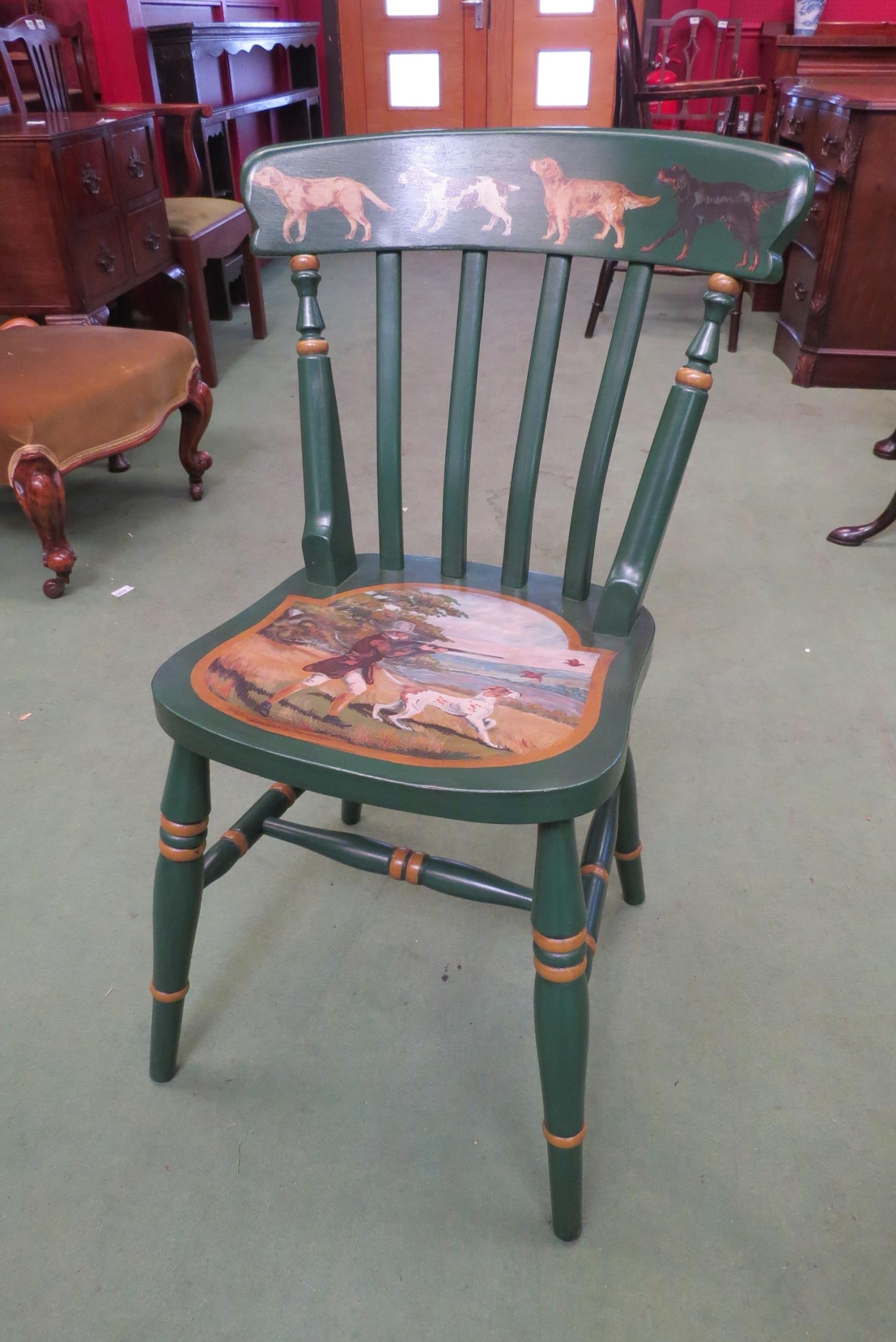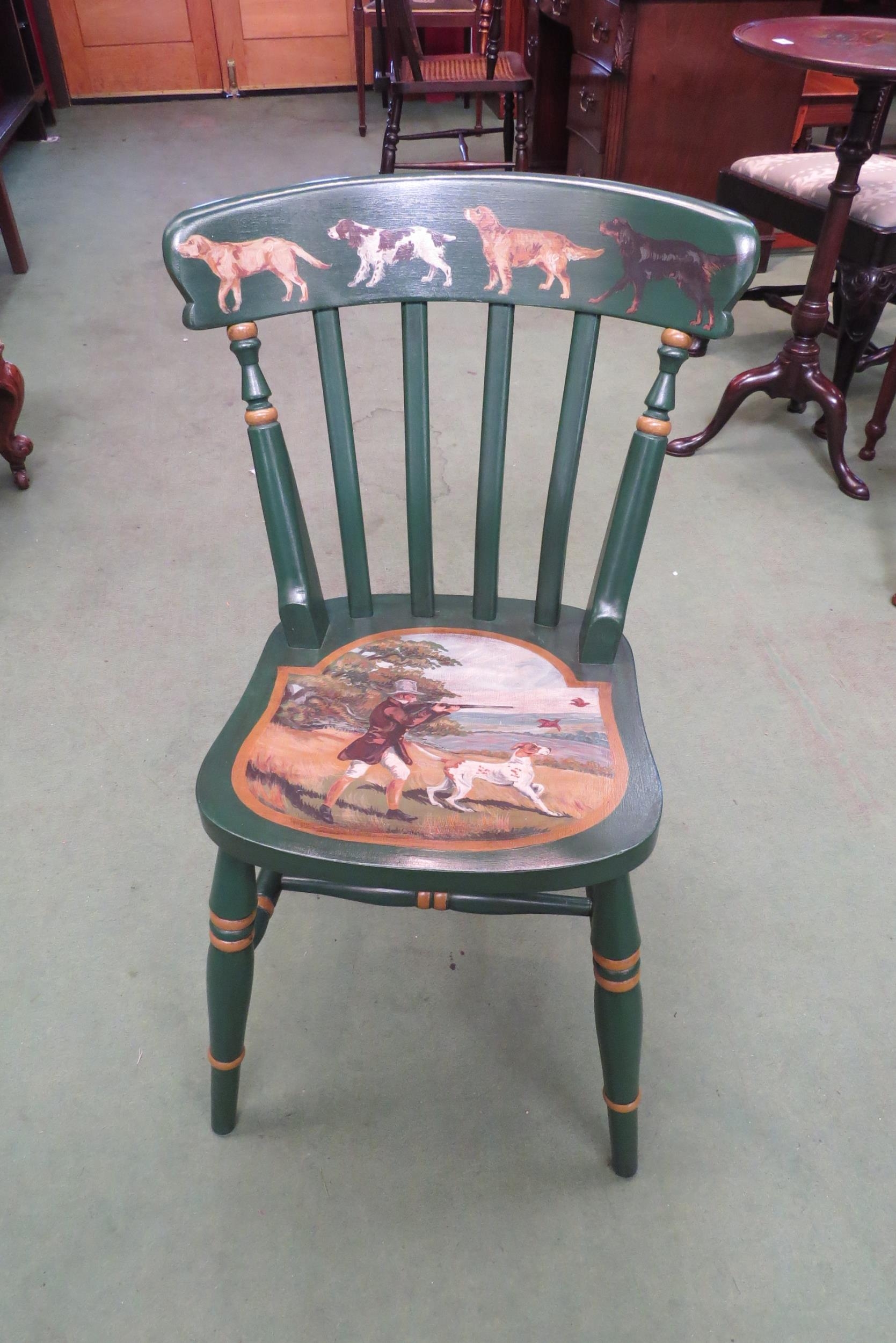 A hand painted Victorian style lathe back chair with gamekeeper and dogs decoration