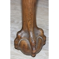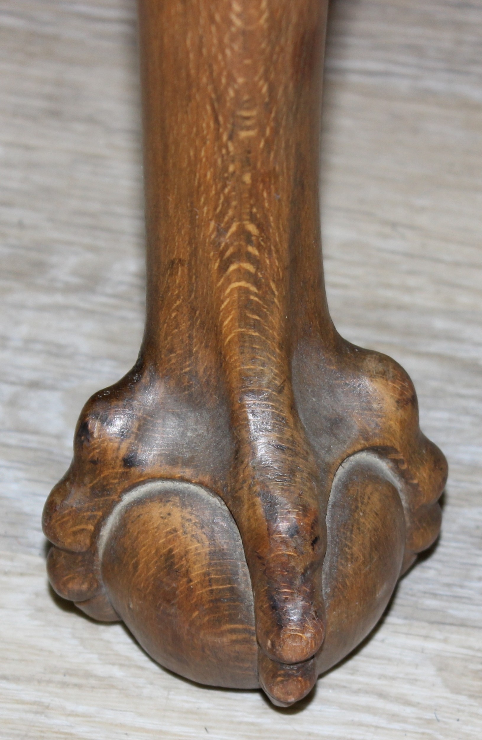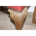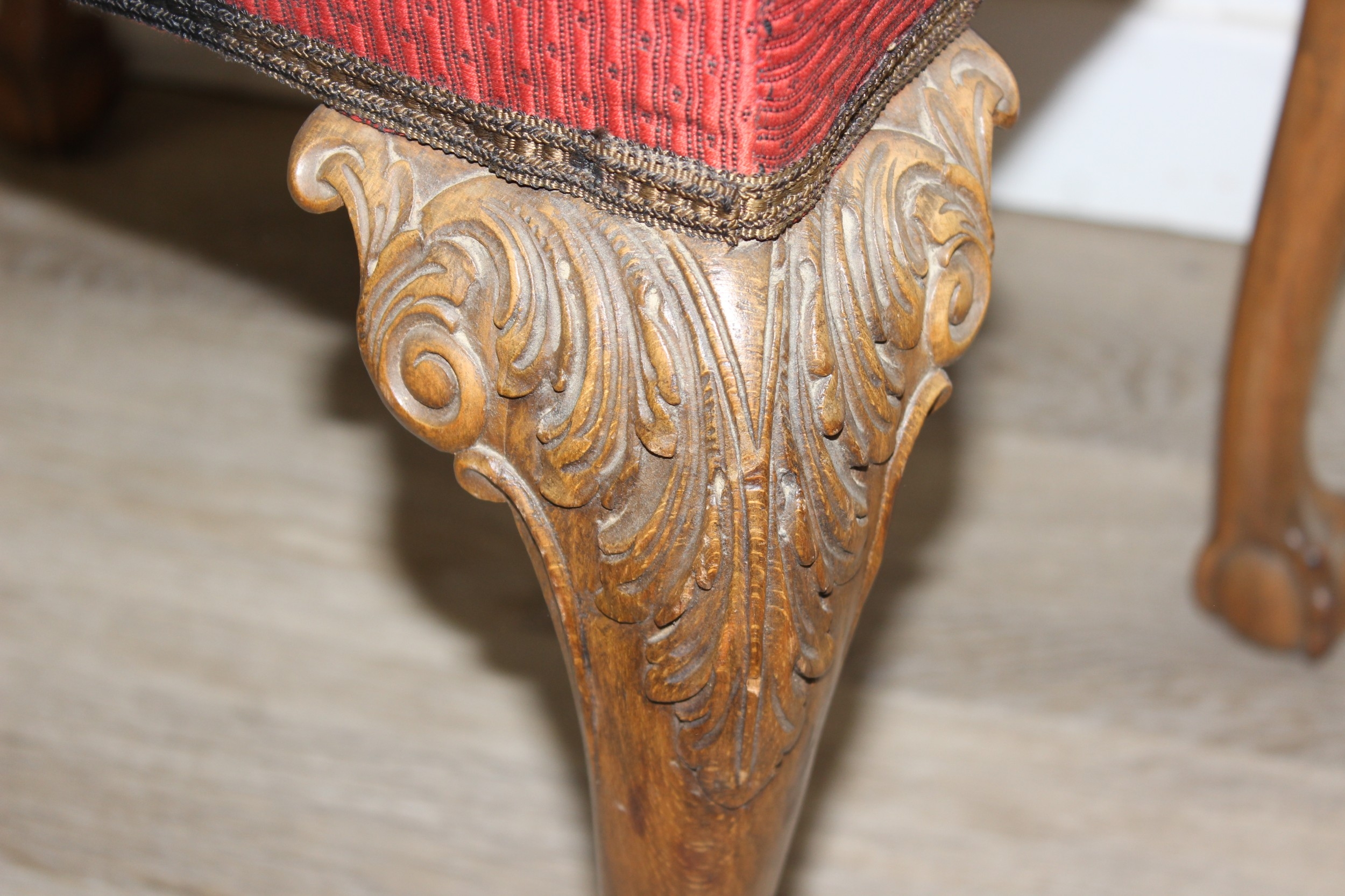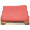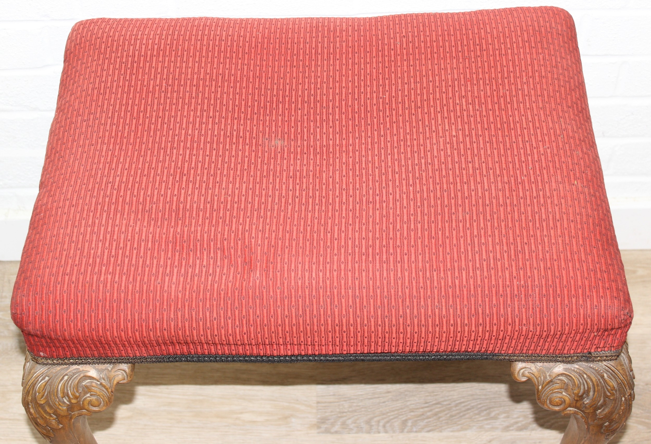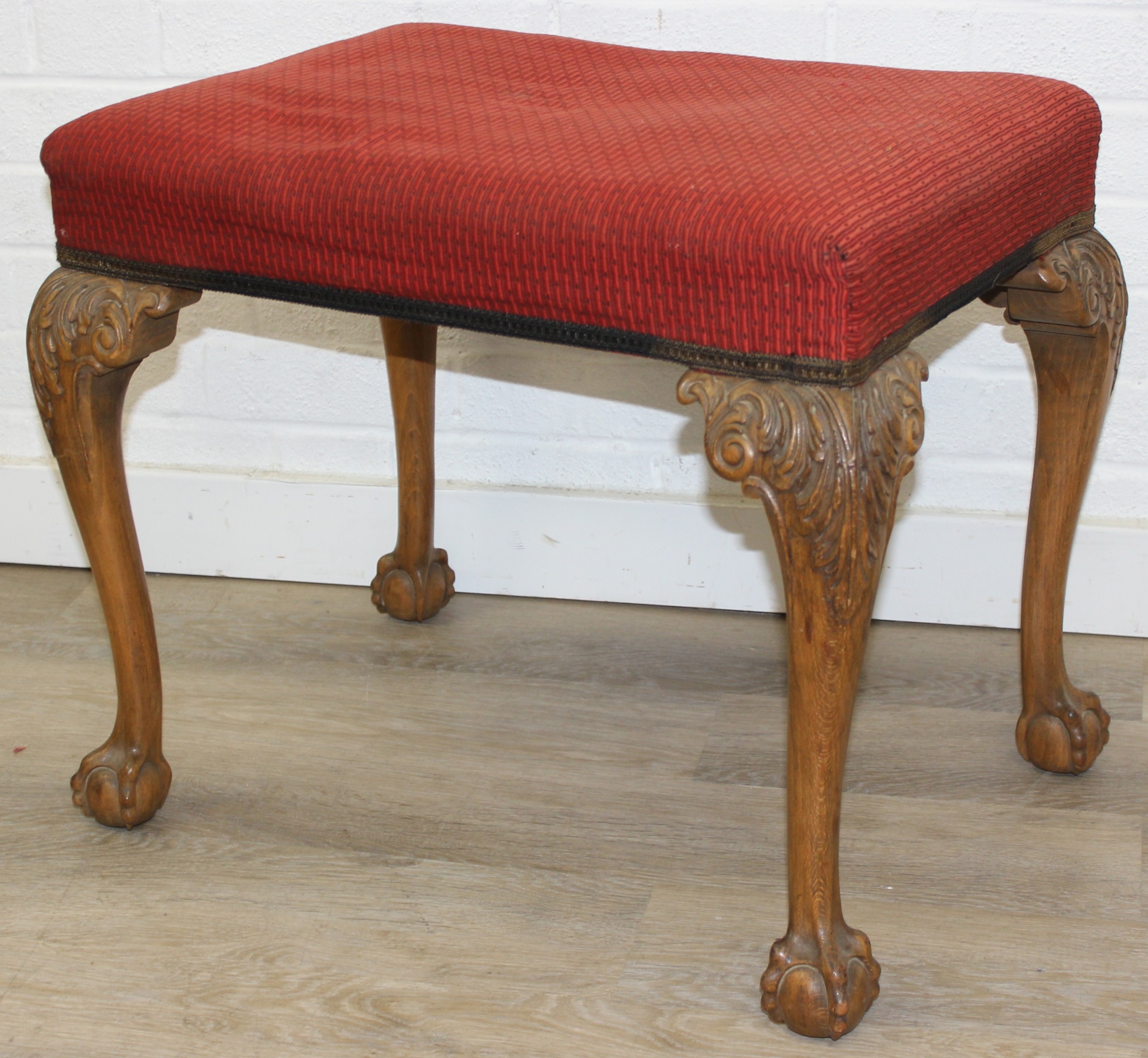 A vintage stool with cabriole legs and ball and claw feet, red upholstered top, 63cm x 47cm x 50cm