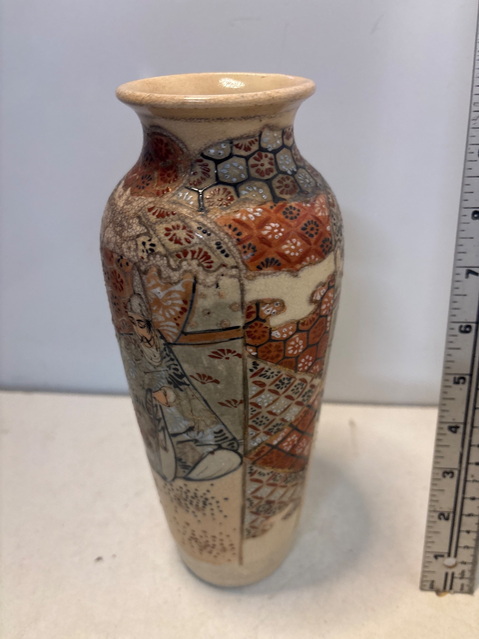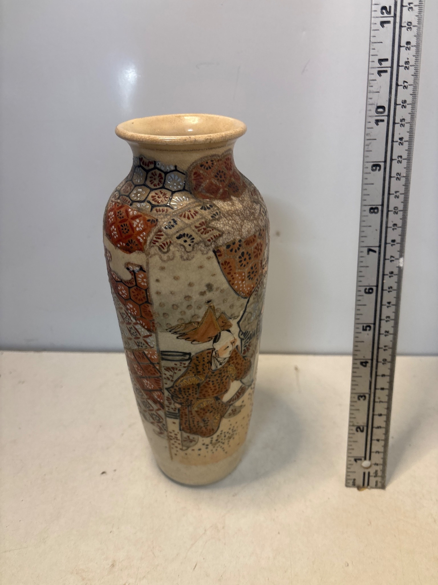 Hand-painted Japanese ceramic vase with detailed motifs.
