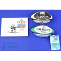 RWC 1999/2003 Miniature Rugby Balls/Rugby Cartoon Book (3): Two 6" x 3" Gilbert RWC leather-look mini balls: 1999 black/white Guinness, 2003 green/blue/white (new with tags); and Bill Stott's small h/back cartoon book, 'The Crazy World of Rugby'. VG