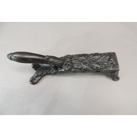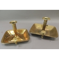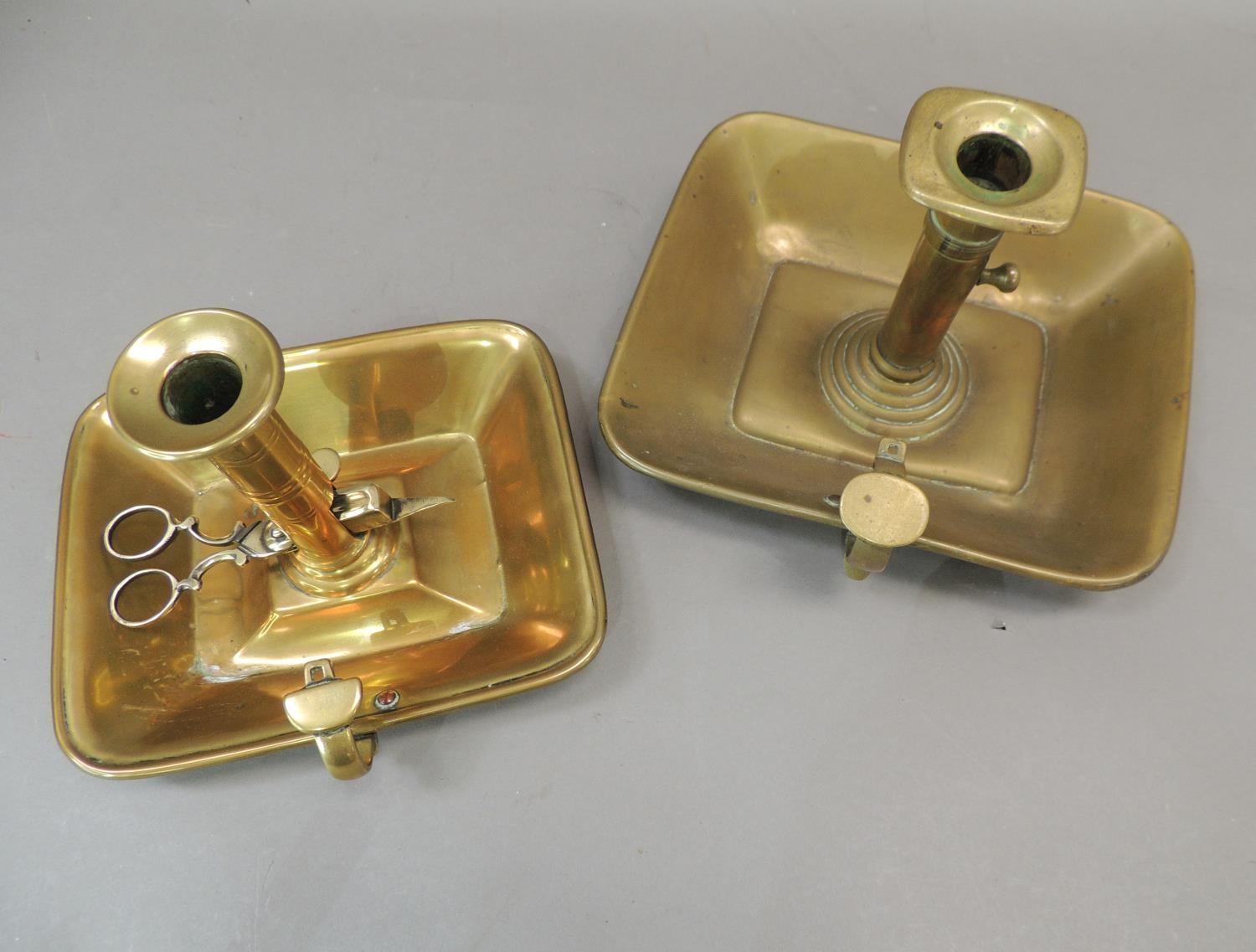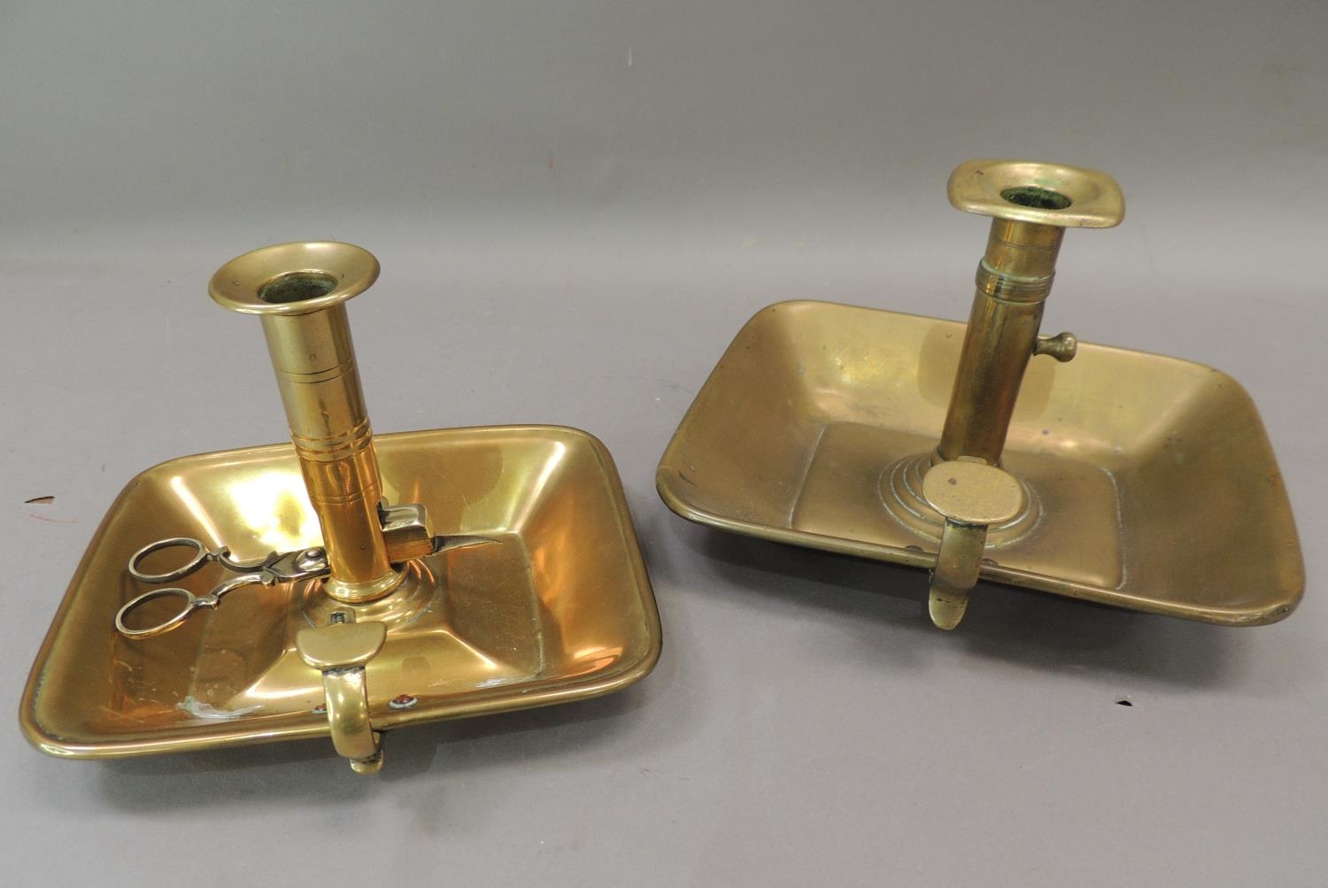 Two Victorian brass chamber sticks, one with pair of candle snuffers, both lacking conical snuffers, 20.5cm and smaller