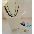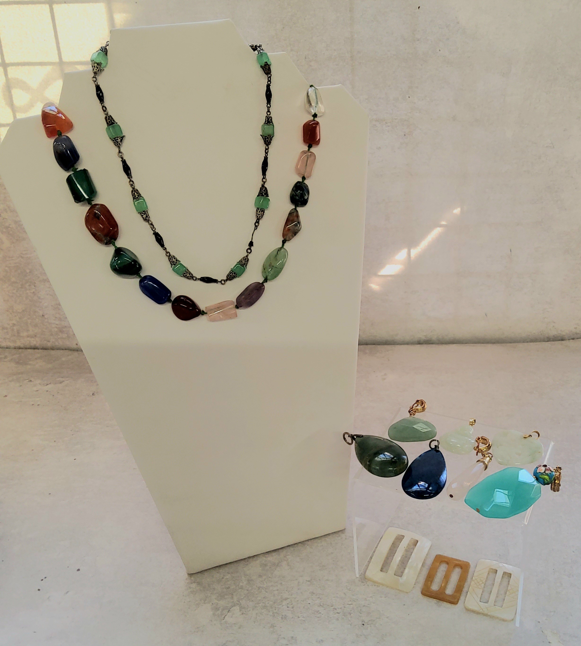 A jadite pendant in the form of bhudda; another Chinese love symbol heart shaped pendant; a Lapis Lazuli teardrop pendant; another spinach agate; a specimen stone necklace; two mother of pearl belt buckles etc.