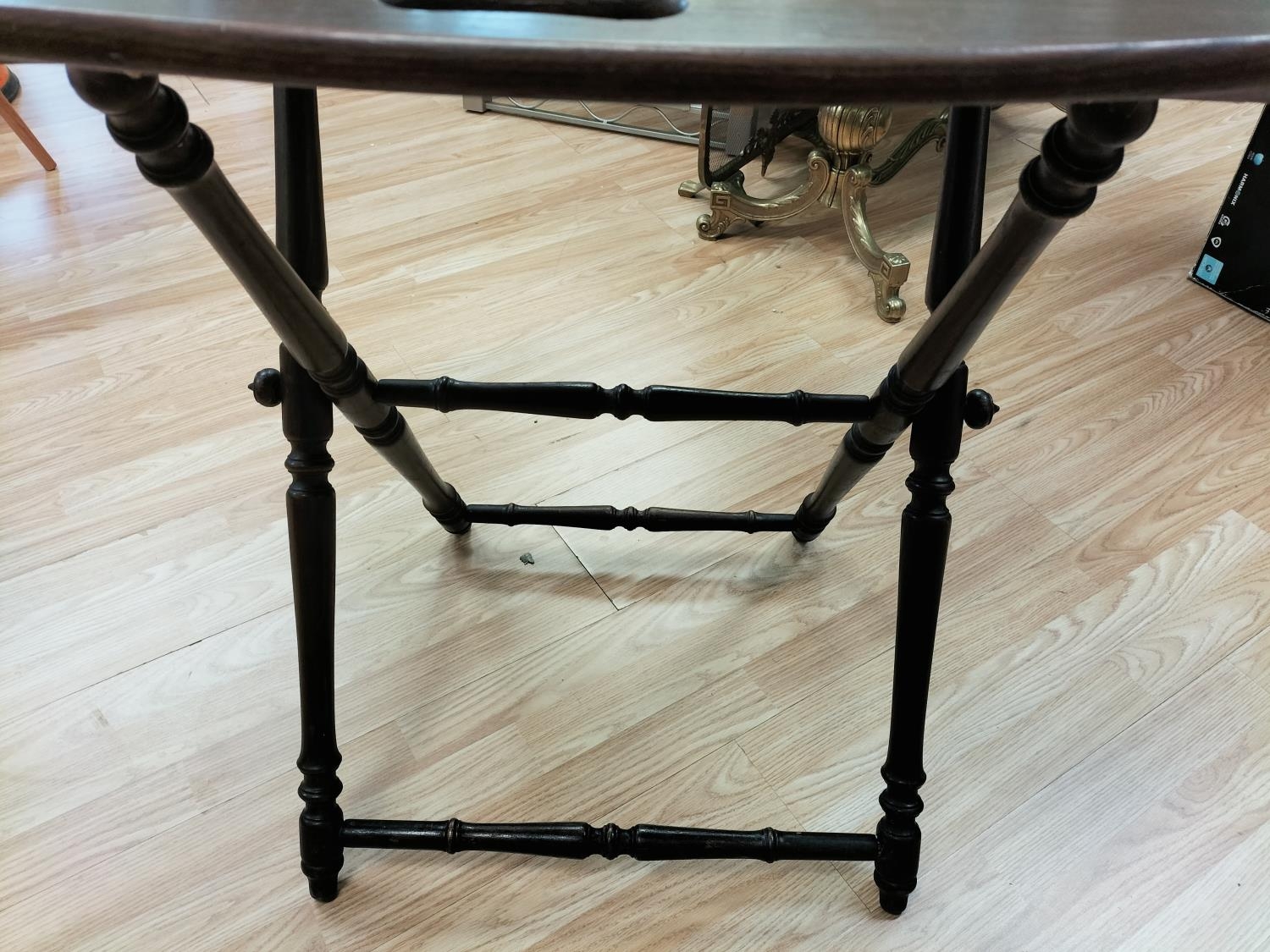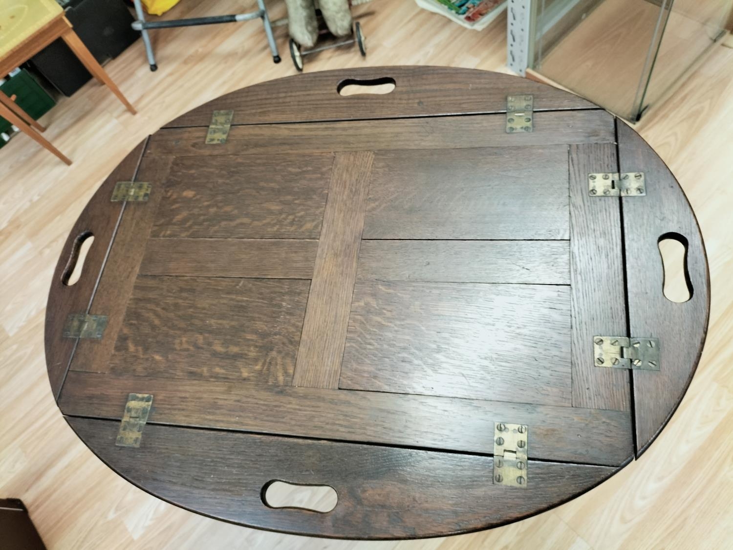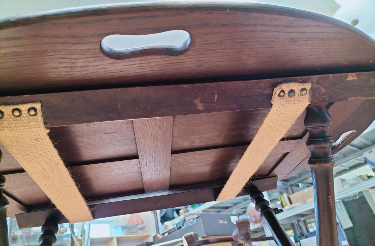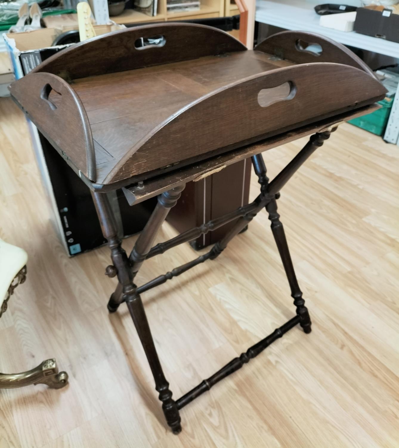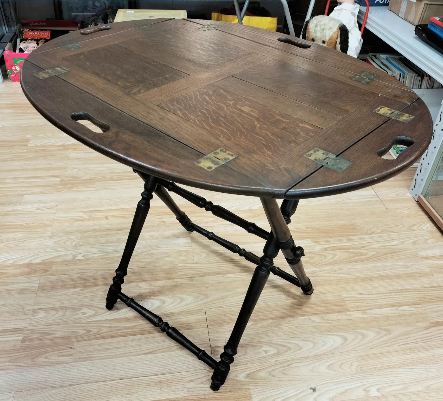 Butler Table with Brass Hinges and Stand. Closed measures 84cm High, 70cm x 47cm. Open measures 75cm High, 86cm x 65cm.