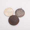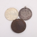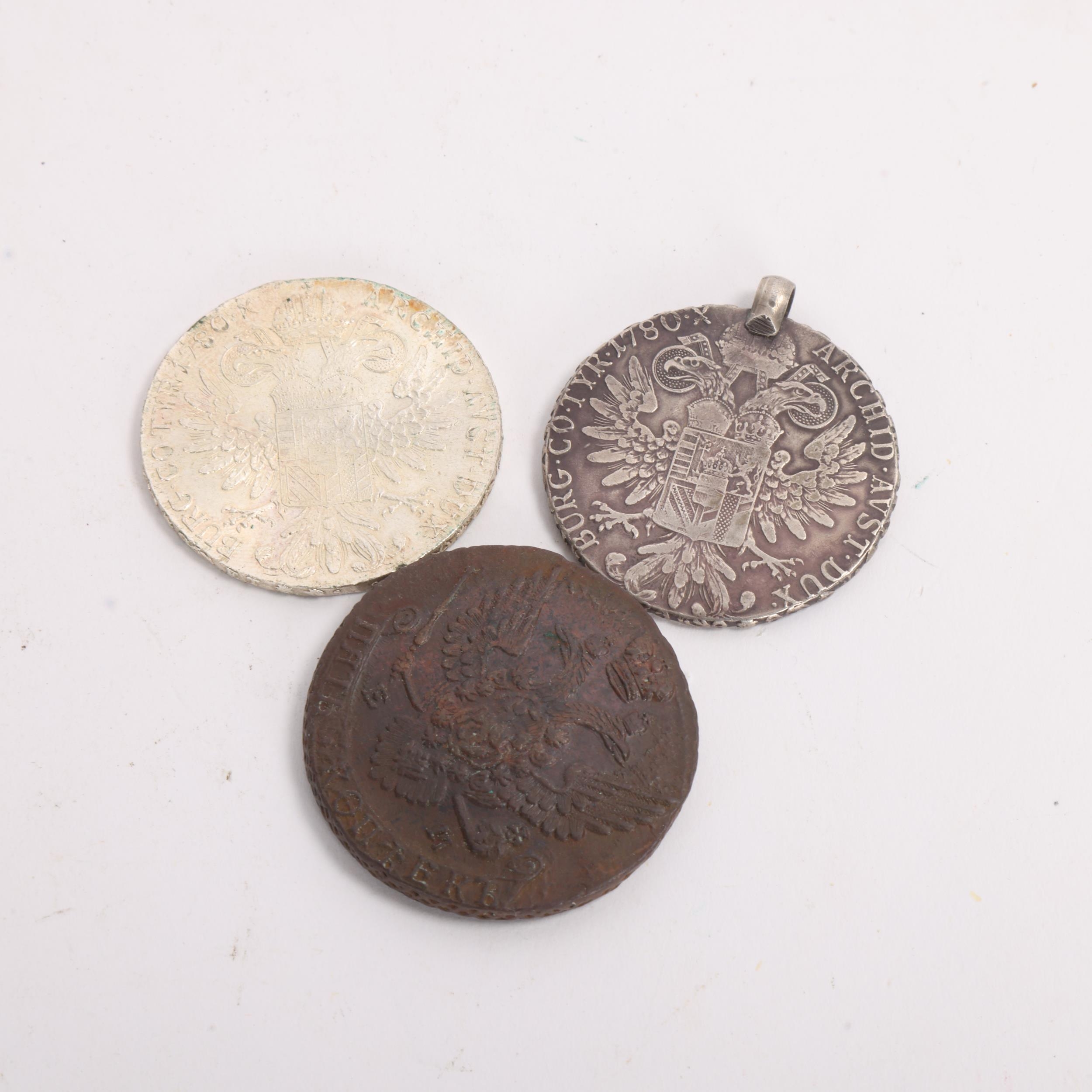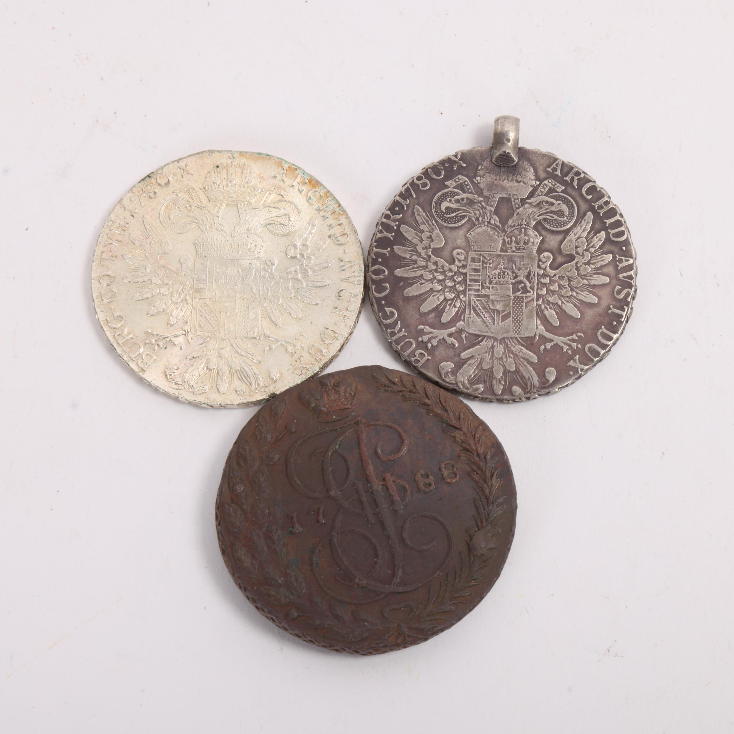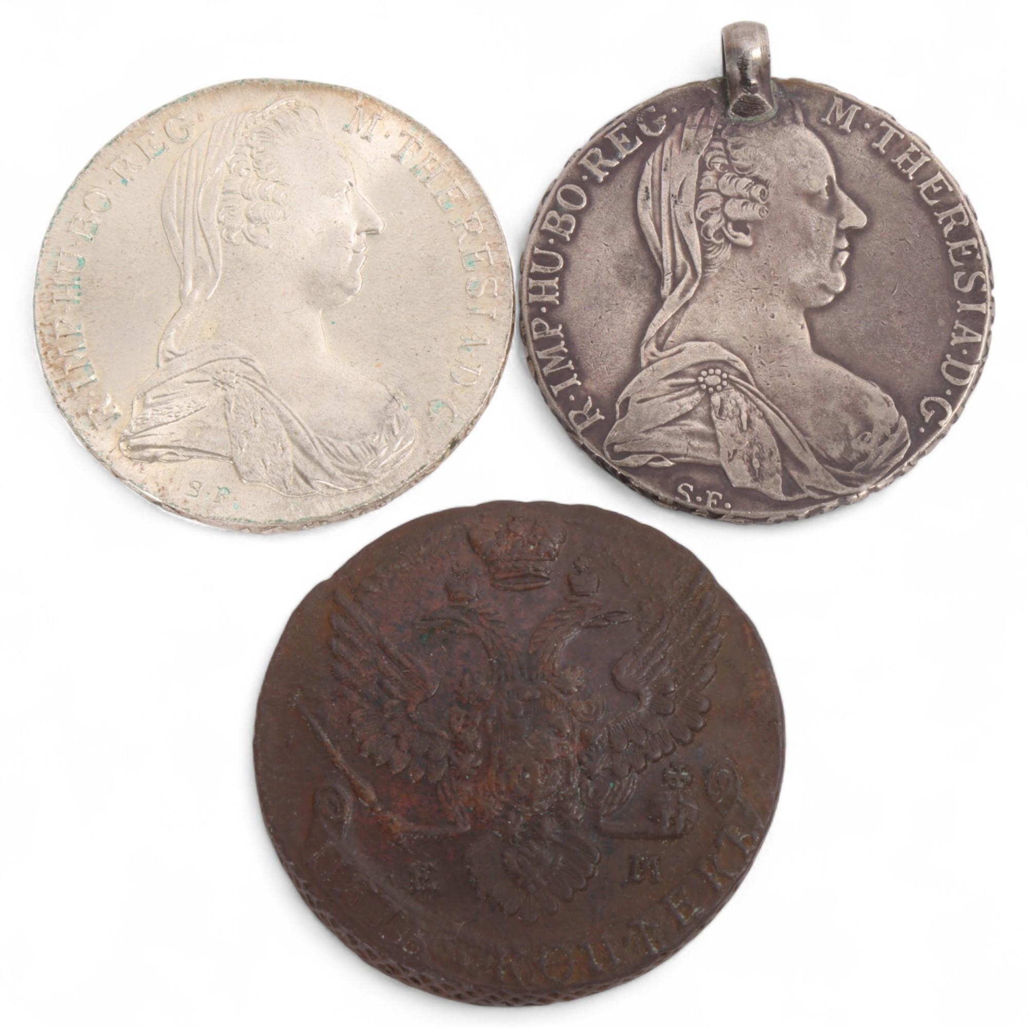 2 Maria Thaler silver coins, both dated 1780, one pendant mounted, dia 40.5, overall weight 56.6 grams and a 5 Russian Kopeks 1788, dia 42mm (3)