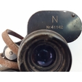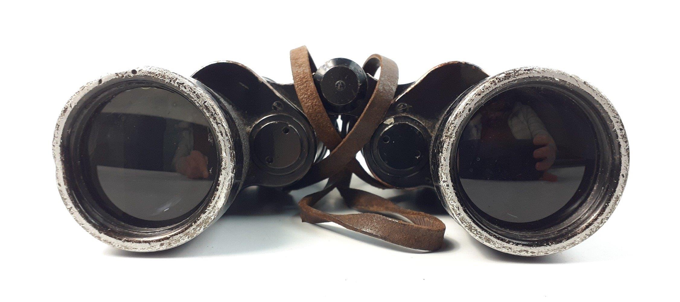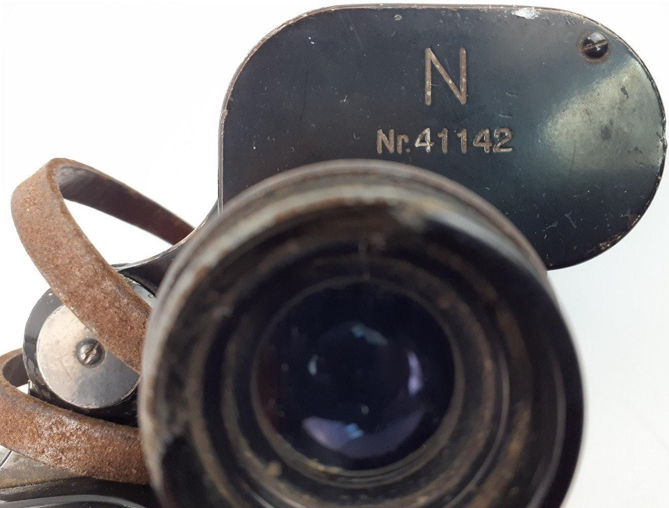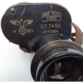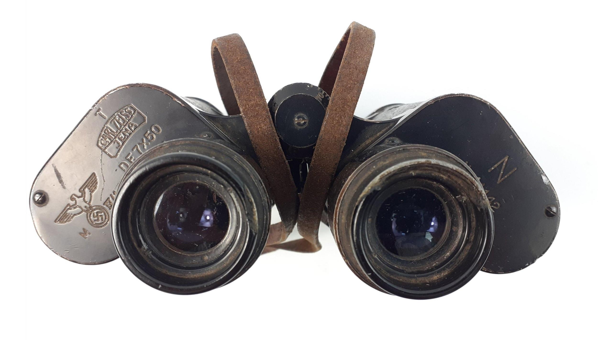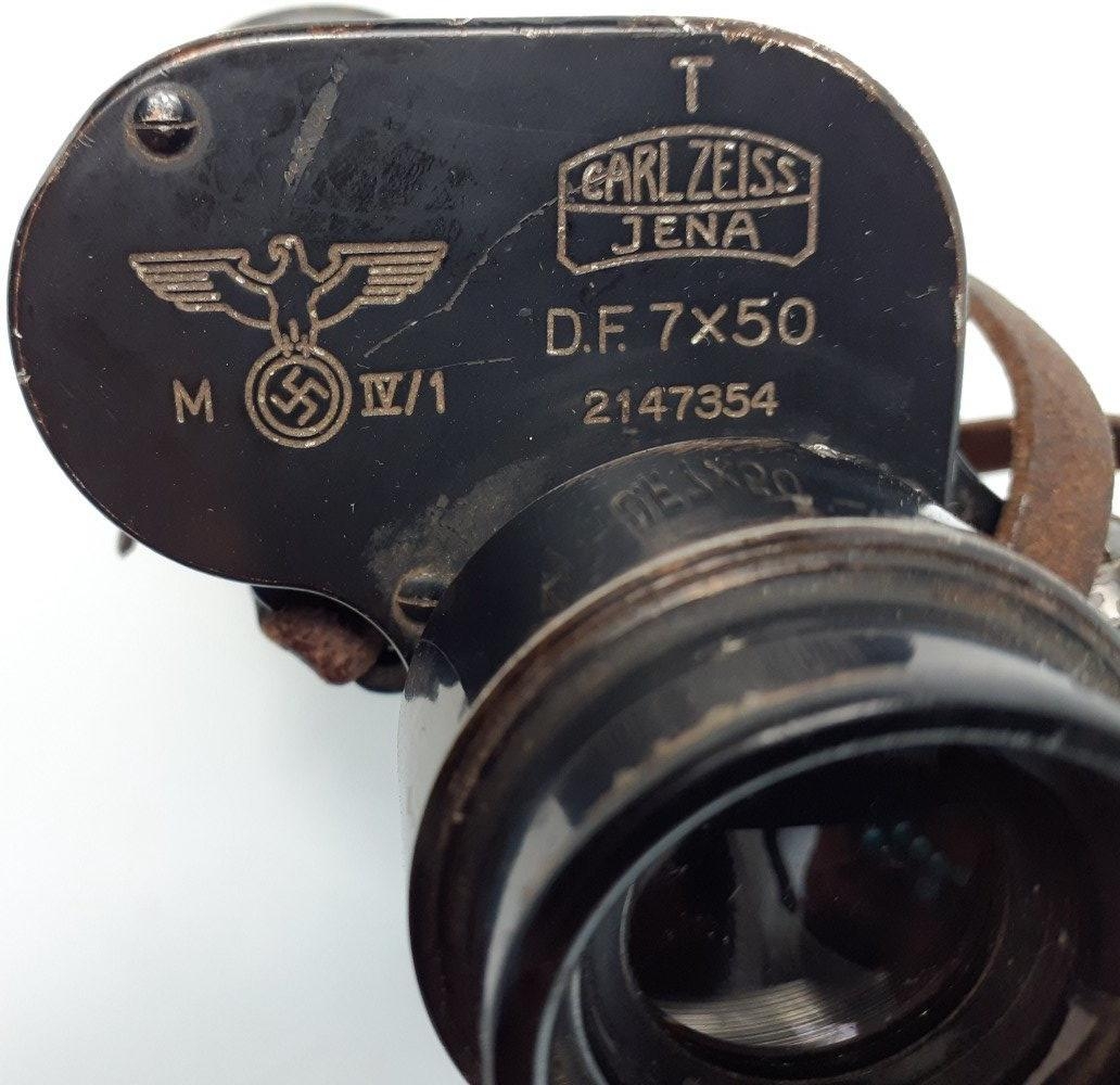 A pair of WWII Carl Zeiss Jena 7x50 Kreigsmarine M IV/I binoculars with Eagle and Swastika marks. Serial number Nr.41142. According to the vendor her father acquired these from a downed German bomber in the North Berwick area of East Lothian and were used ever since by the family for watching birds in the garden. Optically good, strap appears original. One eyepiece cracked otherwise in excellent condition.